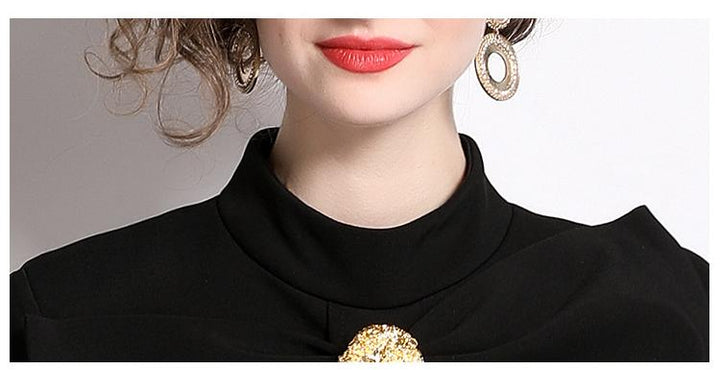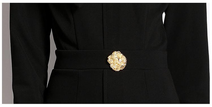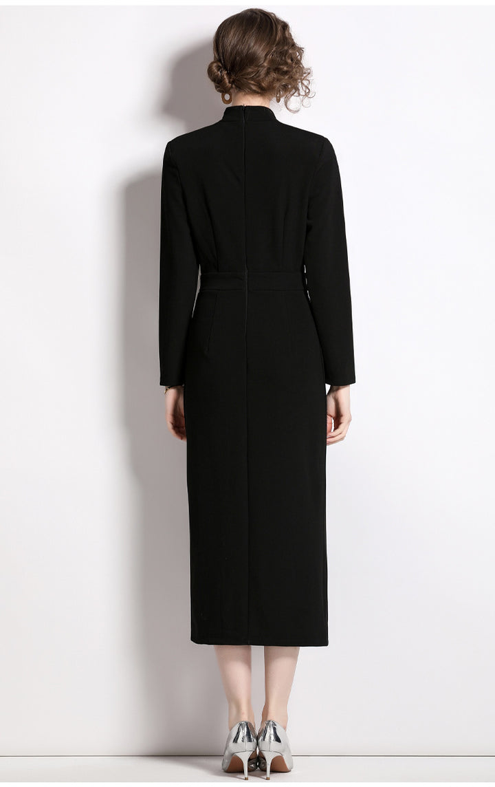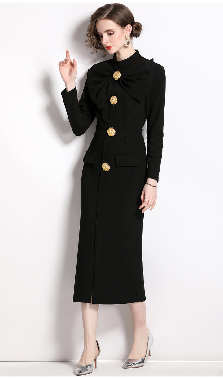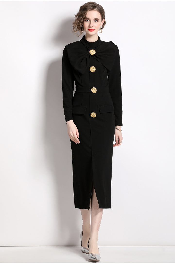 Bow Collar Long Sleeve Tucked Waist Buttons Dress