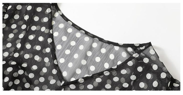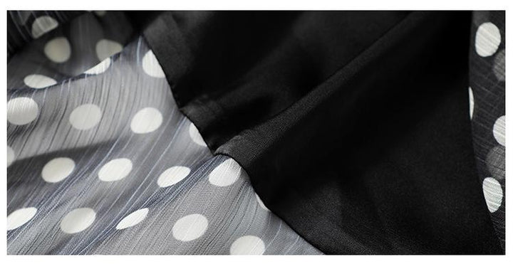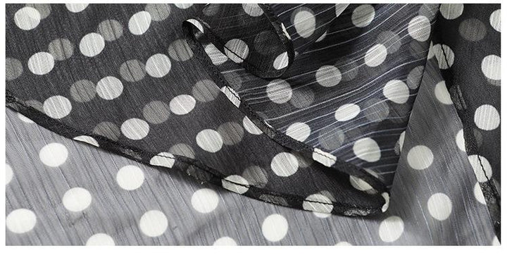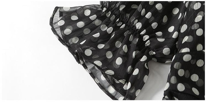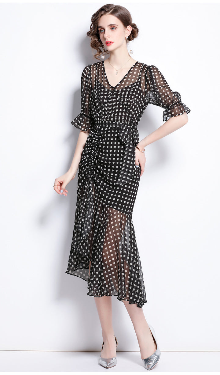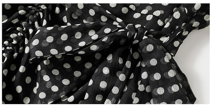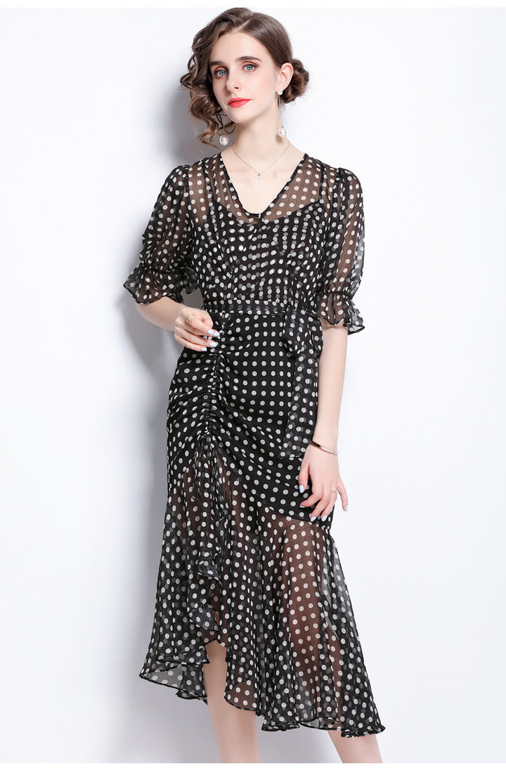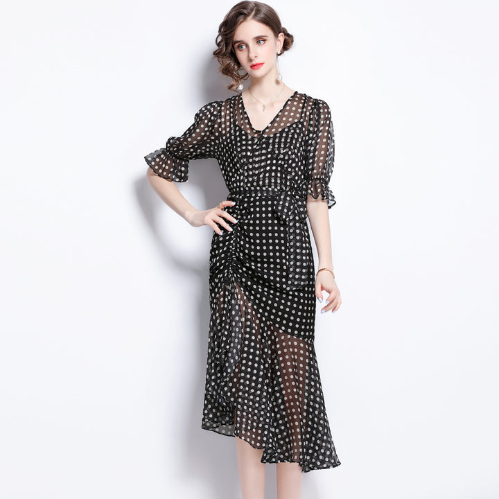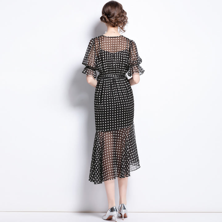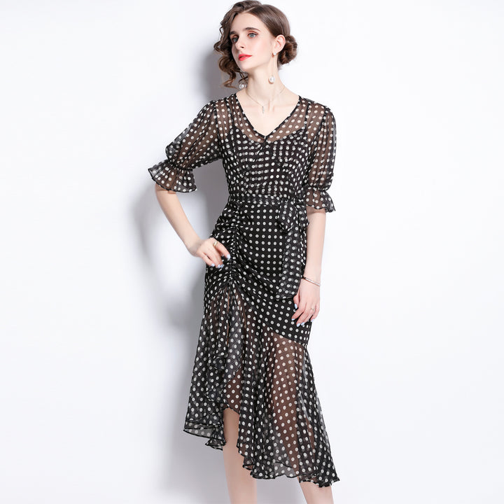V-neck Lantern Sleeve Irregular Hem Polka Dot Dress