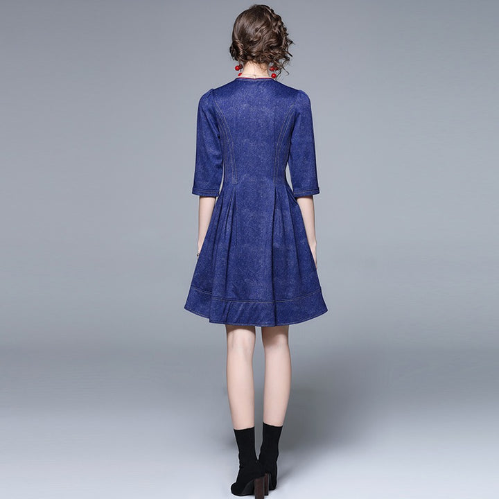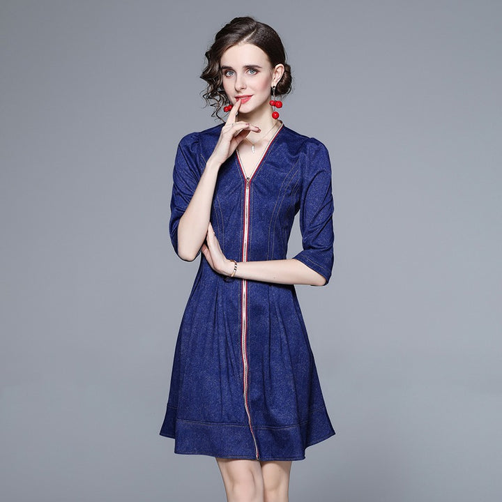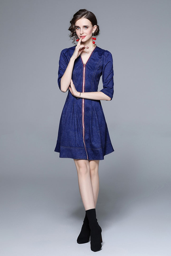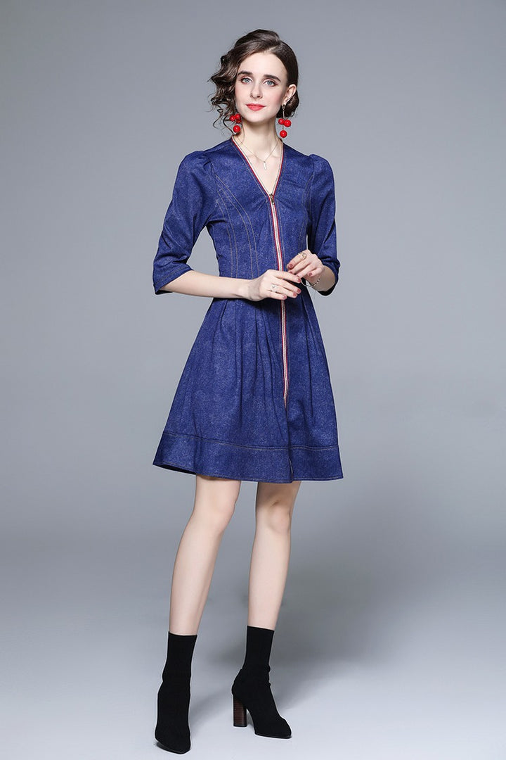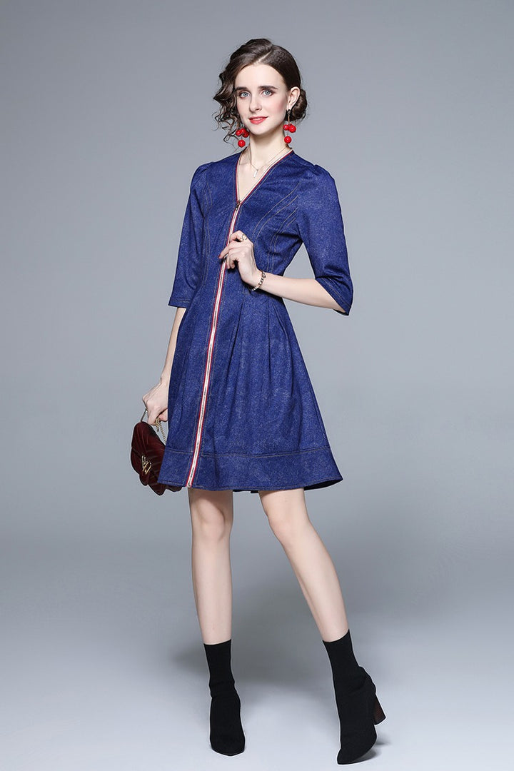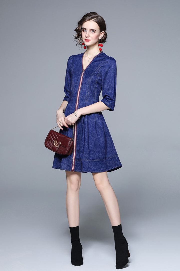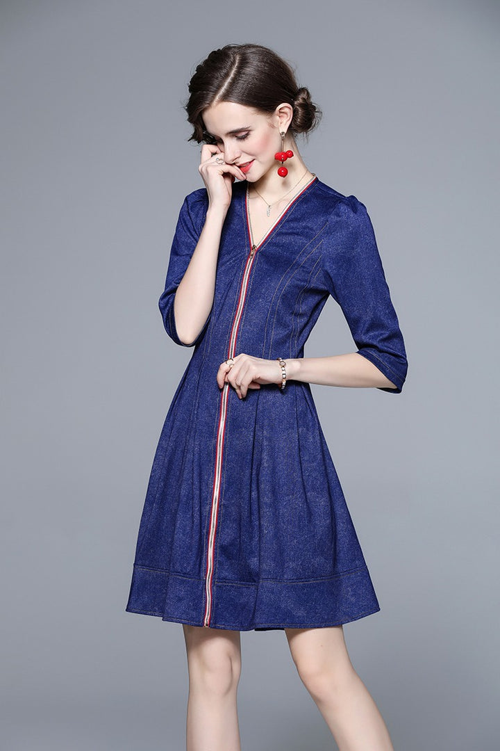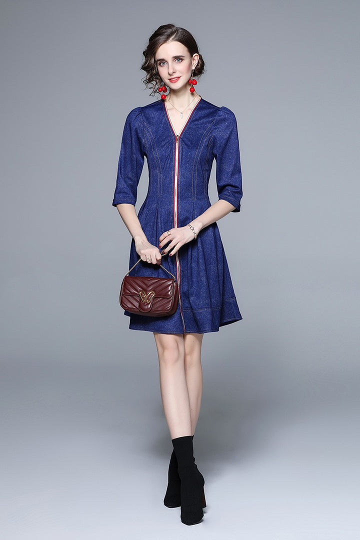 Middle Sleeve Zipper Down Denim Jacquard Dress