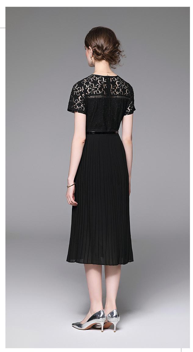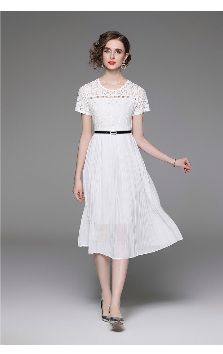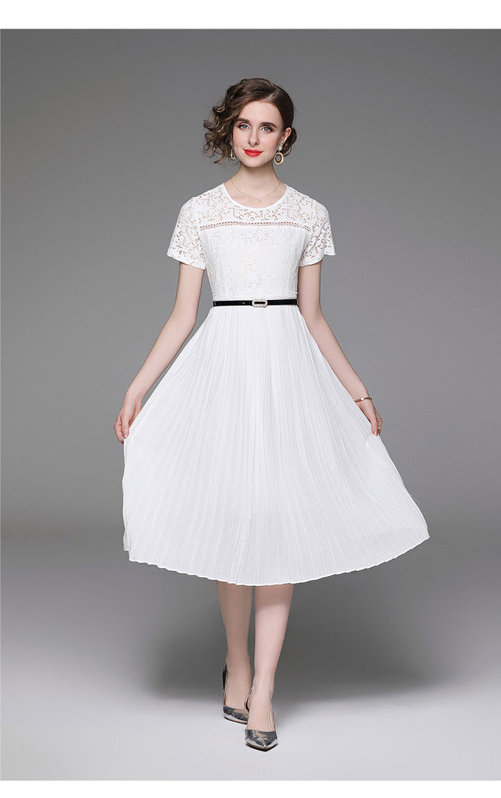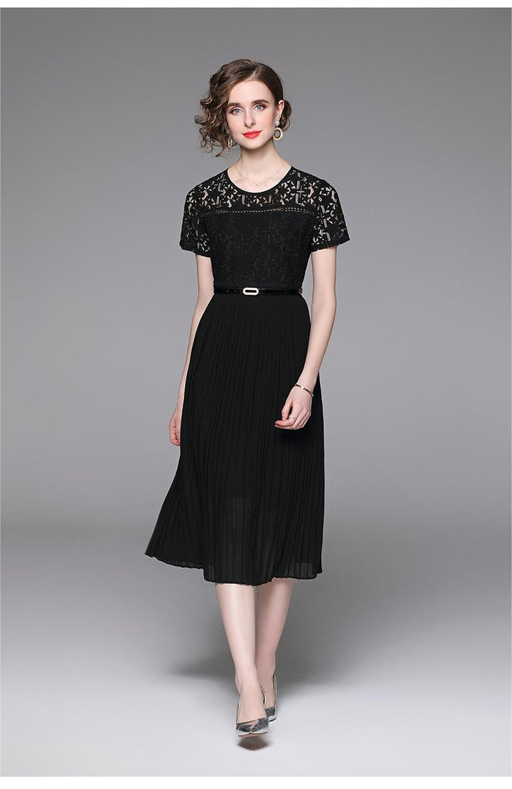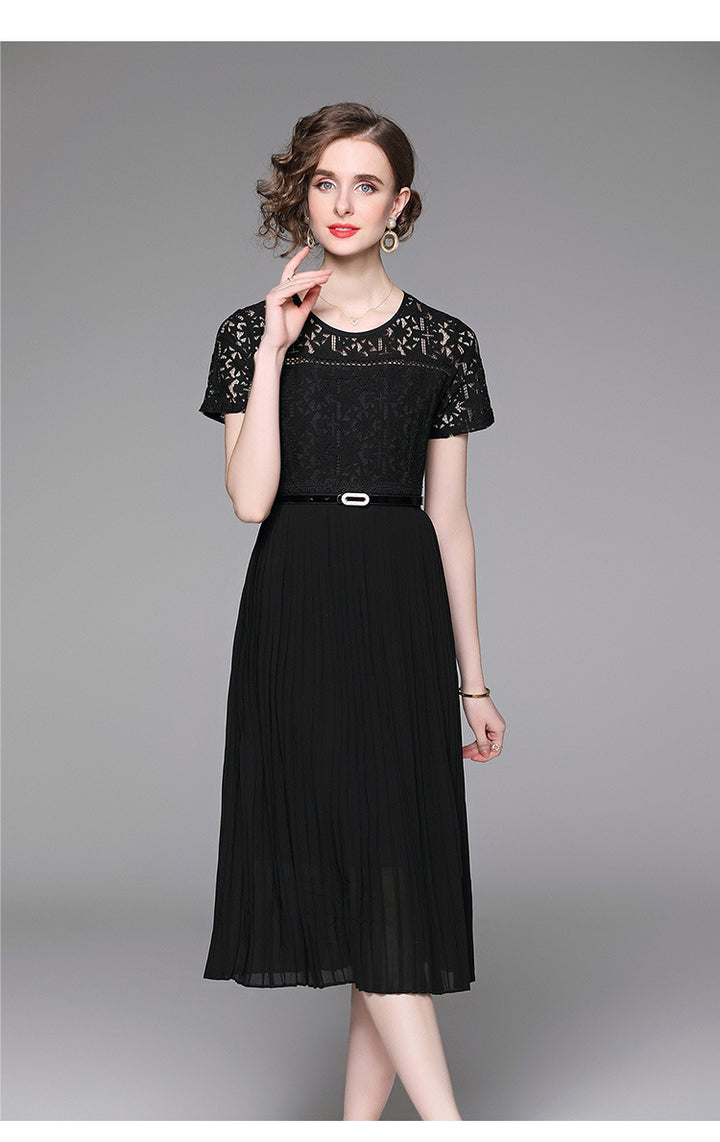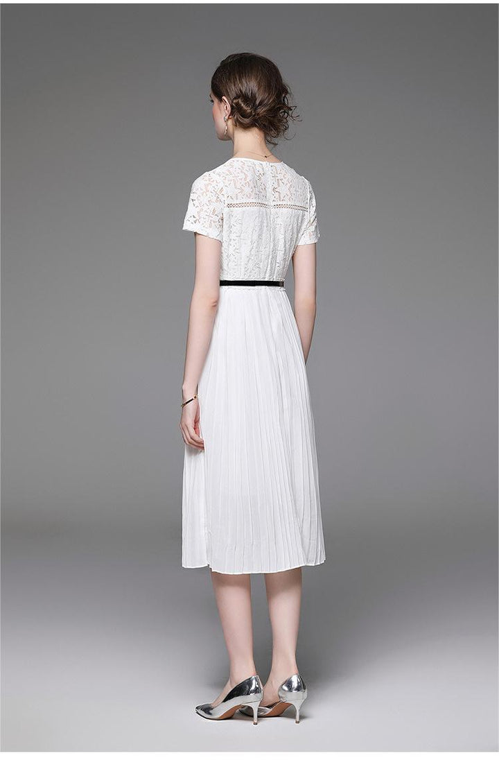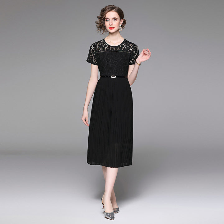 Elegant Crewneck Short Sleeve Lace Patchwork Pleated Dress