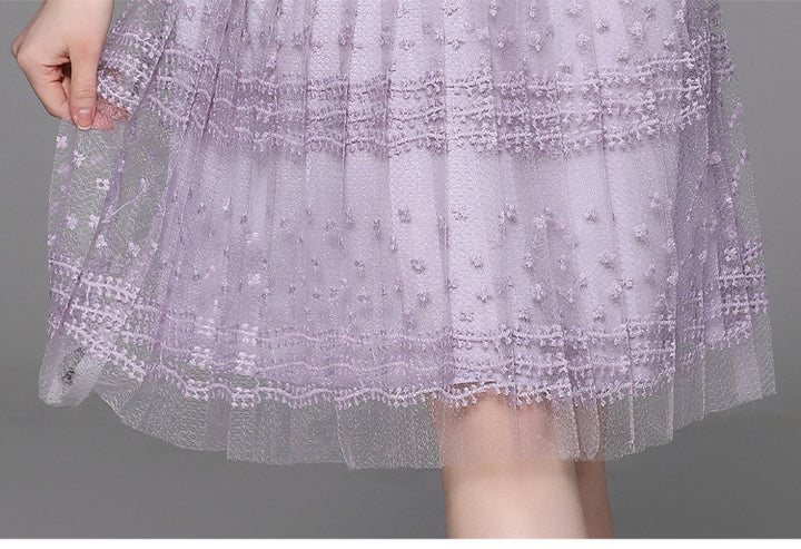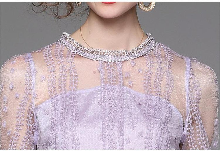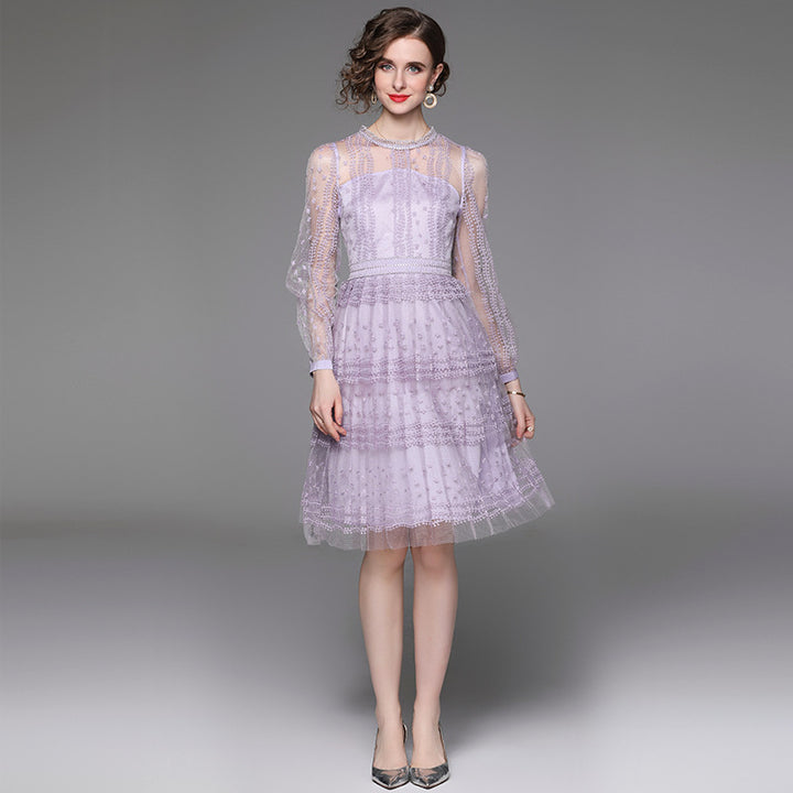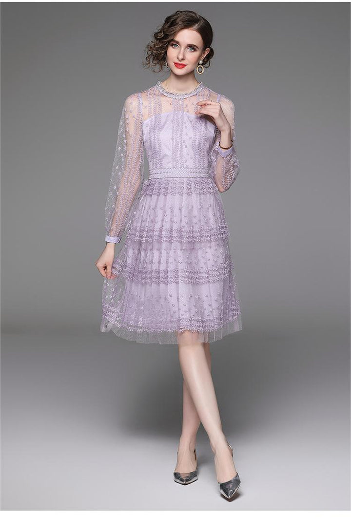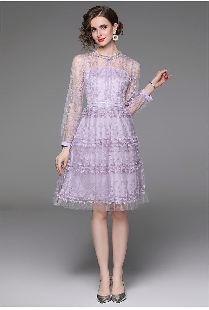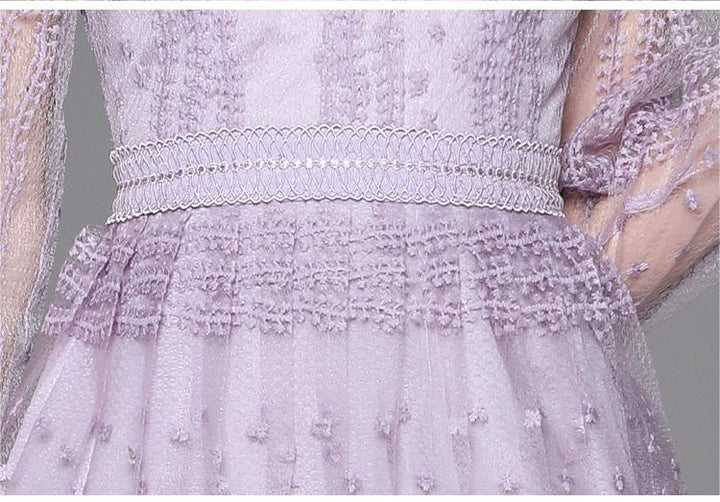 Purple Patchwork Mesh Embroidered Long Sleeve Dress
