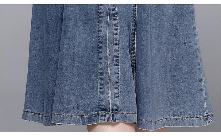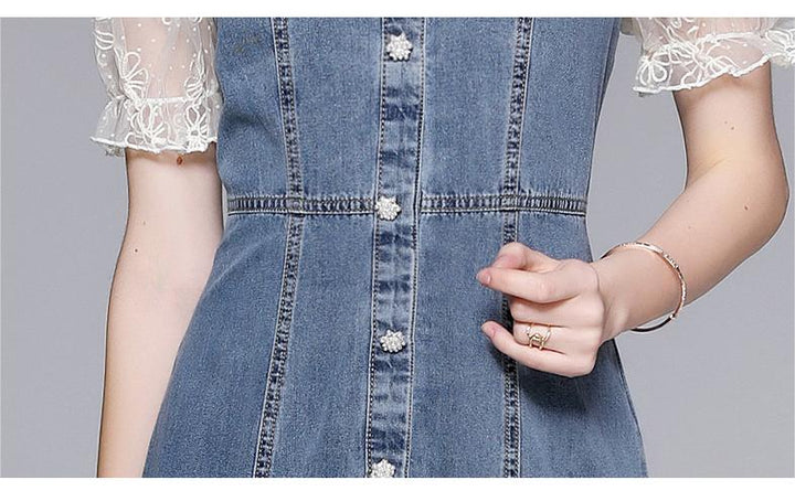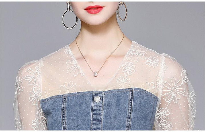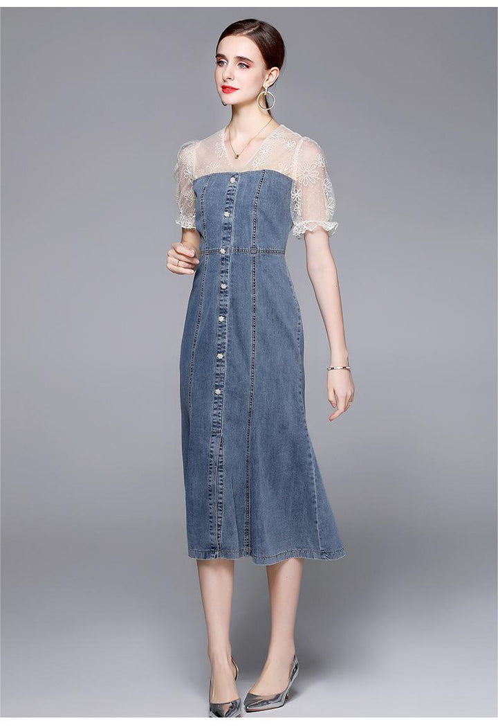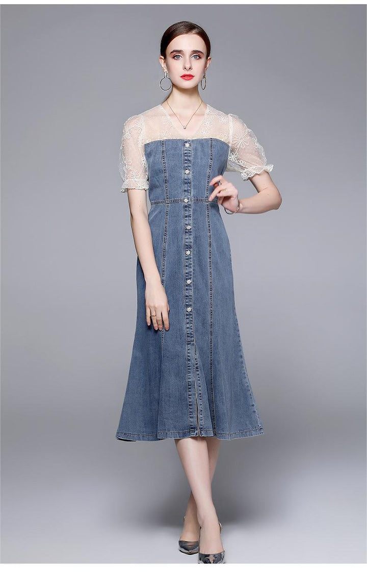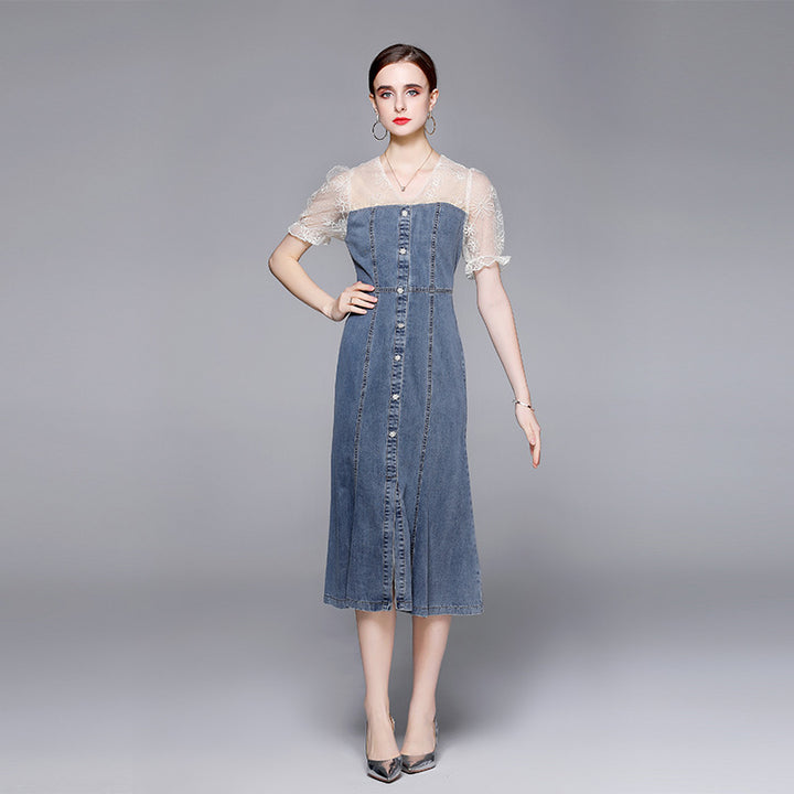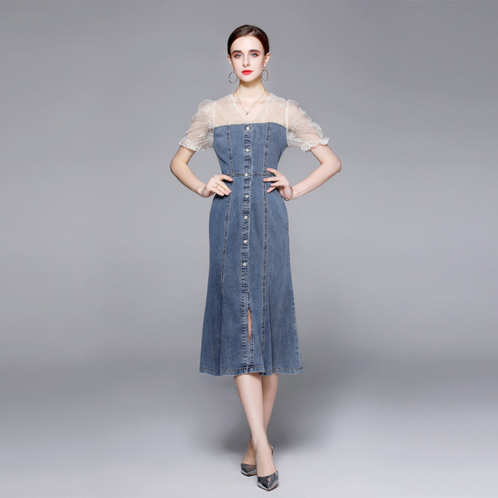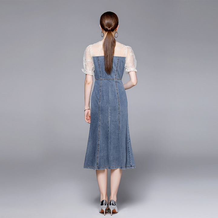 Embroidered Mesh Stitching Denim Slim Waist Slit Fishtail Swing Dress