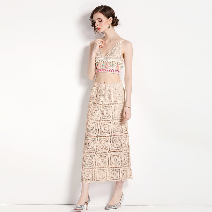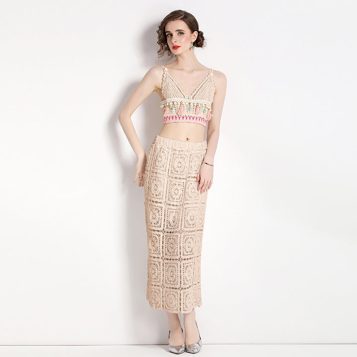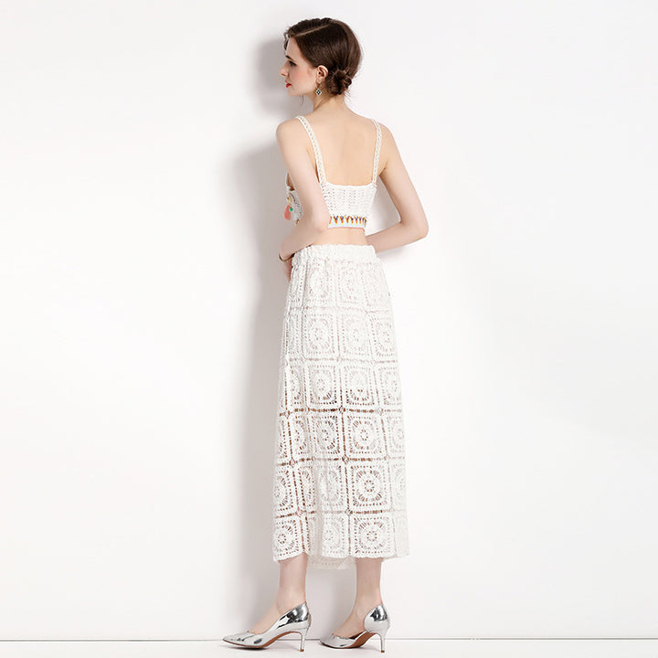 Embroidery Hollowed Out V-Neck Short Style Suspender Top + Bag Hip Half Skirt Two-Piece Suit