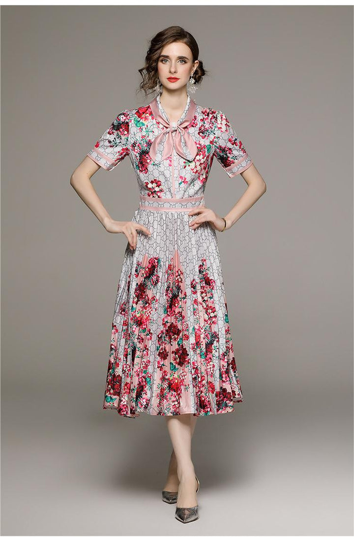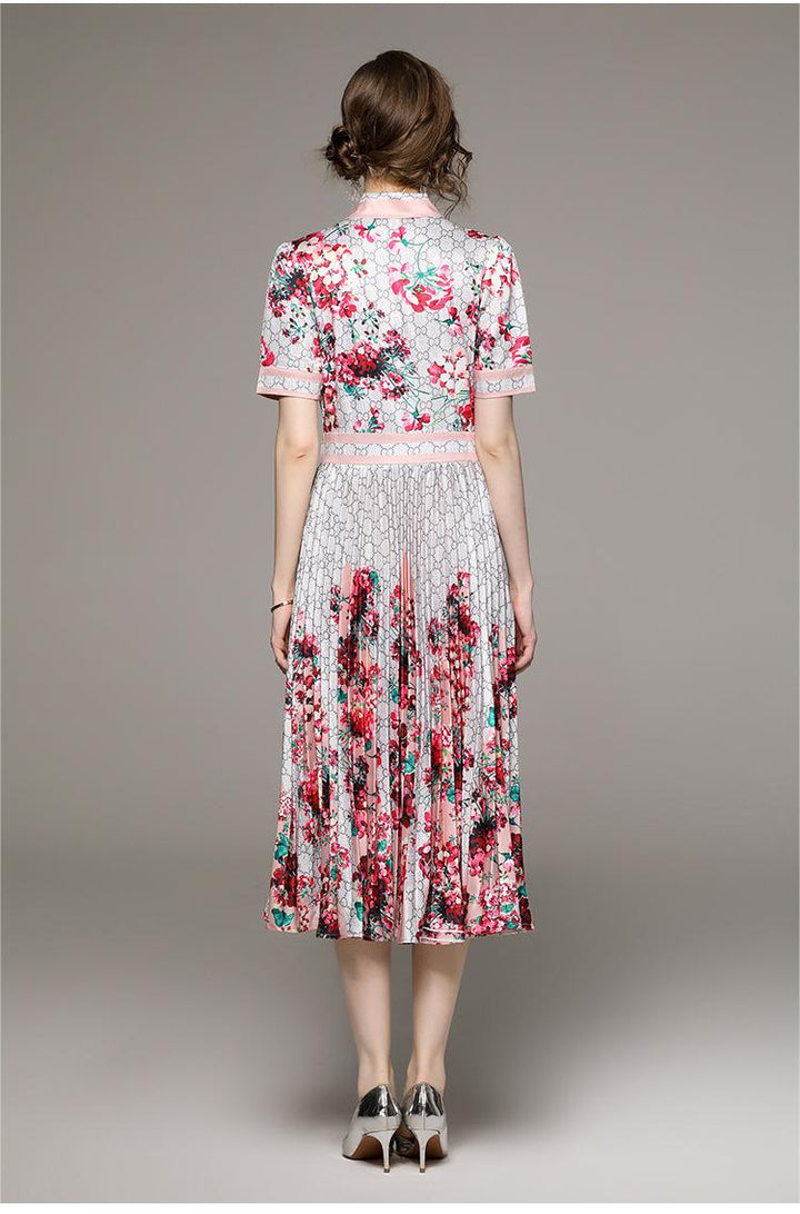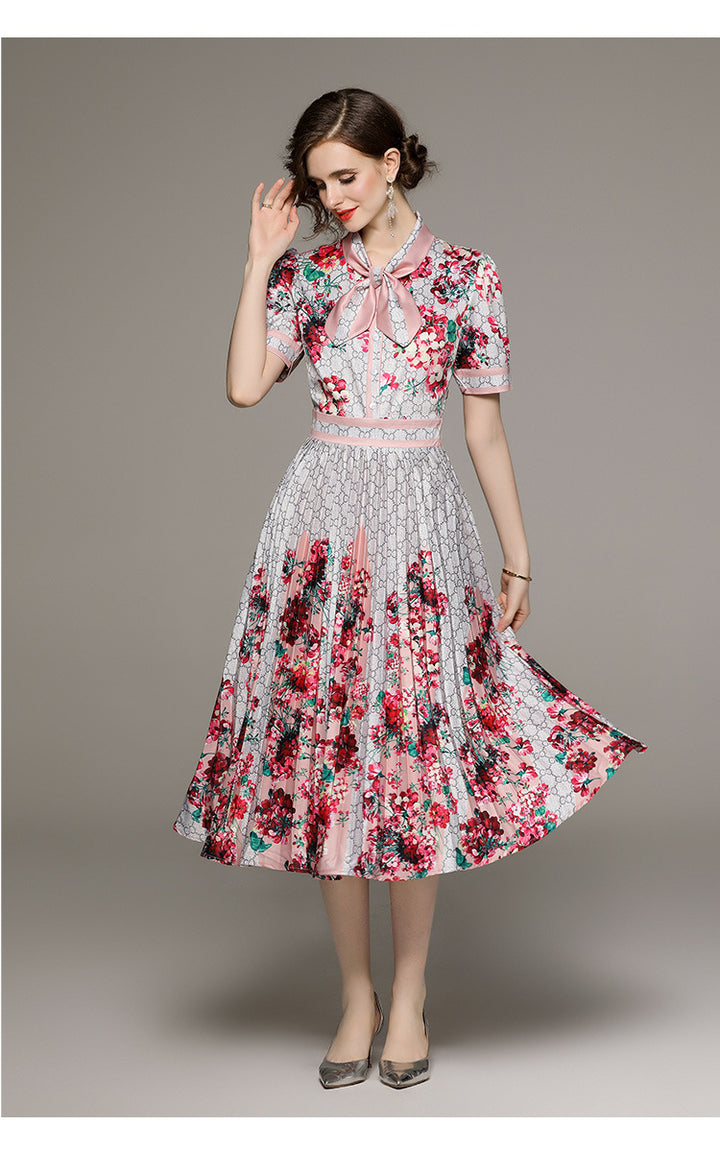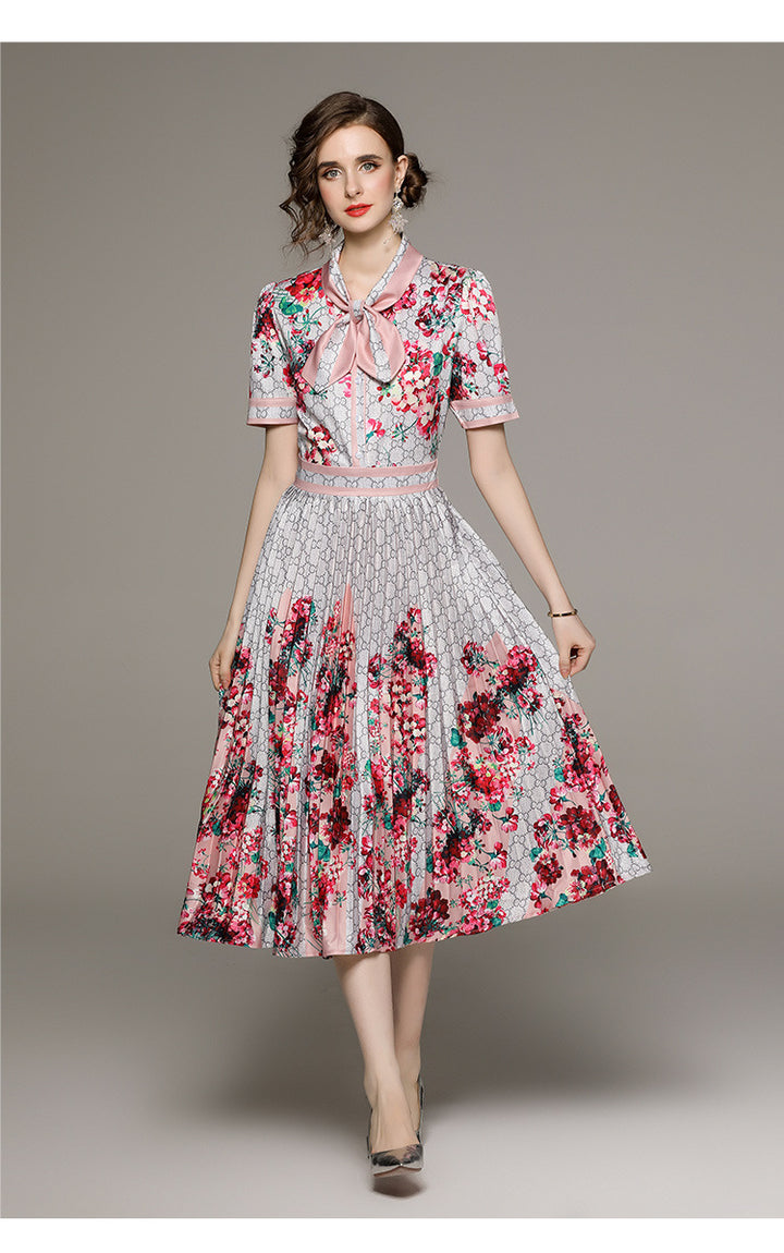 Fashion All-in-one Folded Waist Slimming Positioning Printed Short Sleeve Pleated Dress