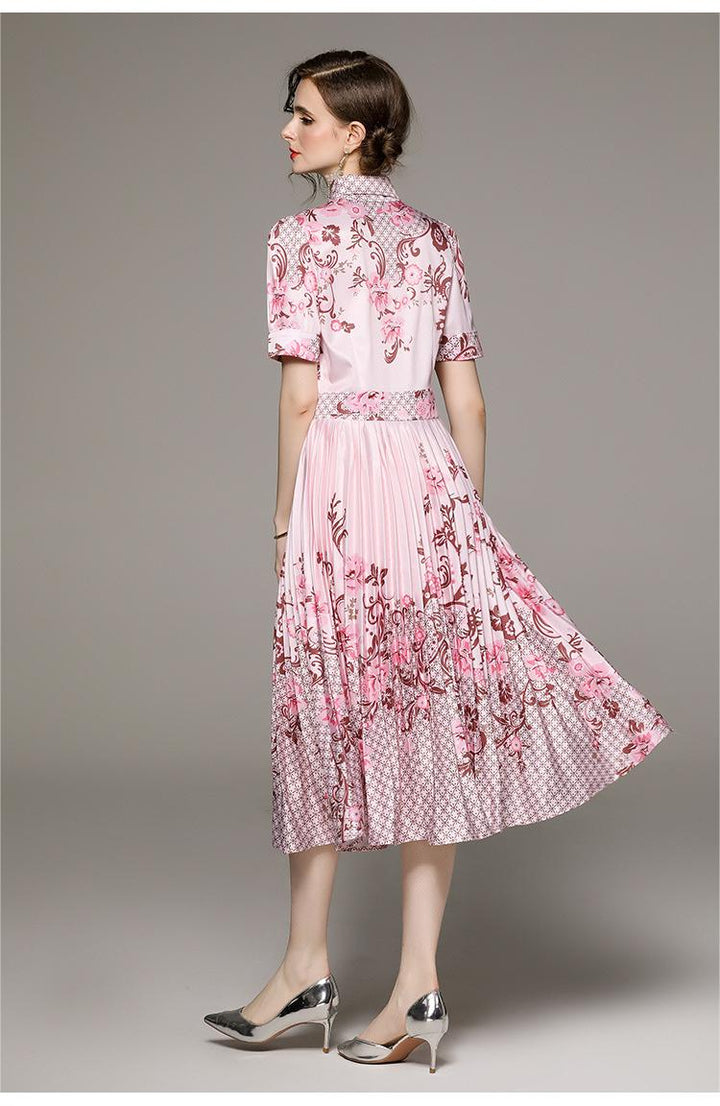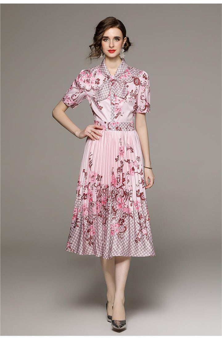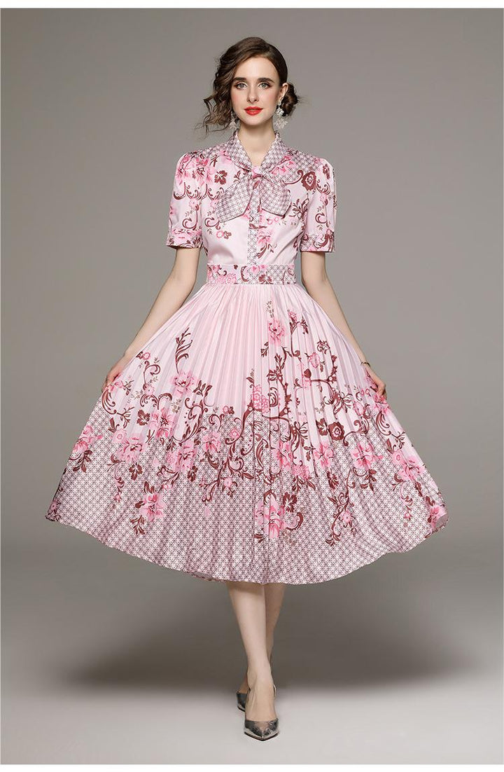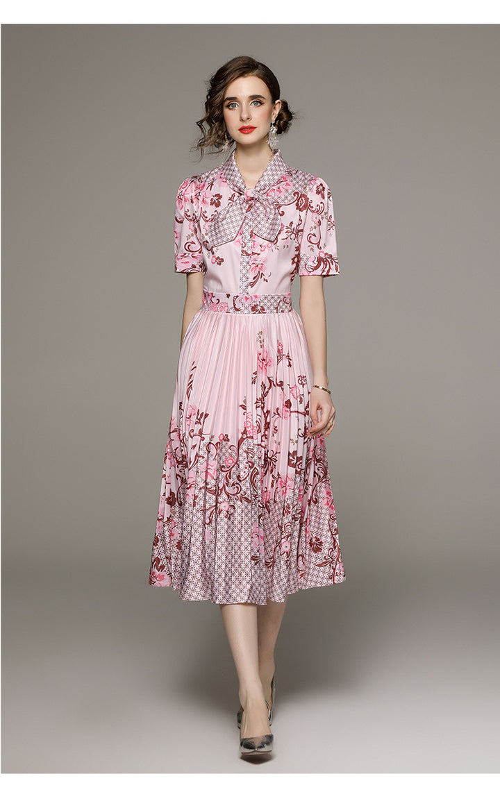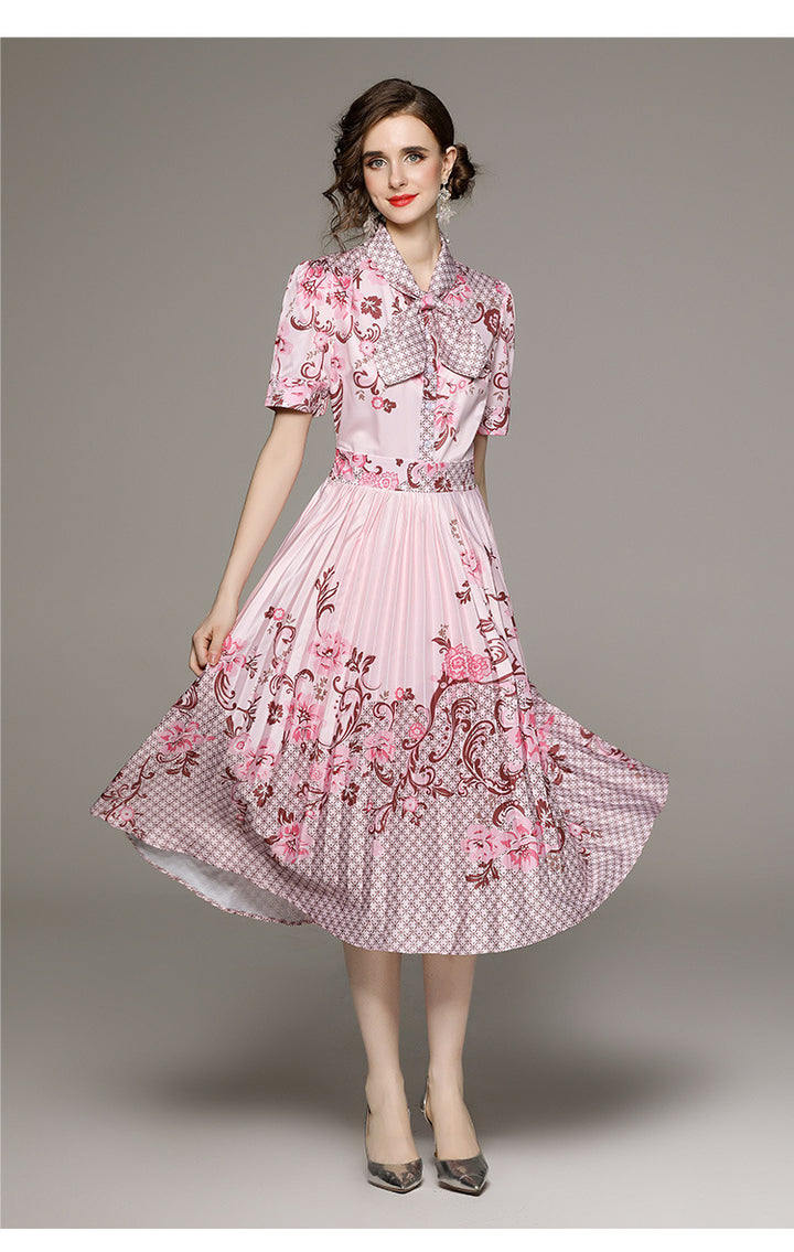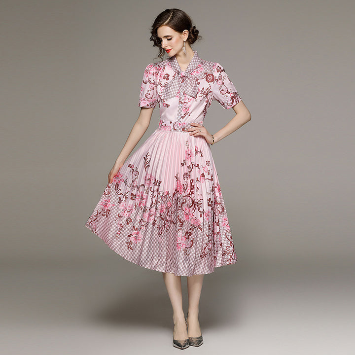 Fashion All-in-one Folded Waist Slimming Positioning Printed Short Sleeve Pleated Dress