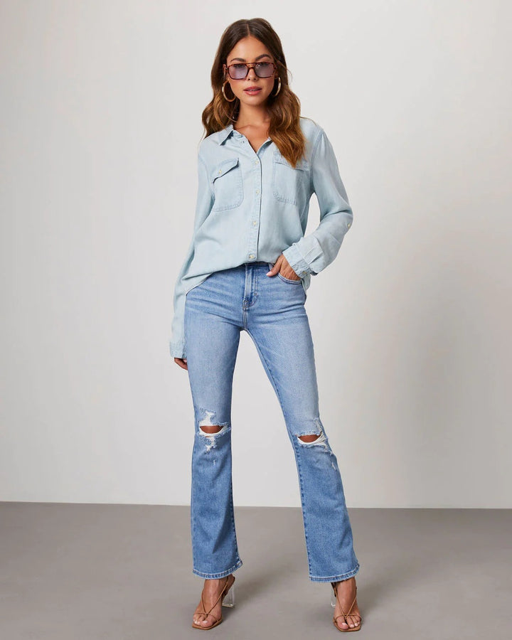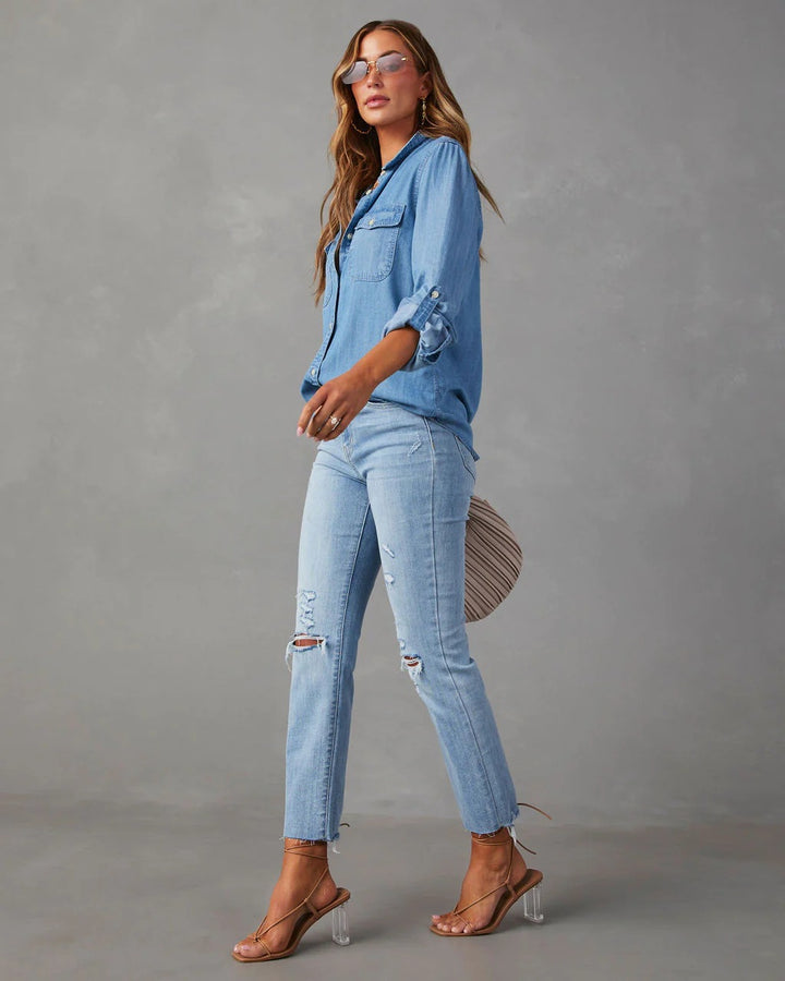 Fashion Casual Versatile Loose Polo-Neck Long Sleeve Denim Blouse for Women