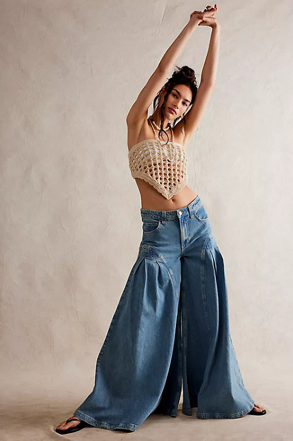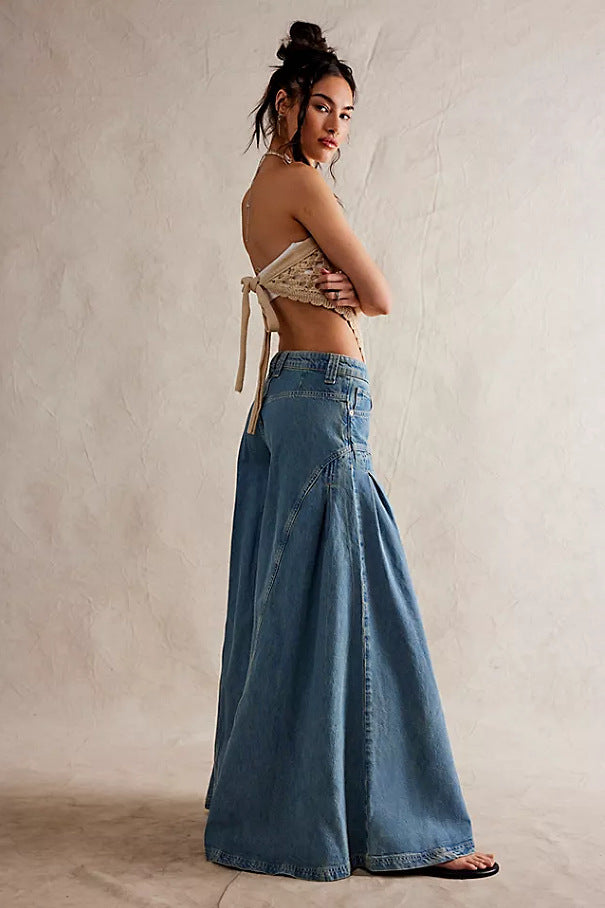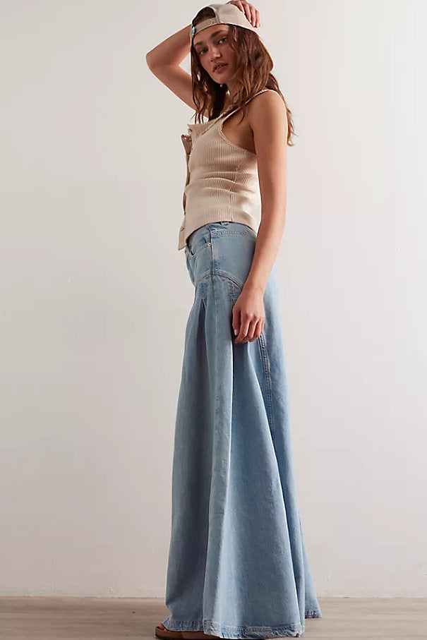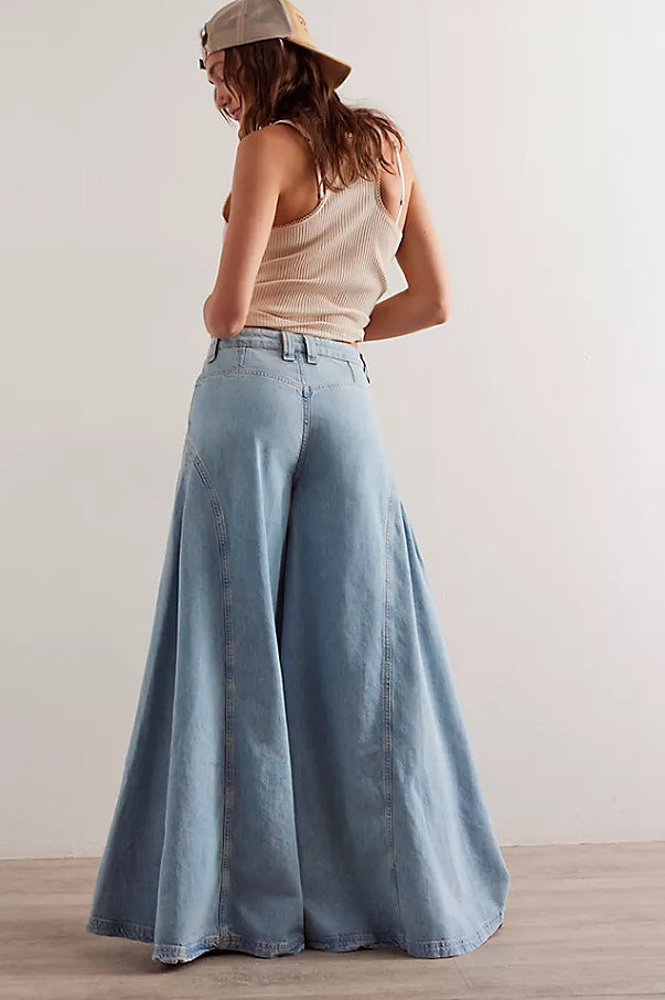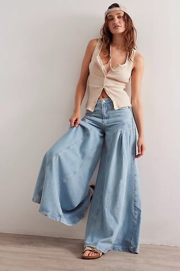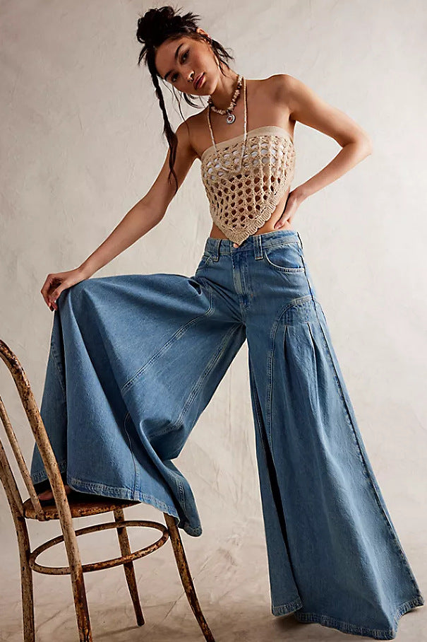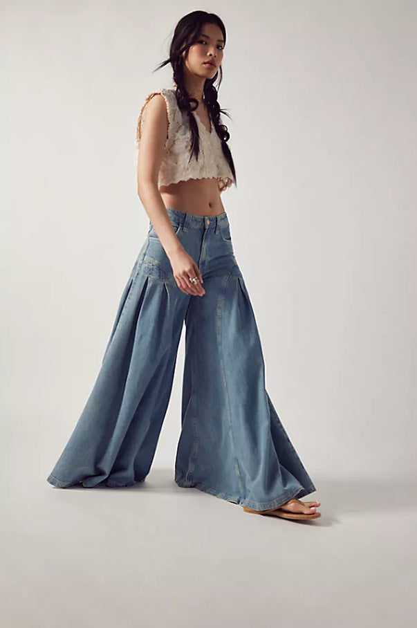 Fashion Casual Vintage-Style Middle-Waist Wide-Leg Denim Pant for Women
