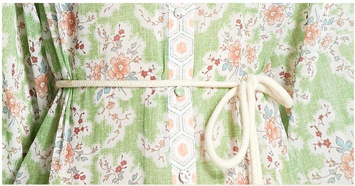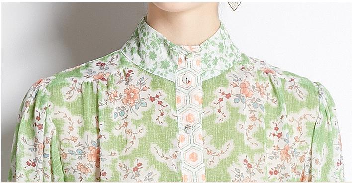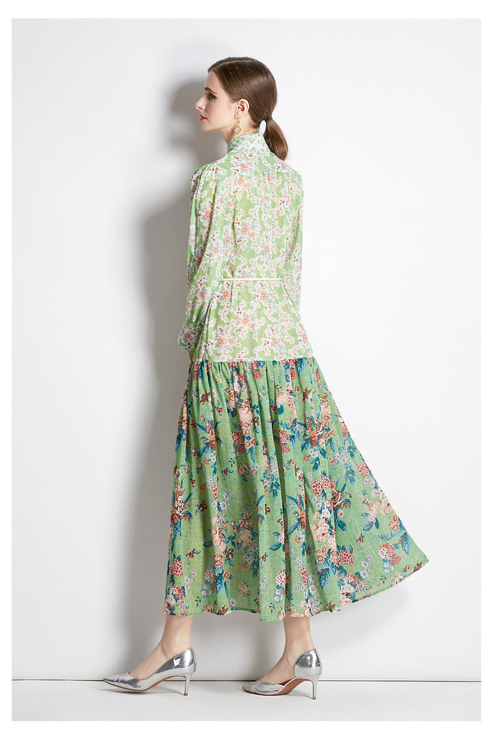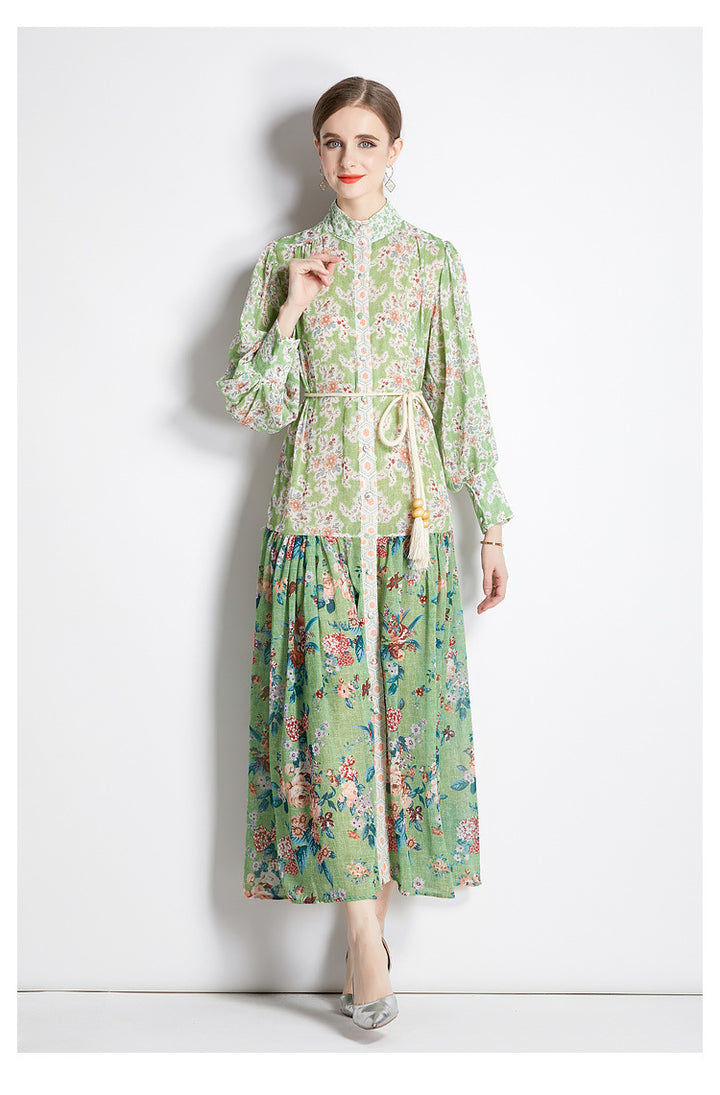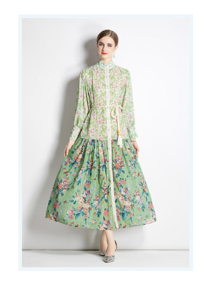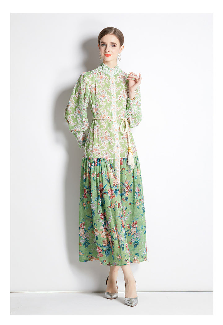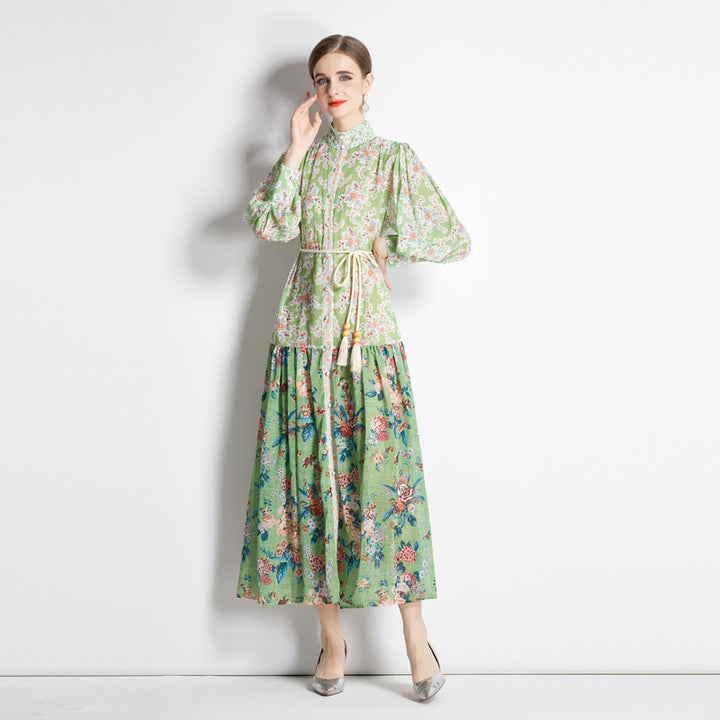 Fashion National Style Retro Stand-up Collar Lantern Sleeve Printed Long Skirt Dress