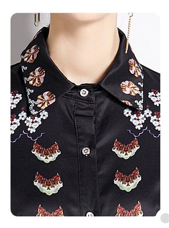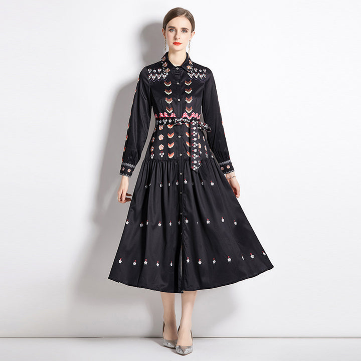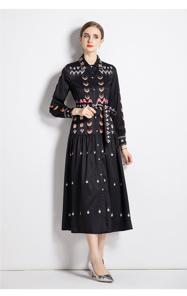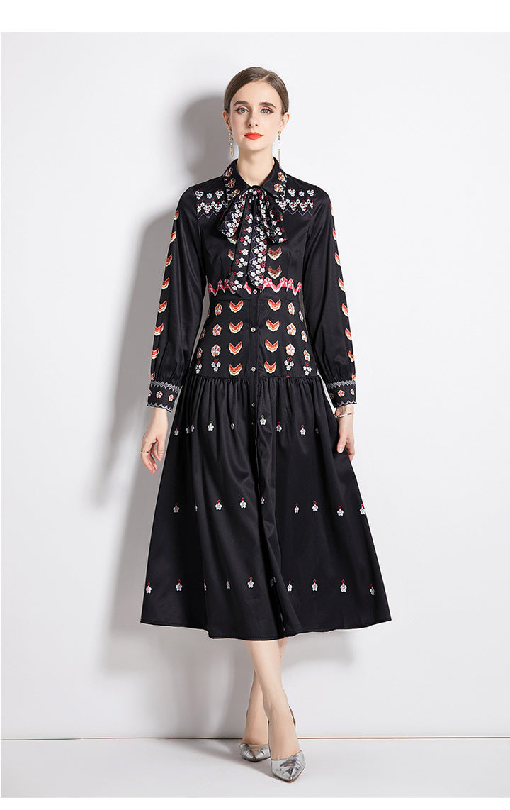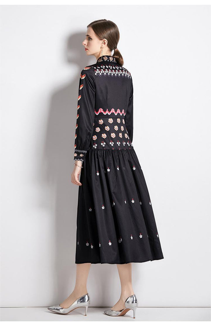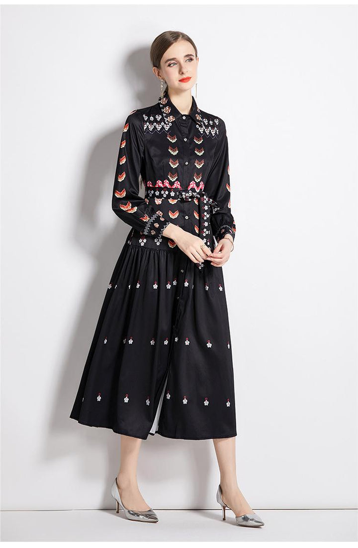 Fashion Print Vintage Lapel Long-Sleeved Slim-Looking Long Skirt Dress