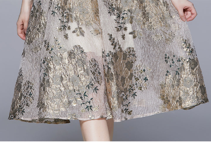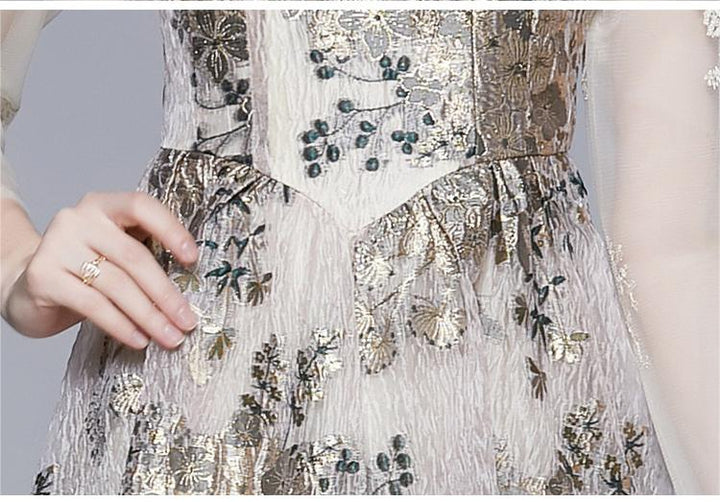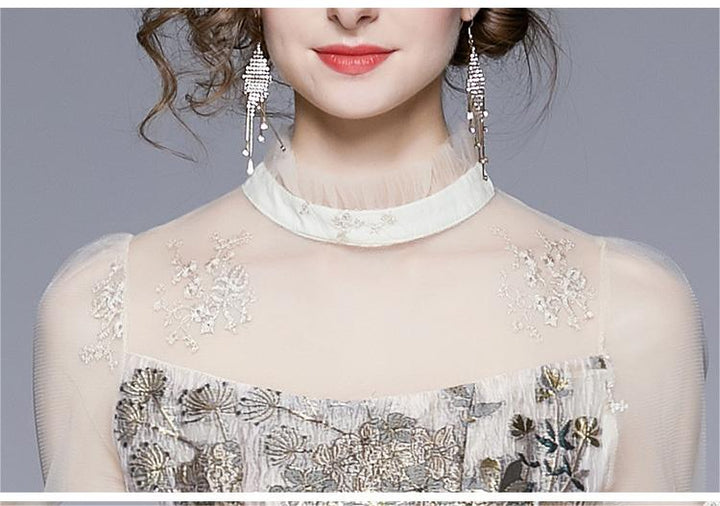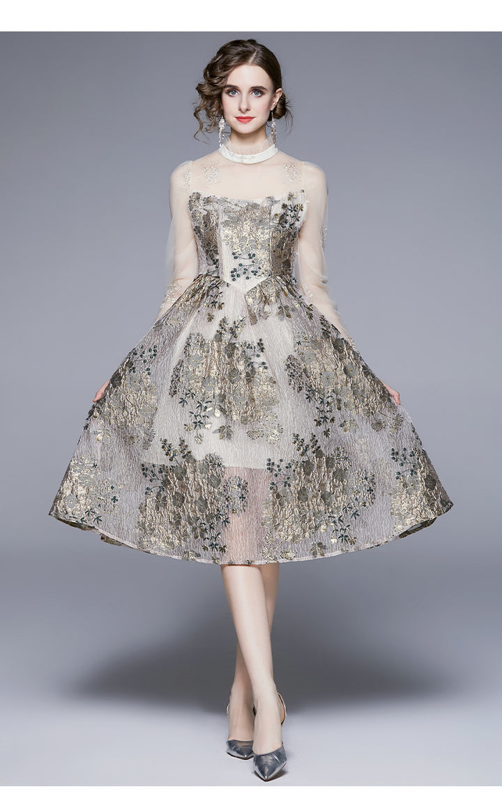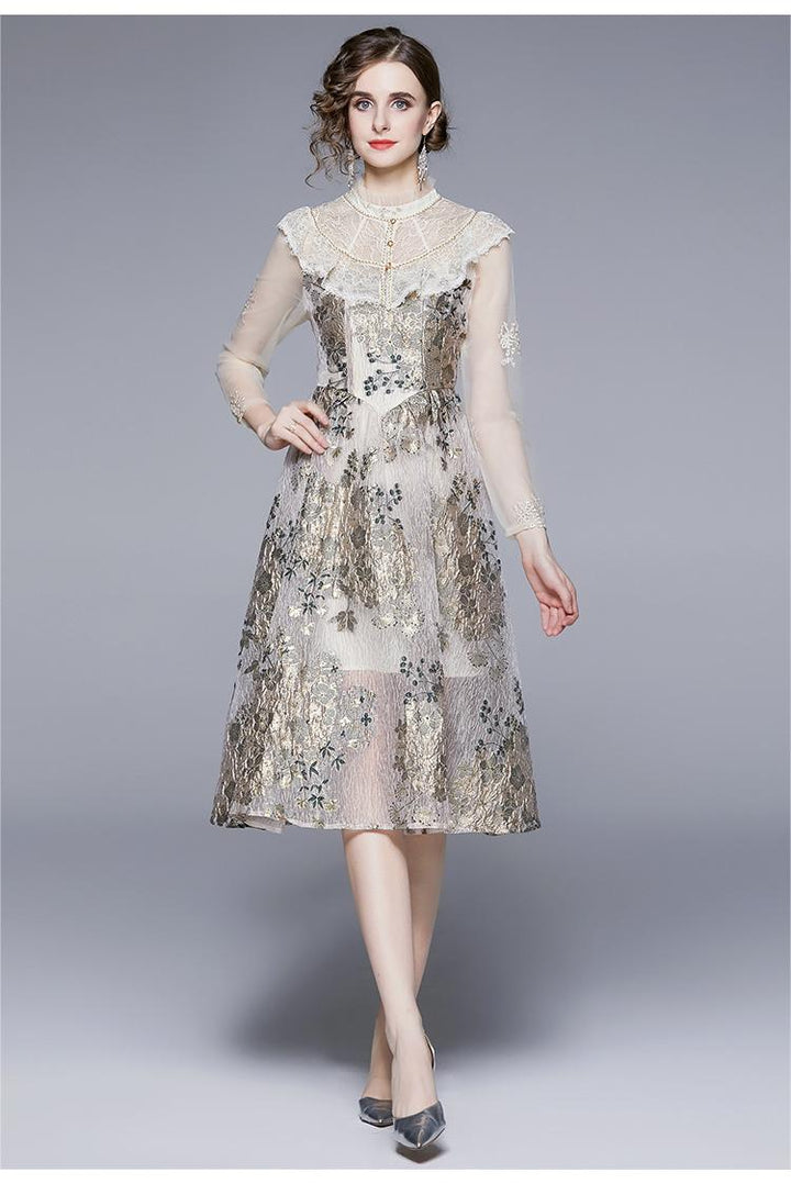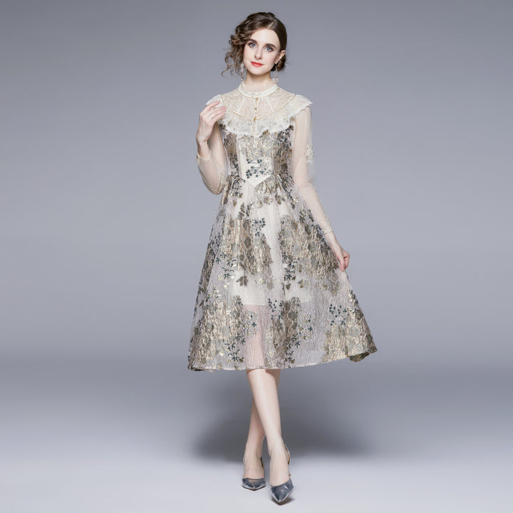 Fashion Retro Long-Sleeved Mesh Stitching Large Swing Mid-Length Dress
