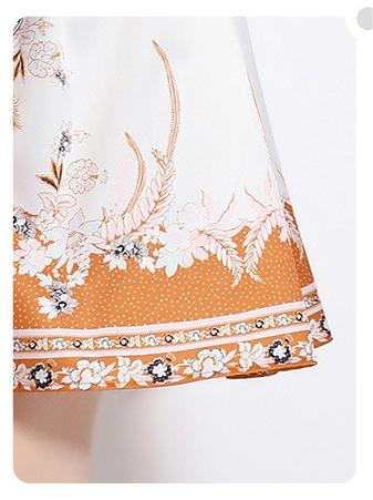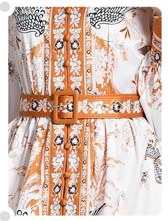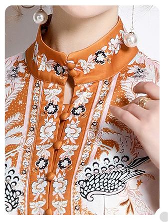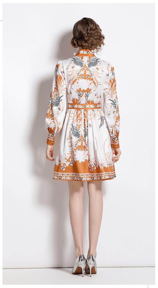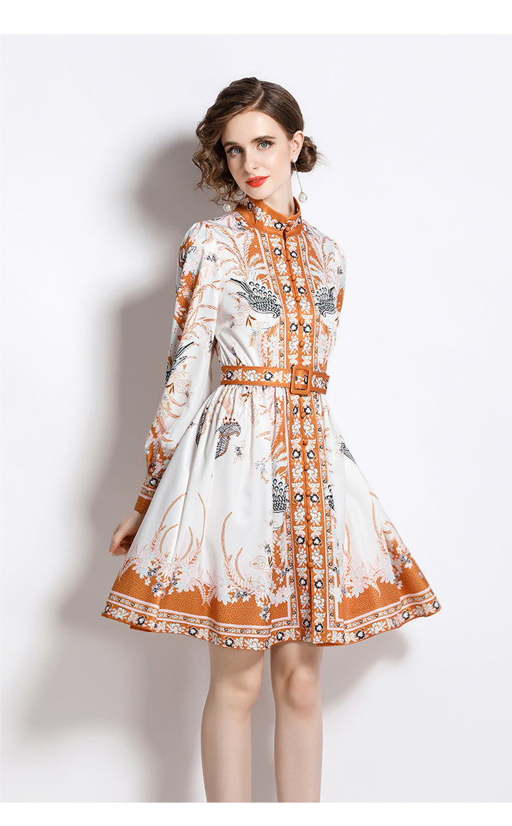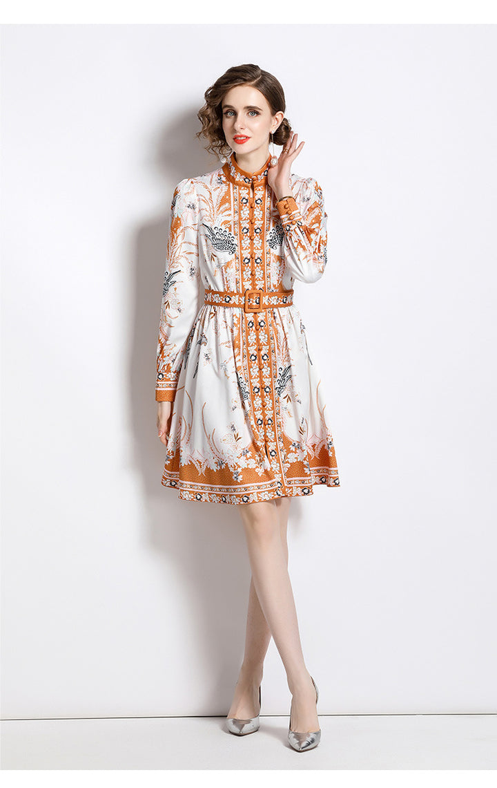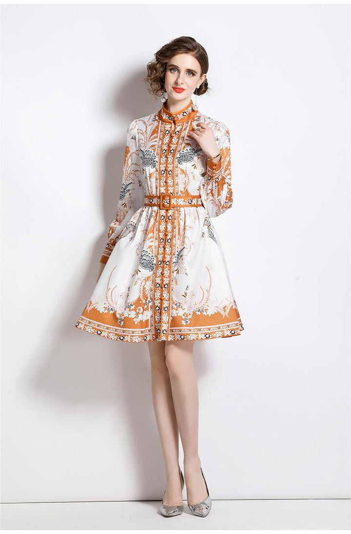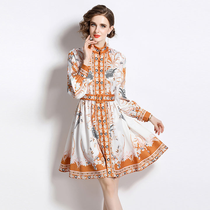 Fashion Vintage Fresh Stand-Up Collar Long-Sleeved Printed Dress