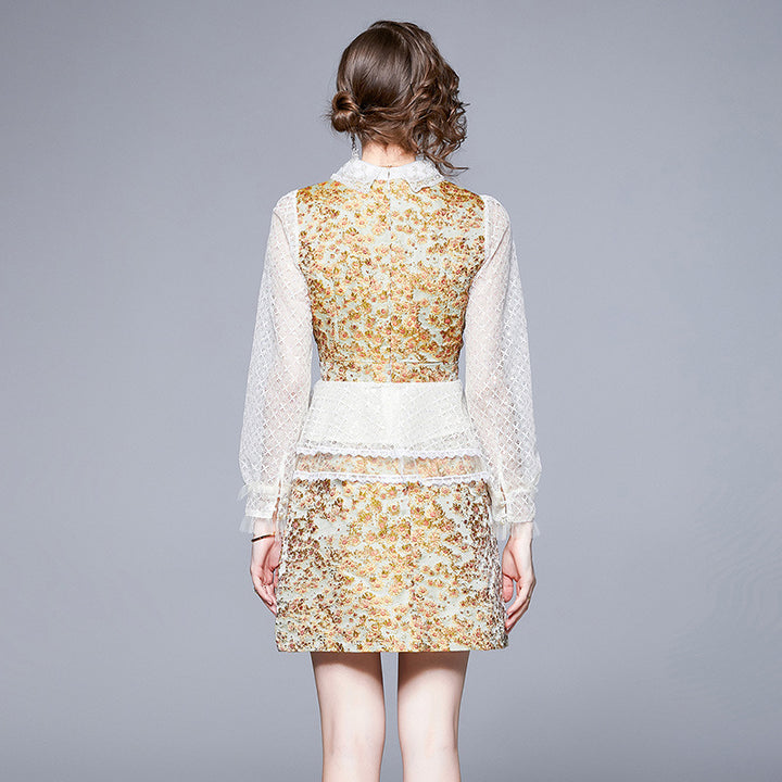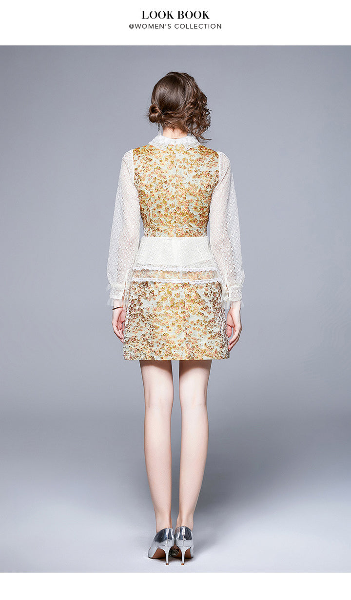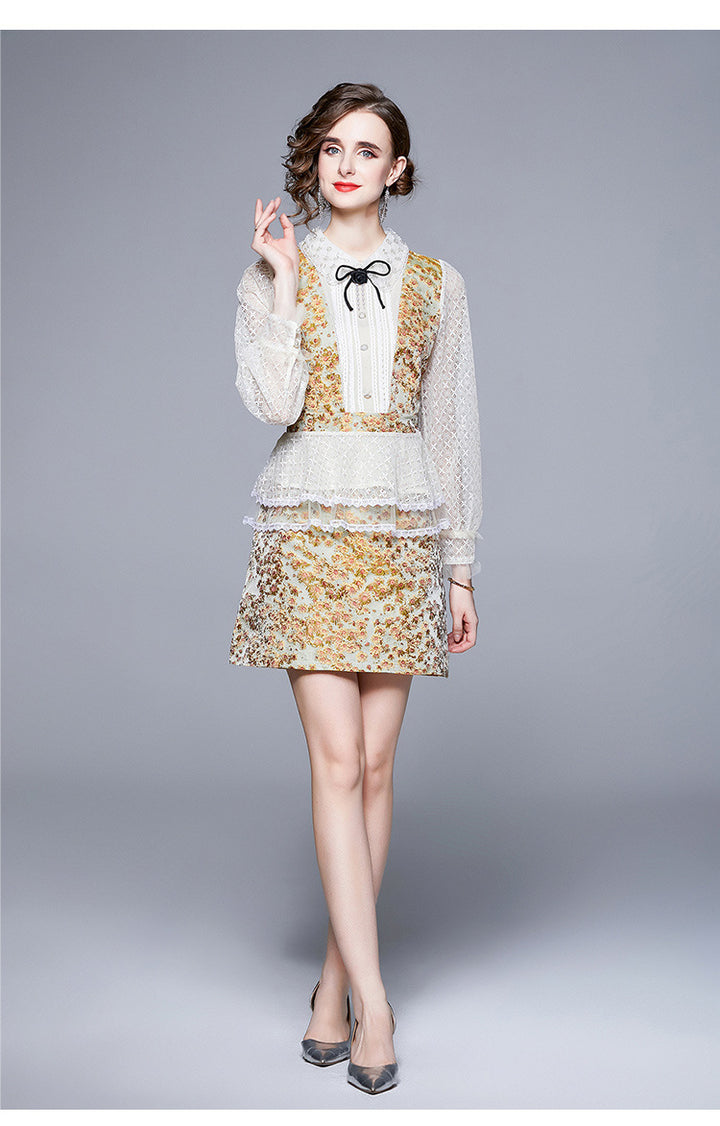 French Retro Palace Long-Sleeved Lace Top + A-Line Short Skirt Two-Piece Set