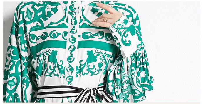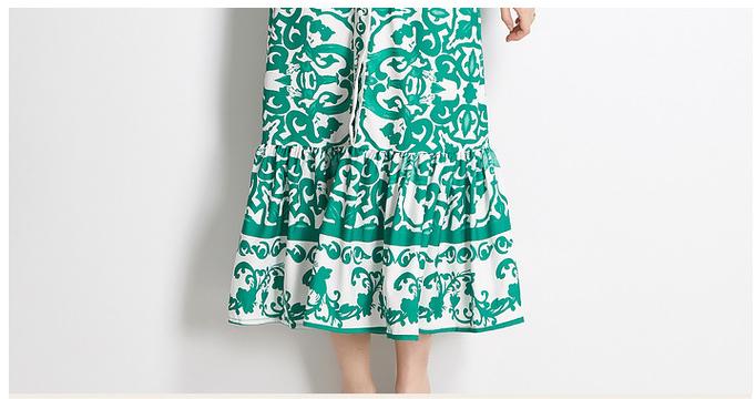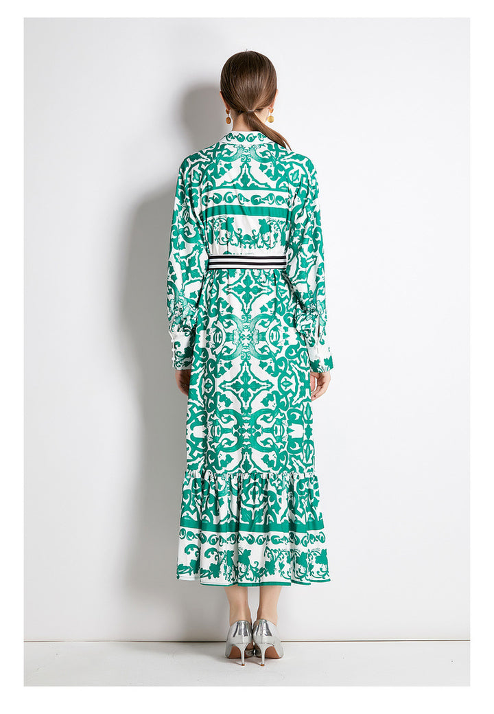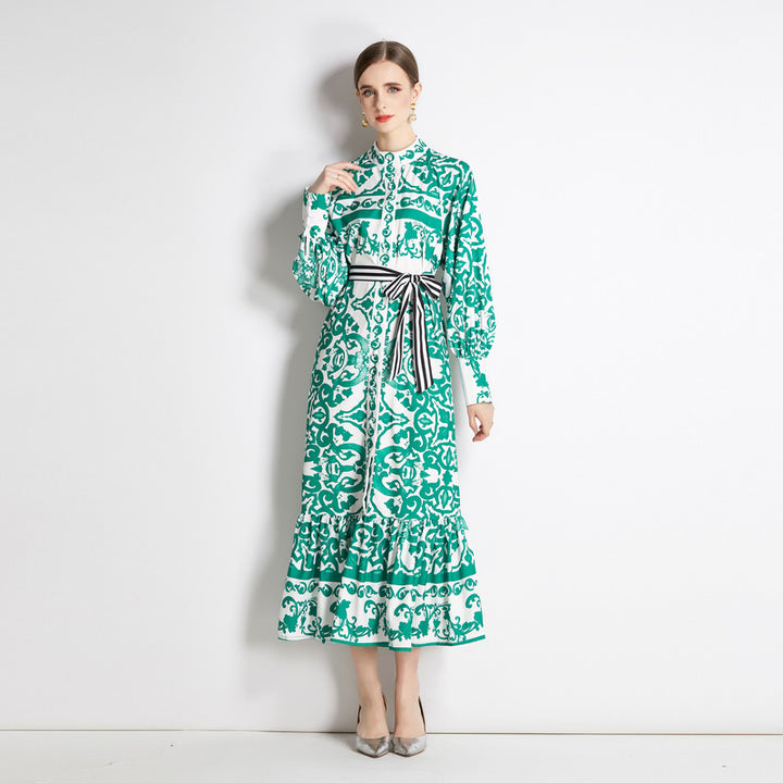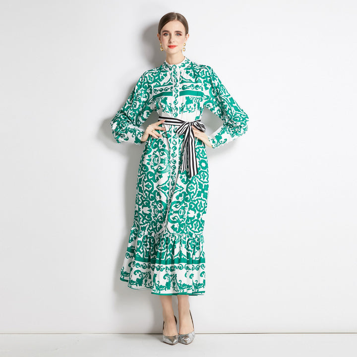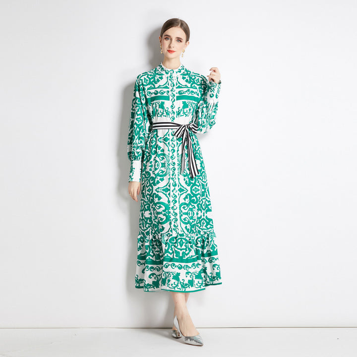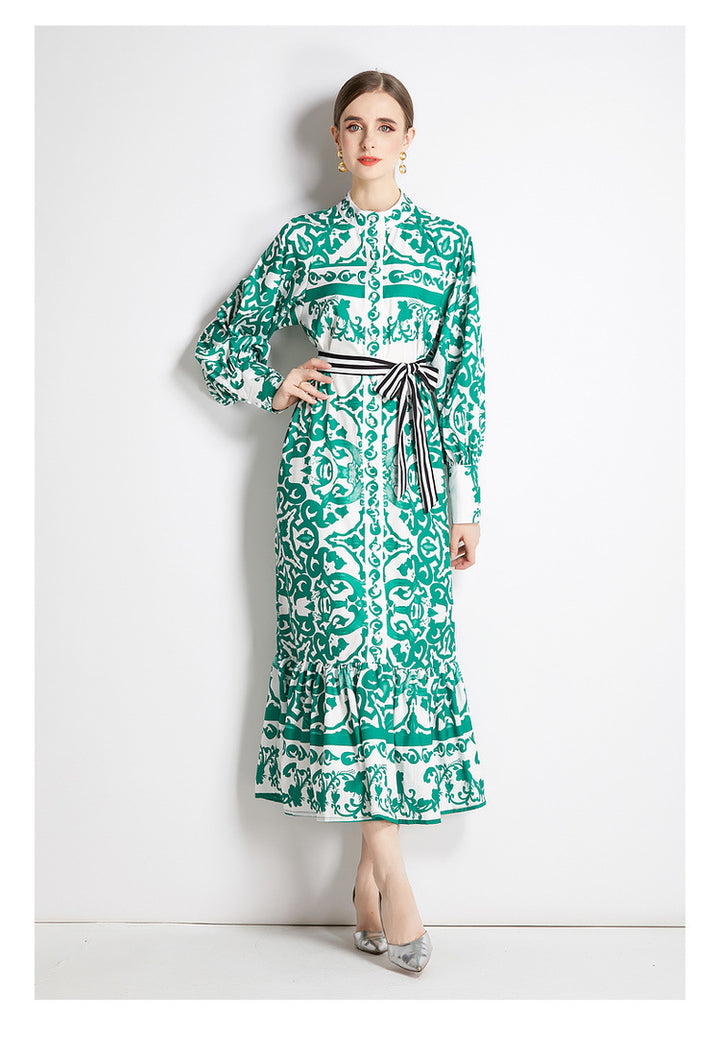 Geometric Print Single Breasted Long Skirt with Small Stand-Up Collar