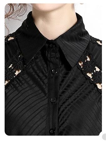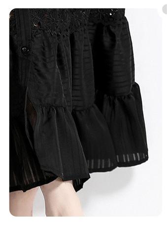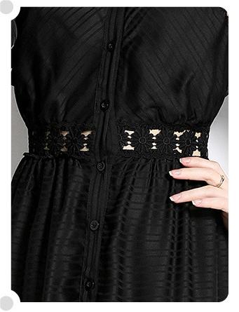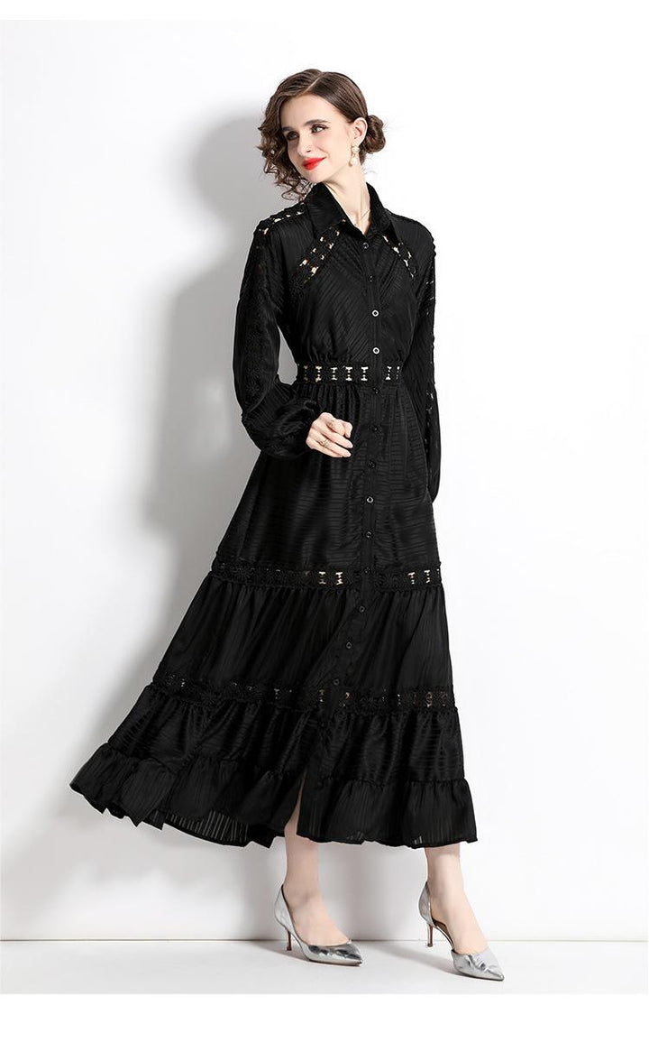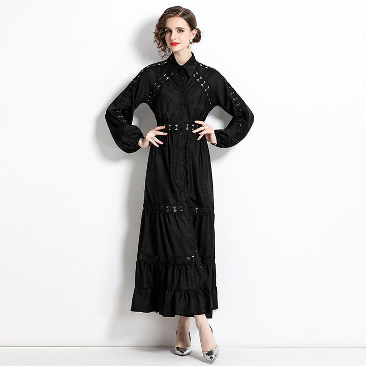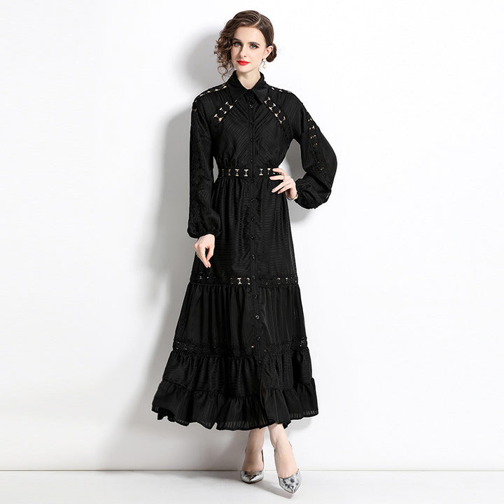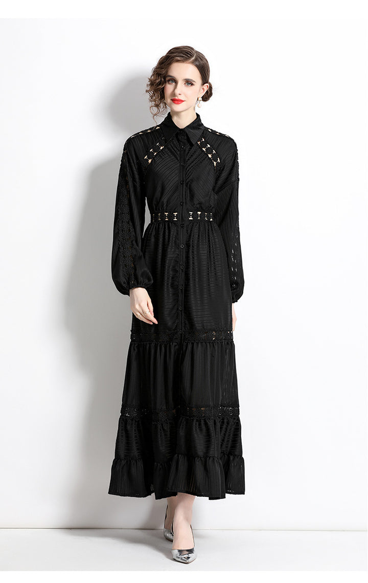 Girl Style Lapel Lantern Sleeve Single-Breasted Water-Soluble Lace Splicing Striped Long Dress