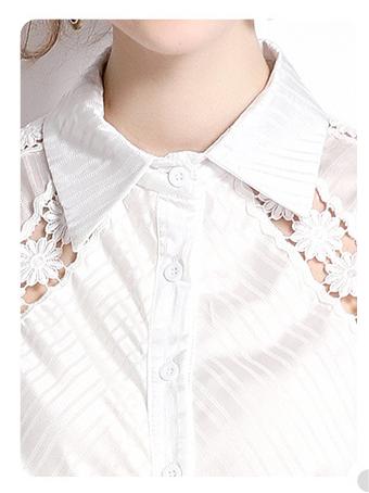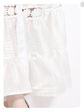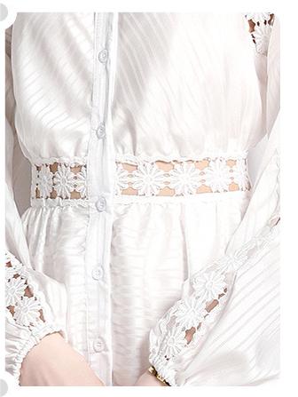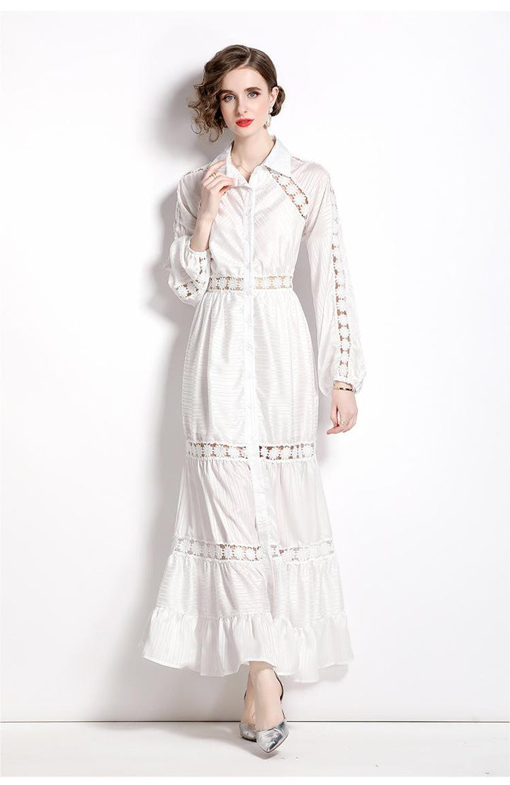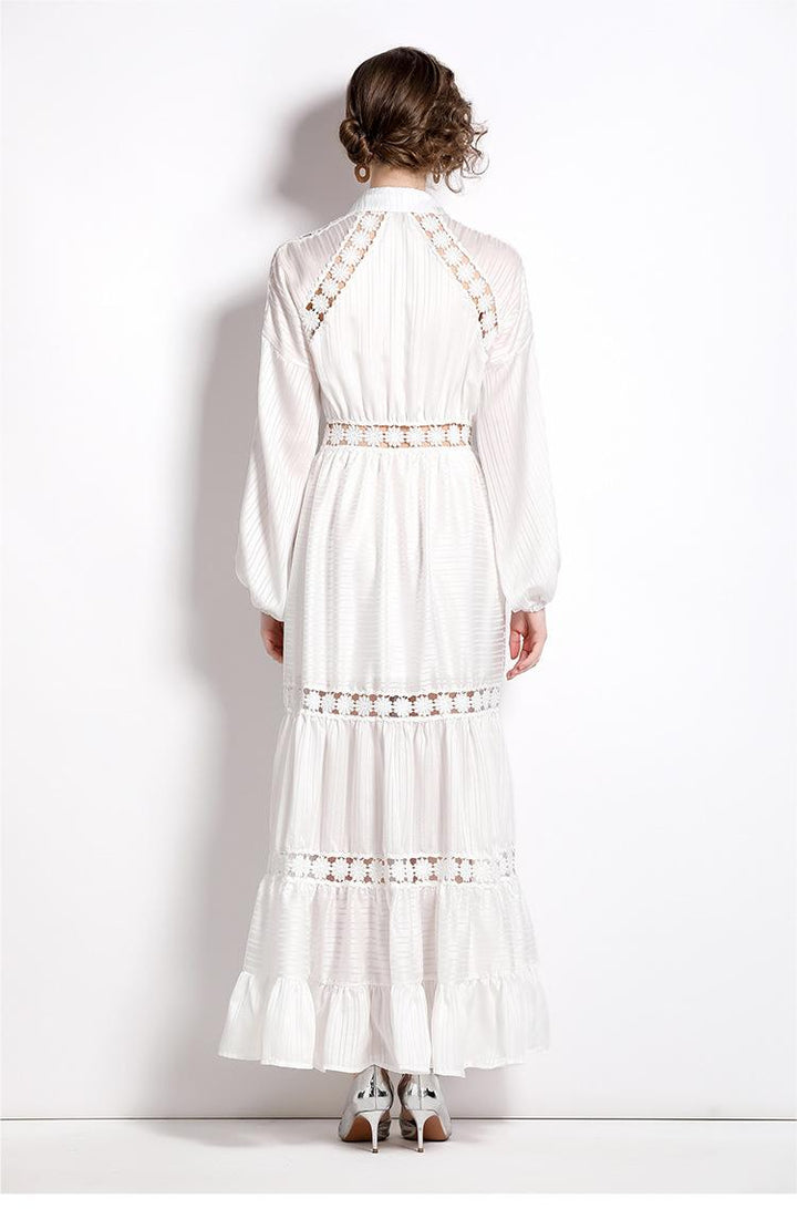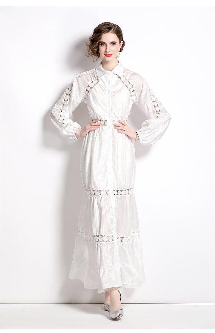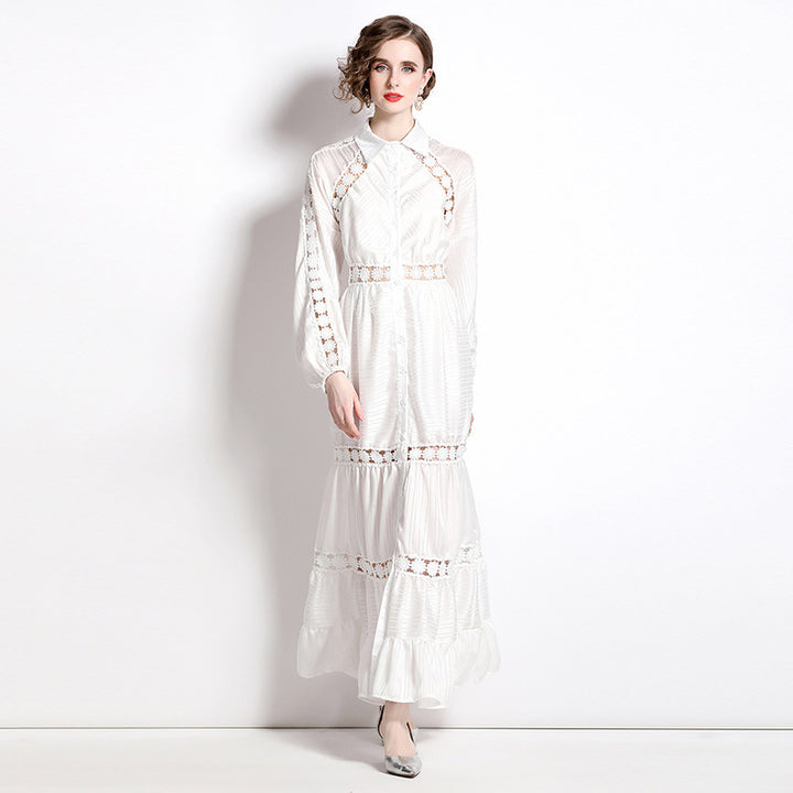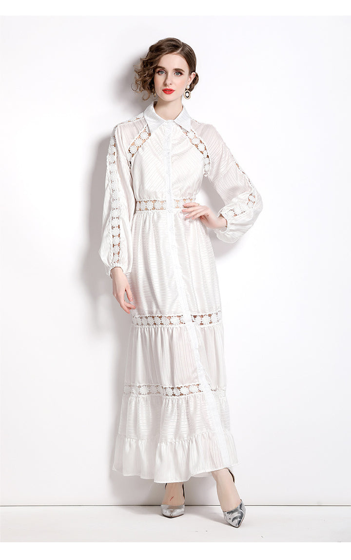Girl Style Lapel Lantern Sleeve Single-Breasted Water-Soluble Lace Splicing Striped Long Dress