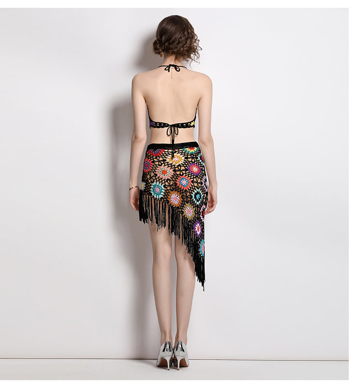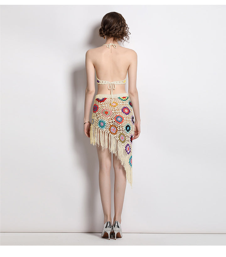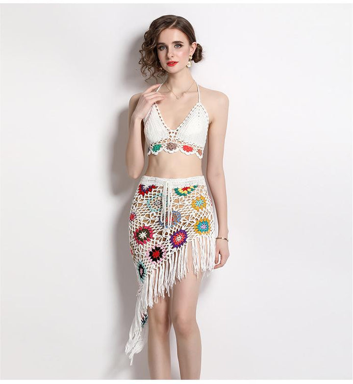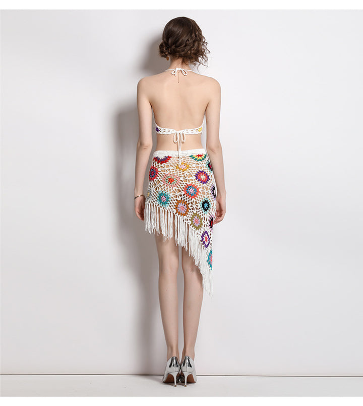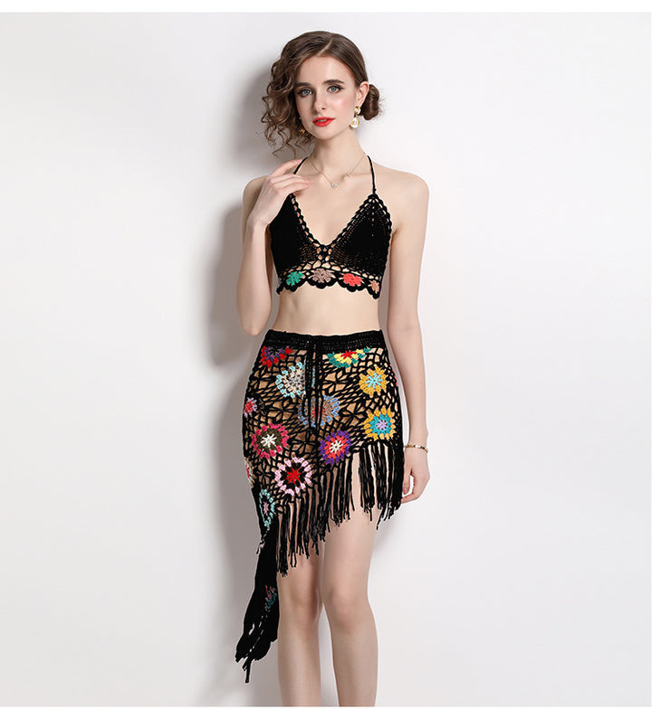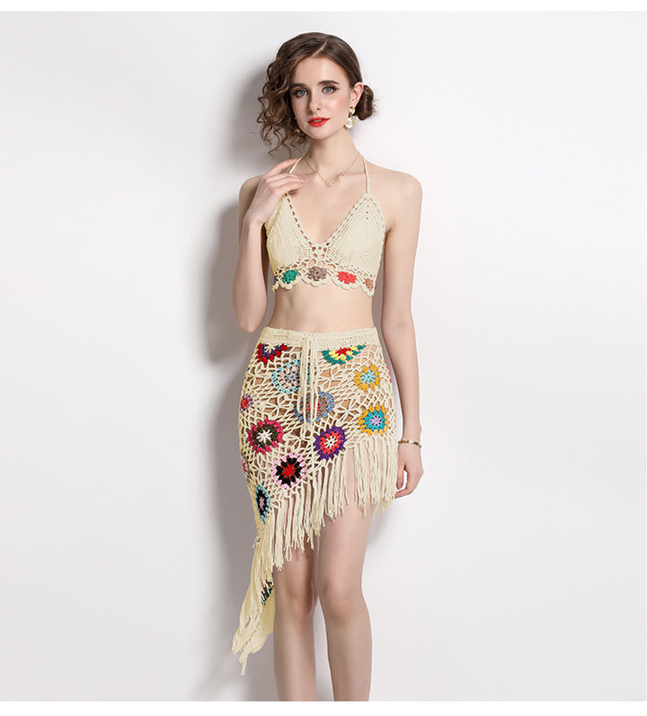 Hand Hook Knitted Hollowed Out V-neck Blazer Top and Irregular Fringed Skirt