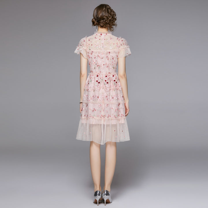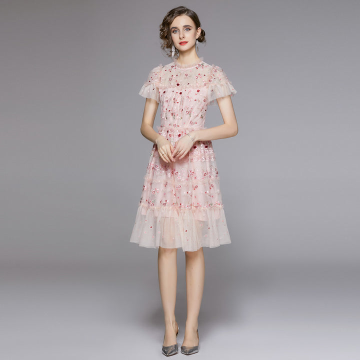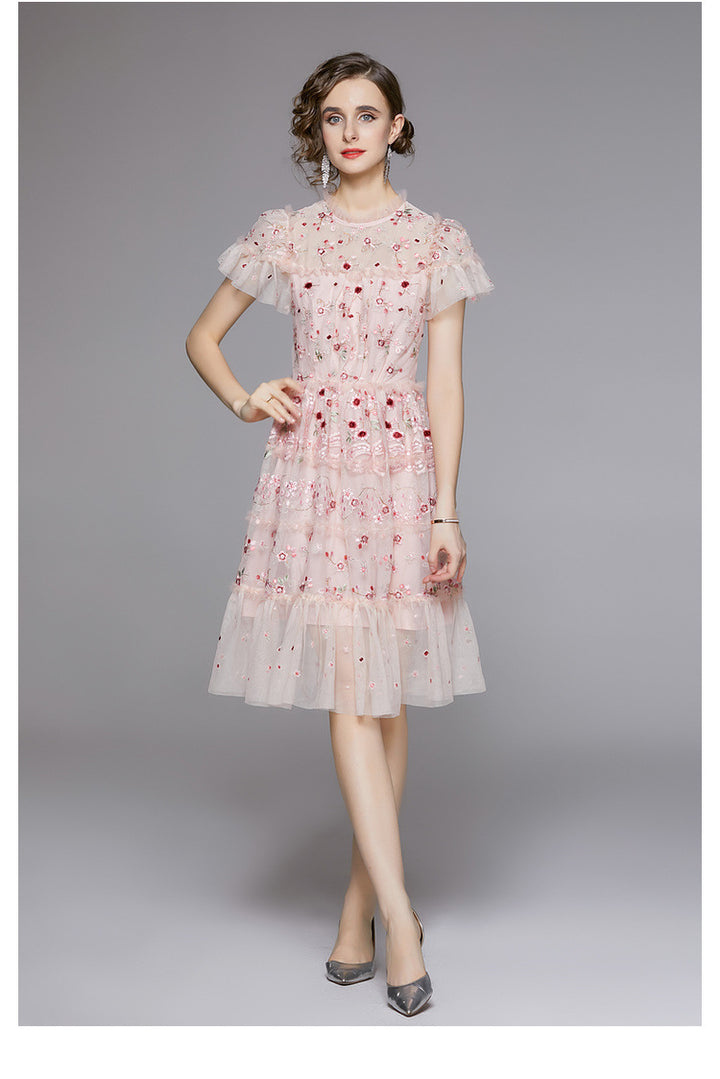 Heavy Sequin Mesh Embroidery Floral Tucked Waist Shaggy Short Princess Dress
