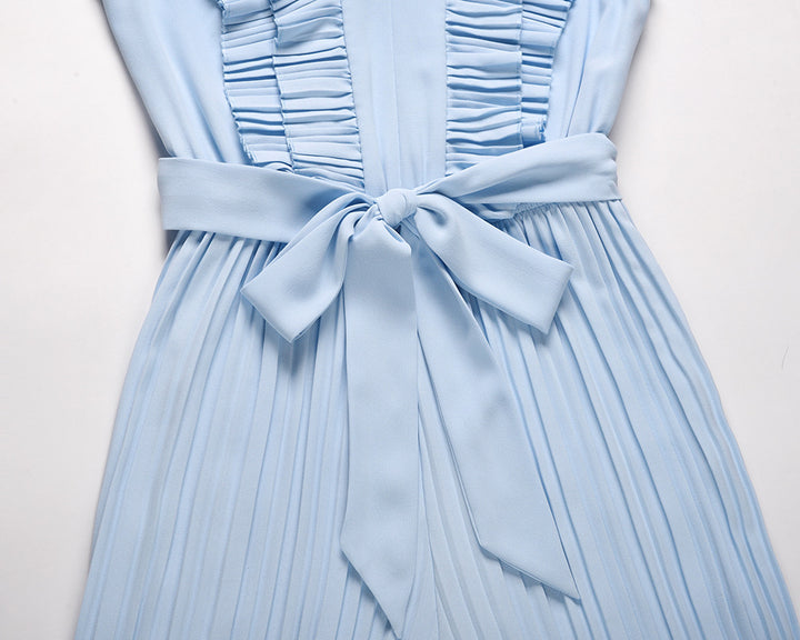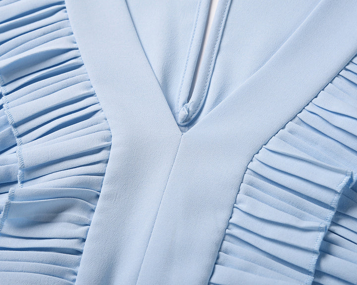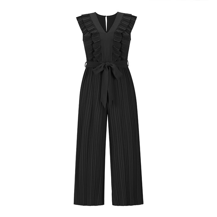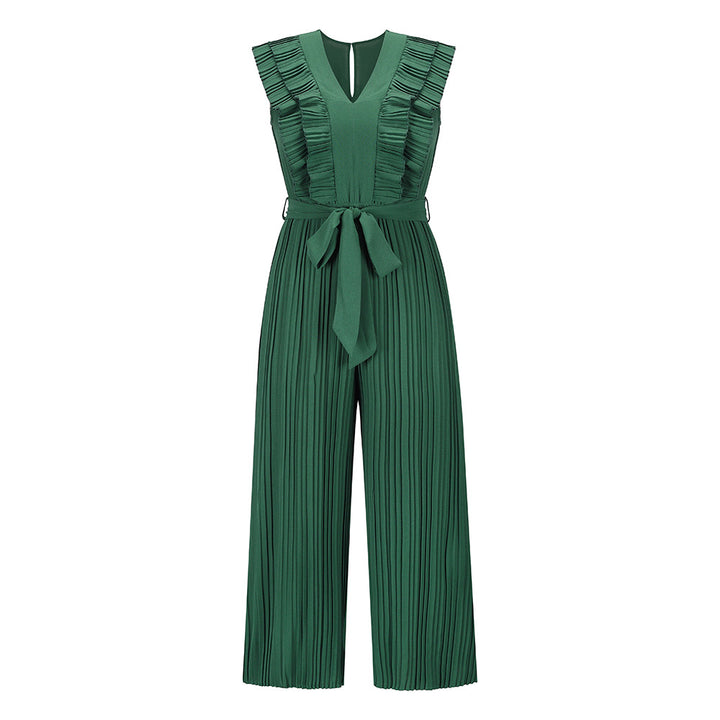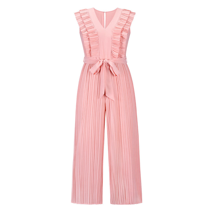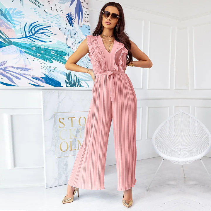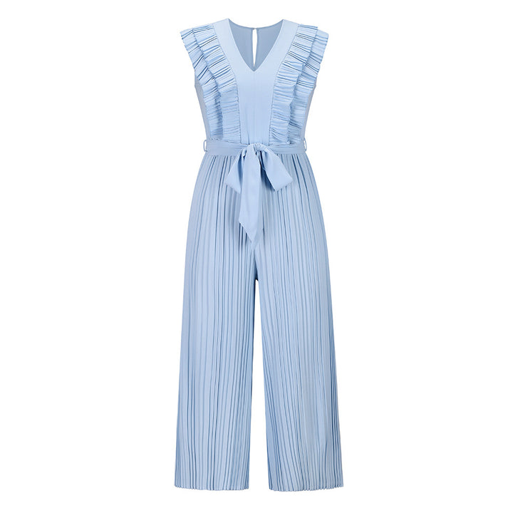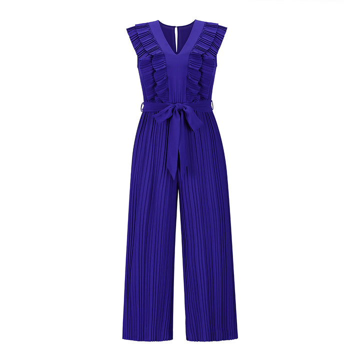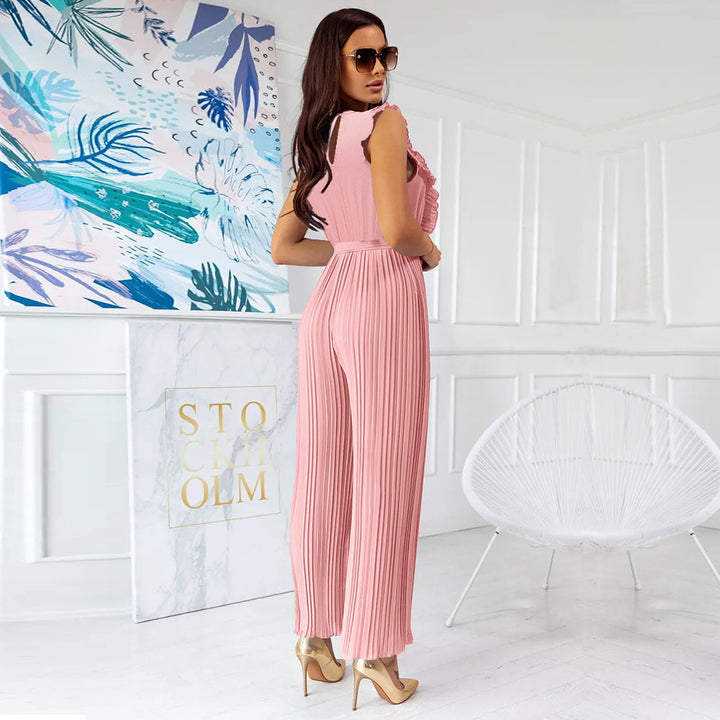 High Waist Pleated Jumpsuit Wide Leg Pants V Neck Jumpsuits