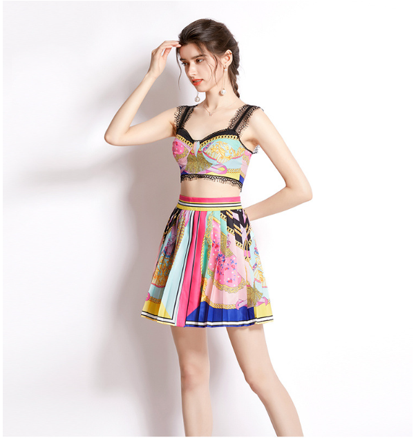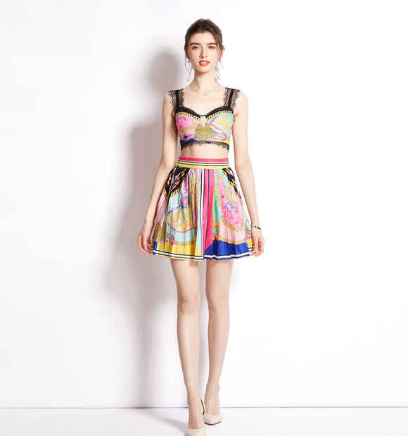 Holiday Printed Pleated Skirt and Lace Patchwork Top