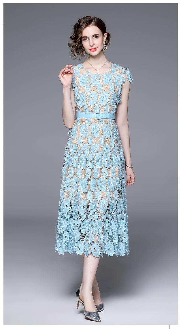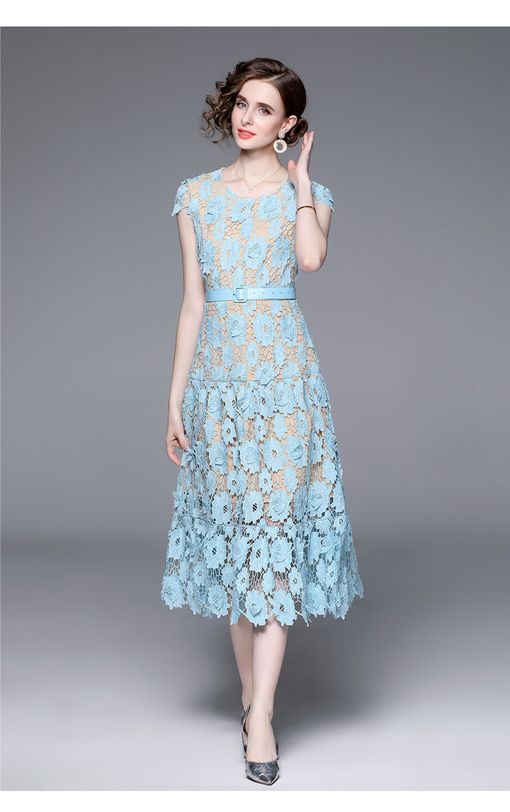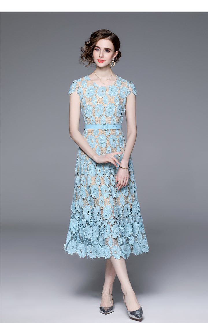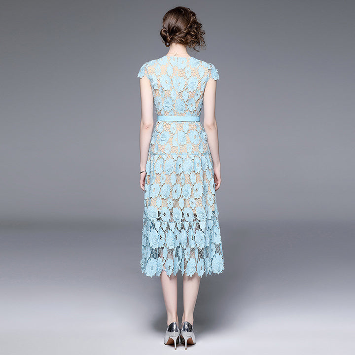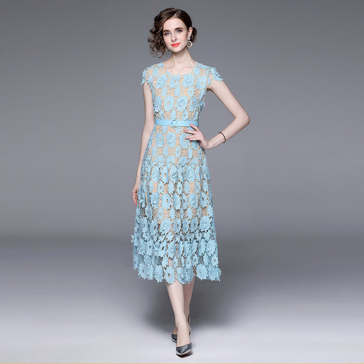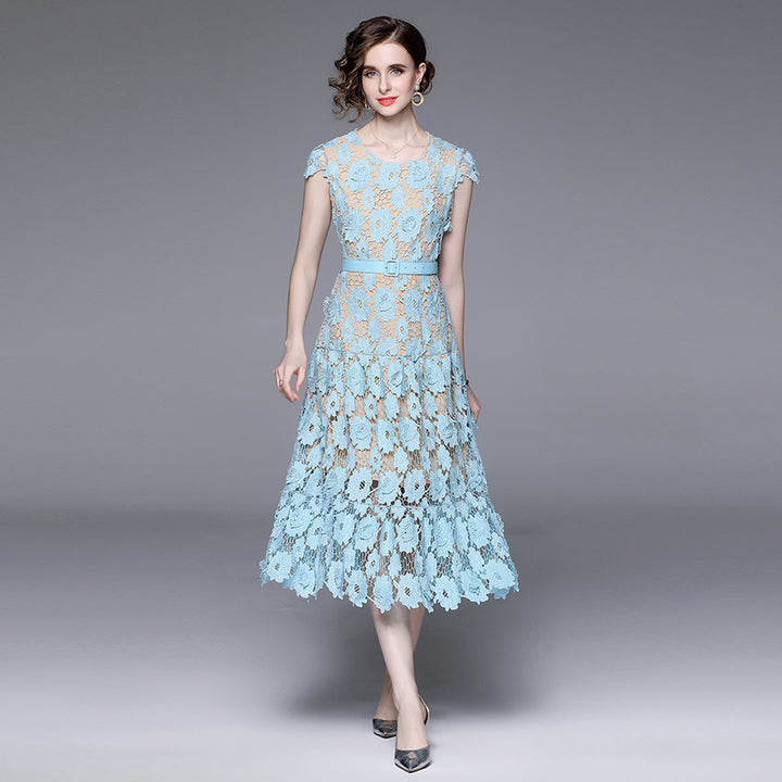 Hollow Oout Water-Soluble Flower Embroidery Round Neck Short Sleeve Solid Color Elegant Long Skirt Dress
