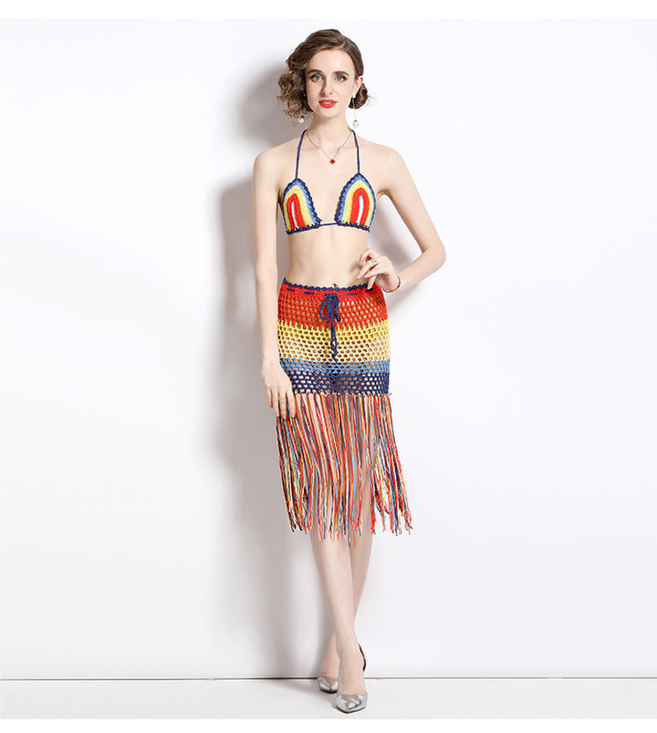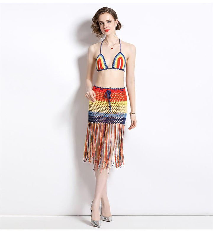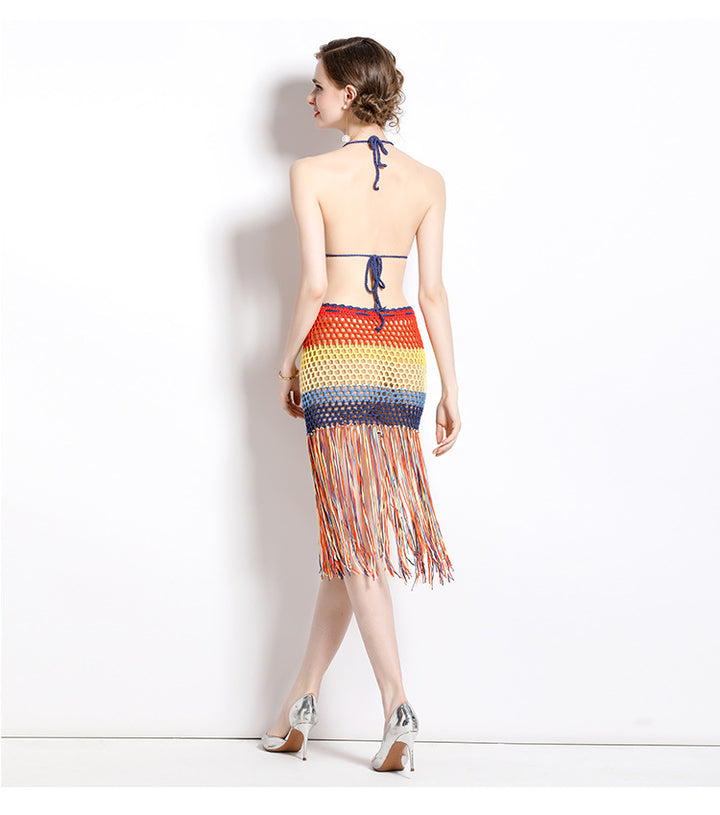 Hollowed Out beach Holiday Style Fashion Hanging Neck Wipe Chest Suspender and High Waist Tassel Sexy Bag Buttock Skirt Suit