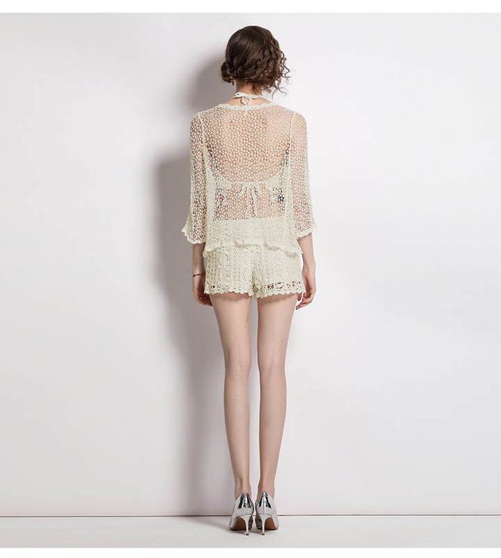Hollowed Out Sunscreen Cardigan an Hand Hook Hollowed Out Lace Shorts Three-Piece Set