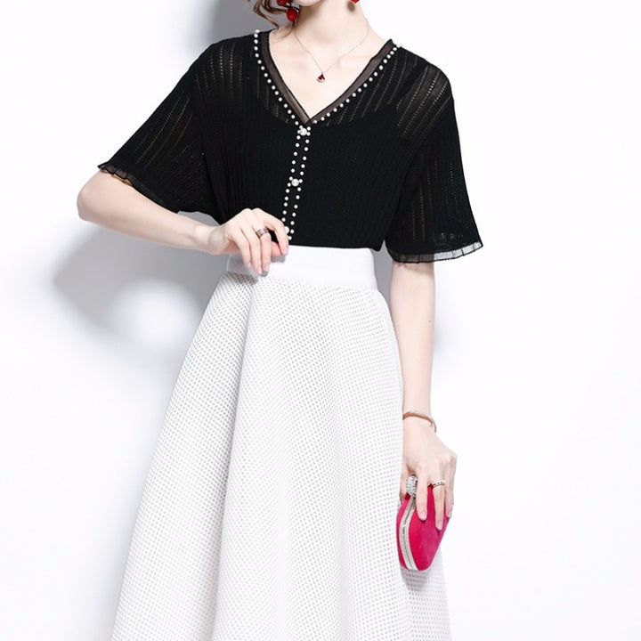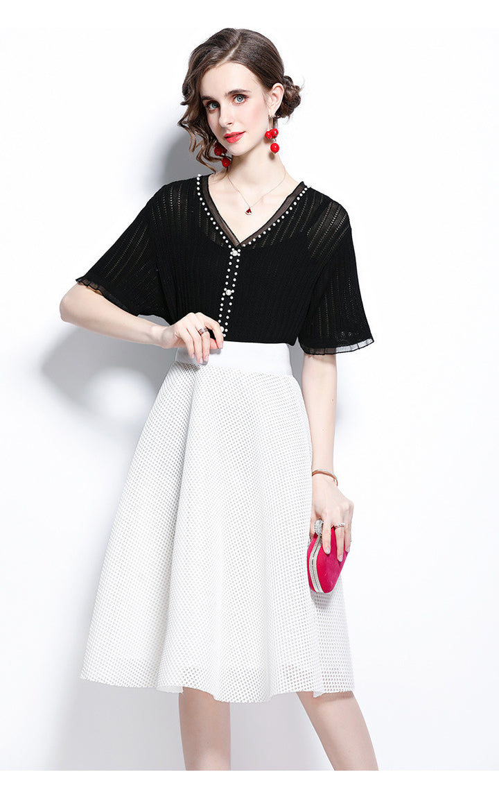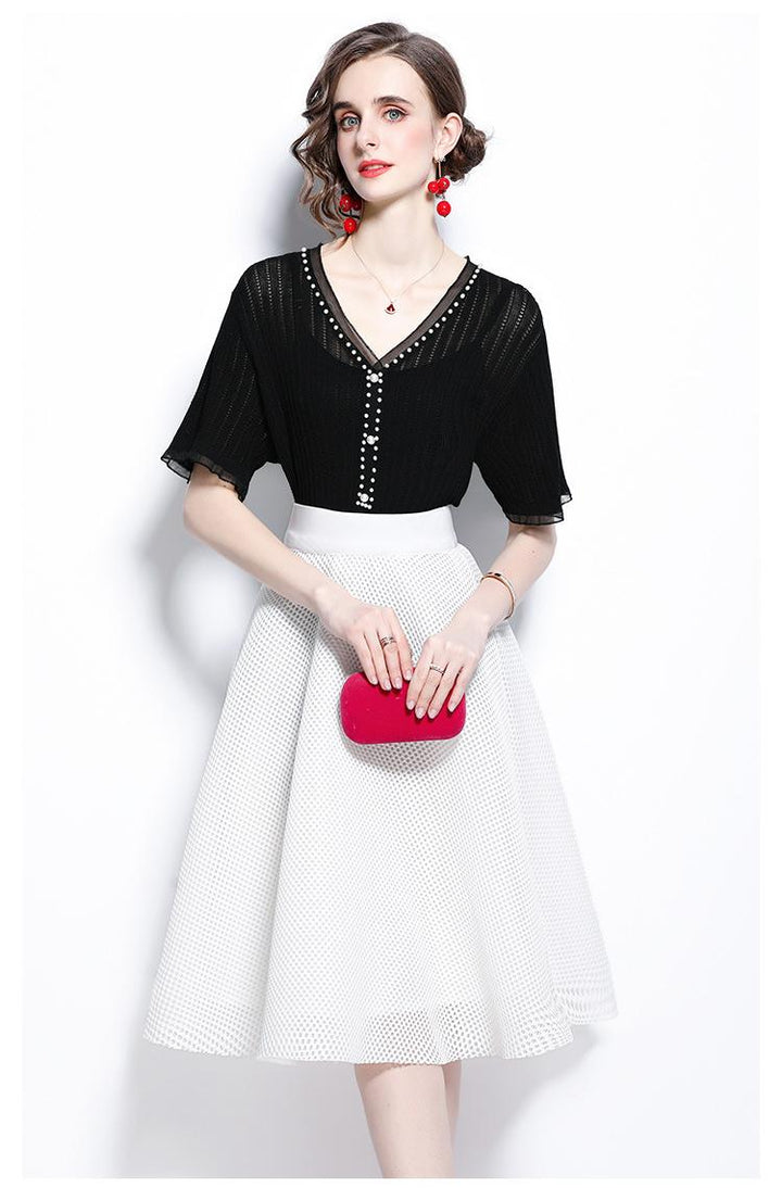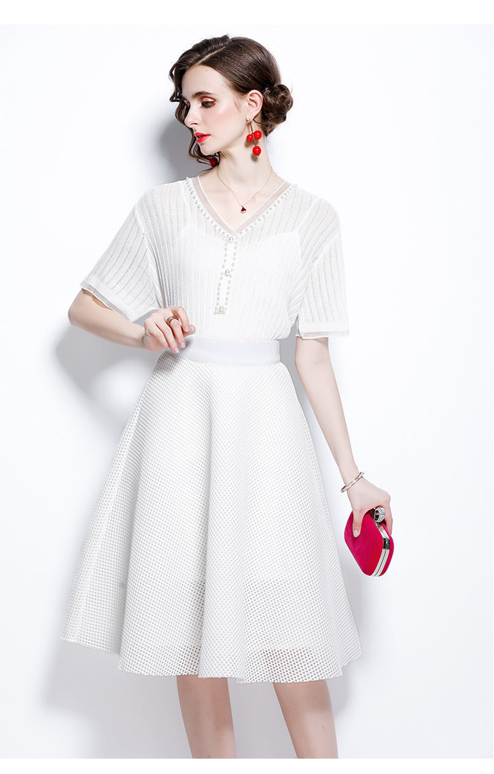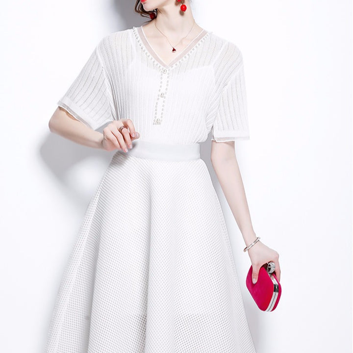 Ice Silk Breathable V-neck Nailed Beaded Knitwear and Hollowed Out Mesh Princess Skirt Two-Piece Set