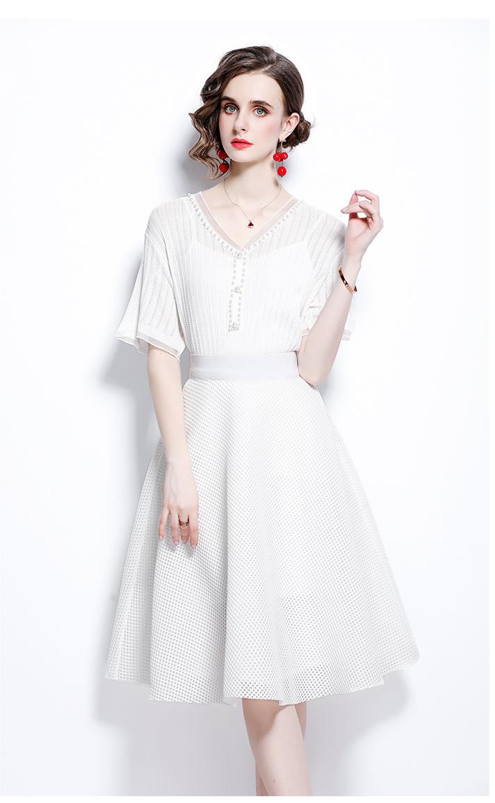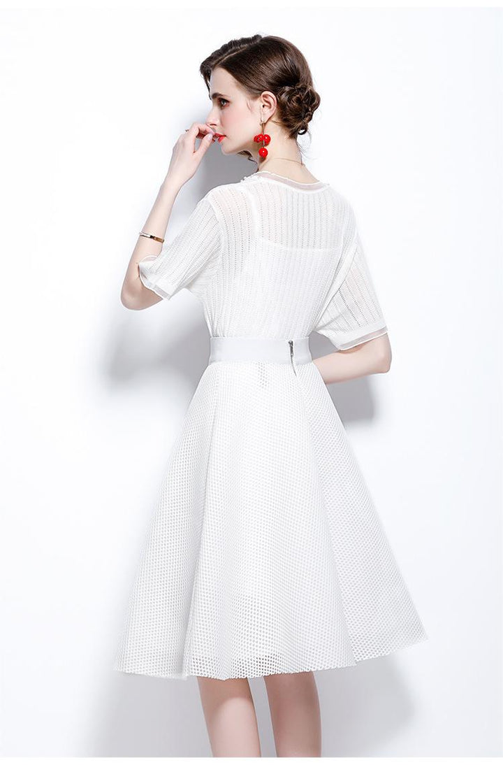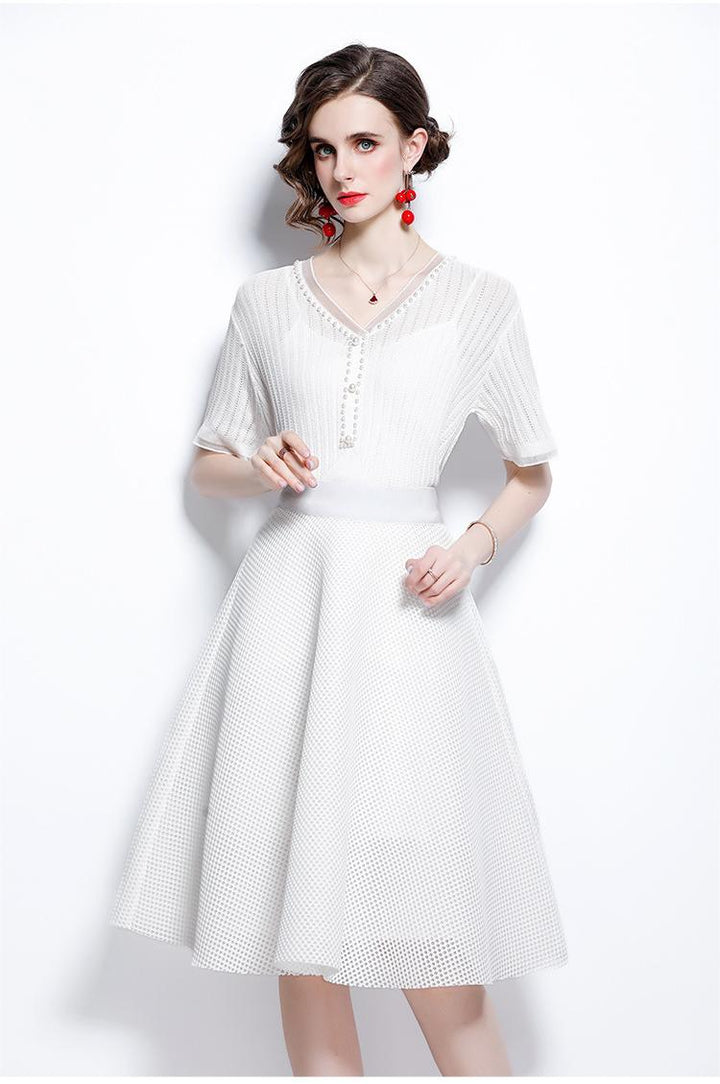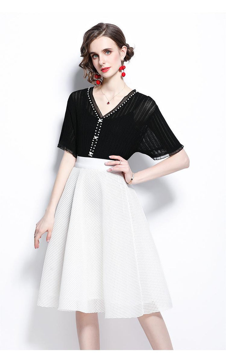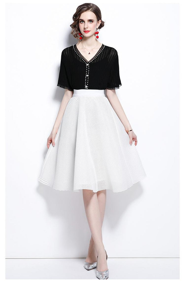 Ice Silk Breathable V-neck Nailed Beaded Knitwear and Hollowed Out Mesh Princess Skirt Two-Piece Set