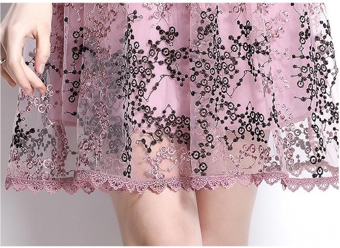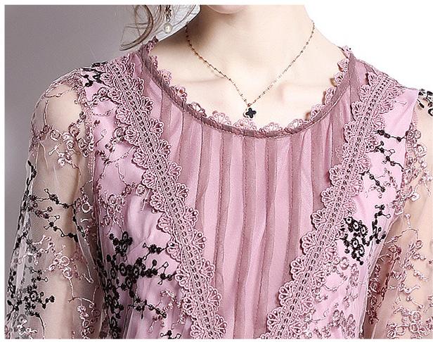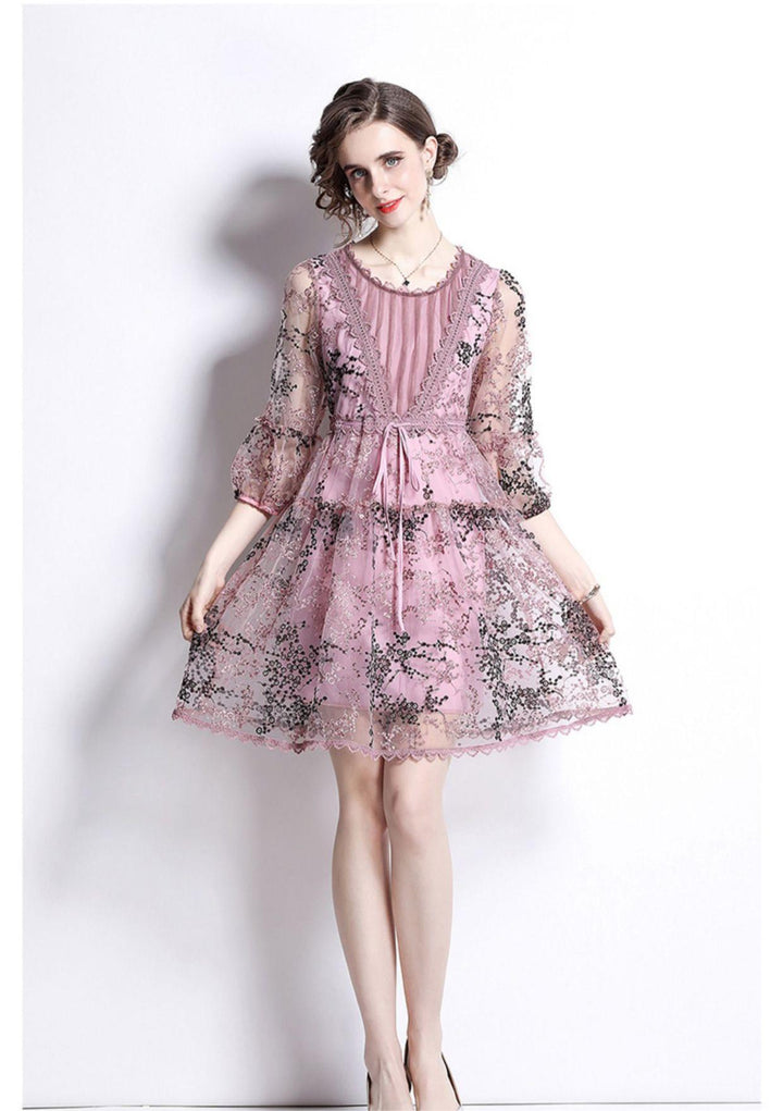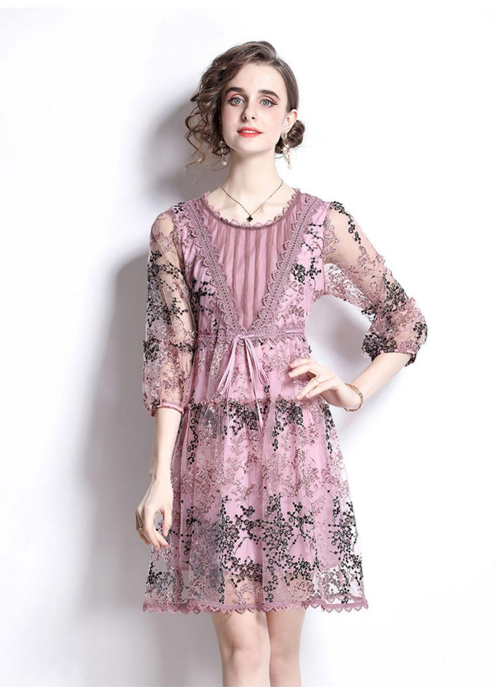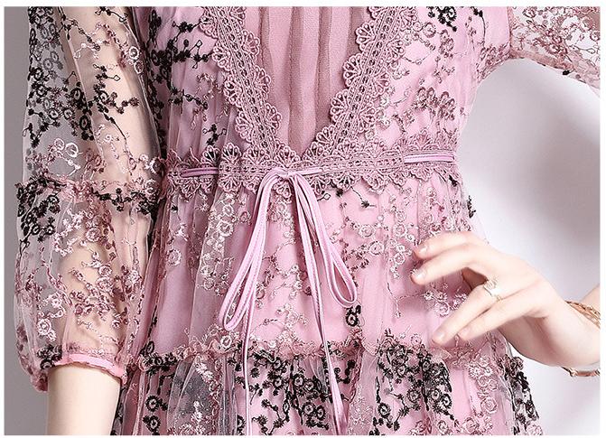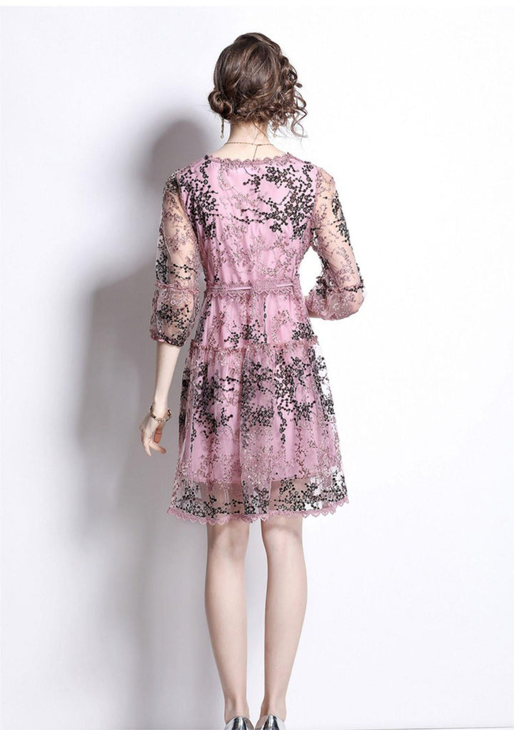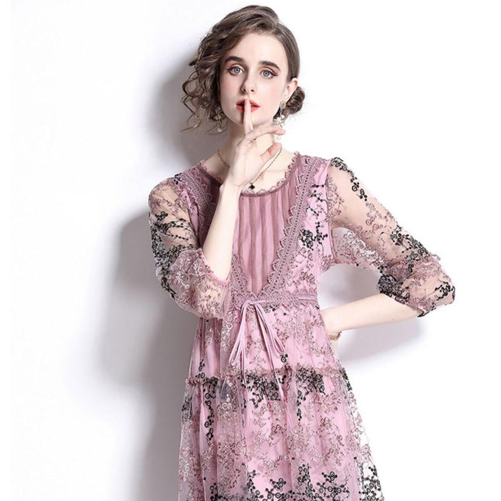 Lace Mesh Embroidery Fashion Seven-Point Sleeve Mid-Skirt Crewneck Dress