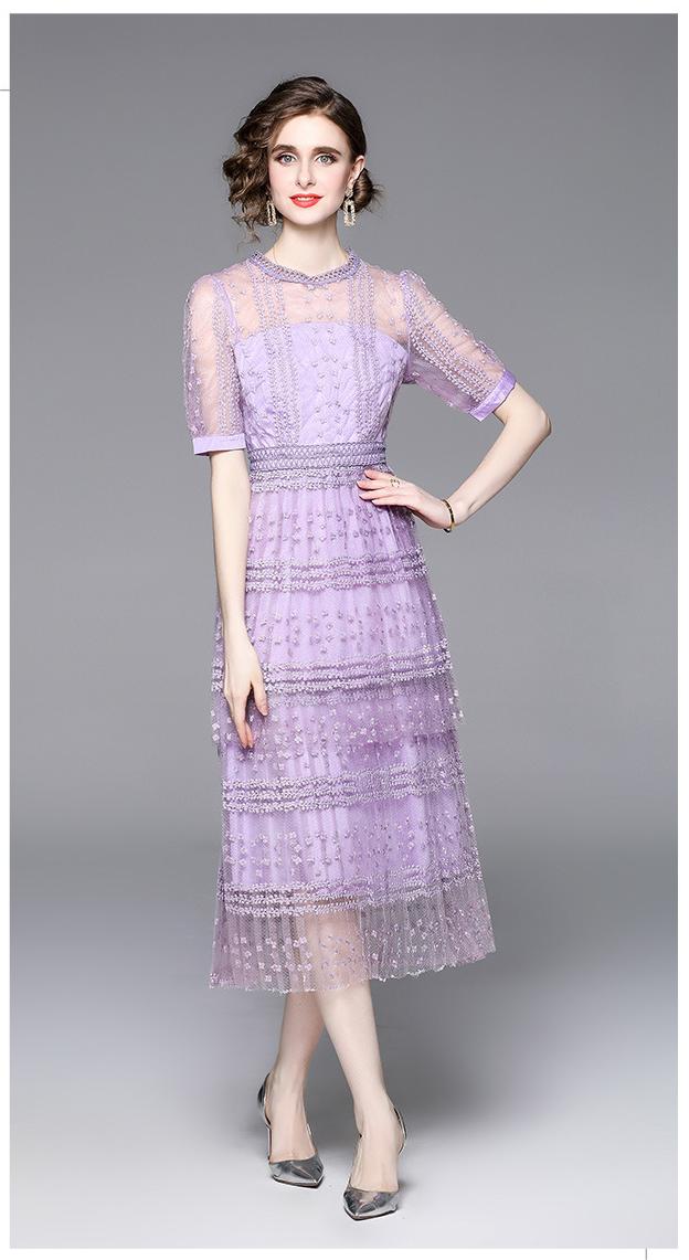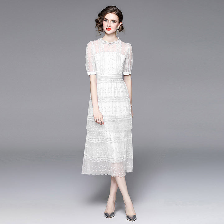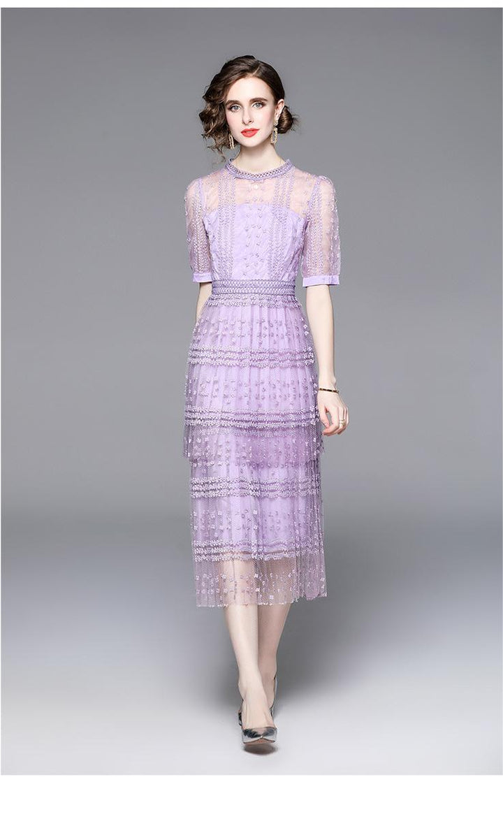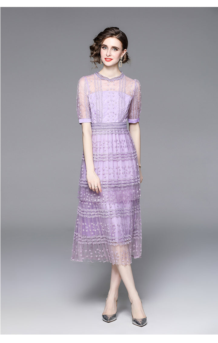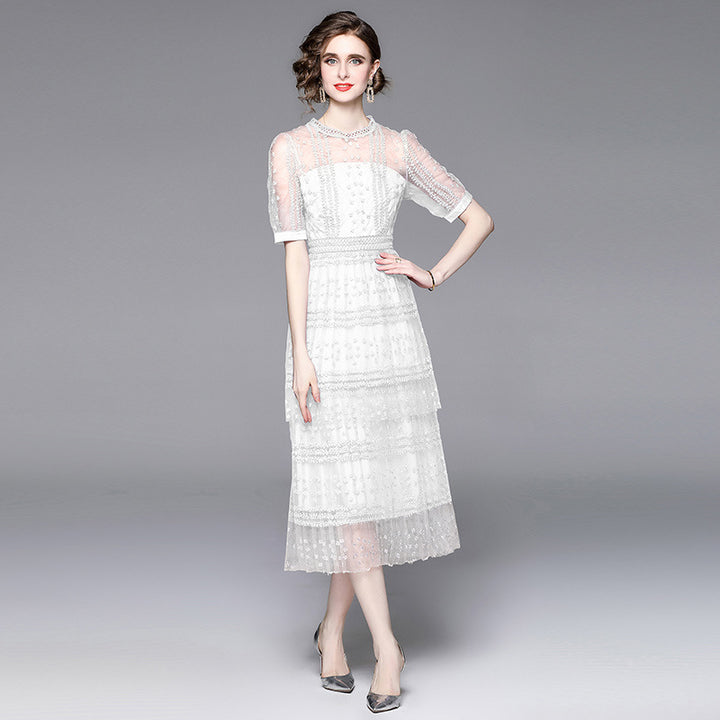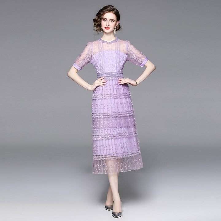 Lace Stitching Mesh Embroidered Crewneck Sexy Short Sleeved Long Skirt Slim Dress