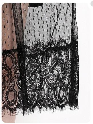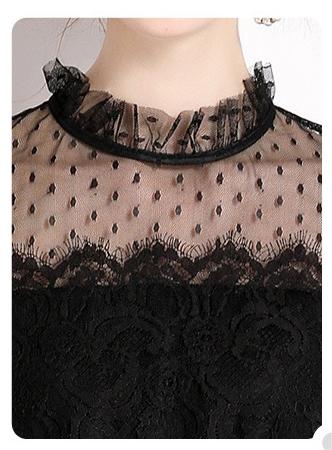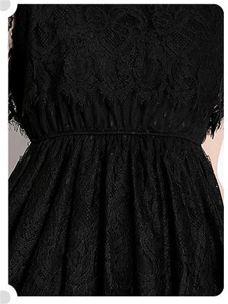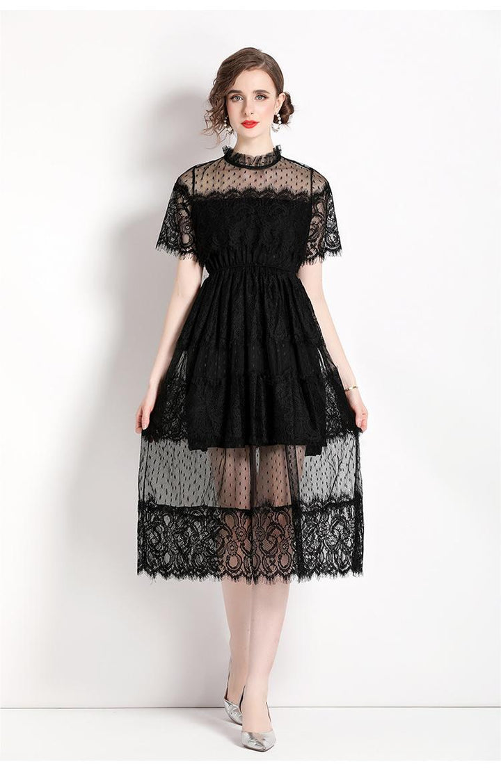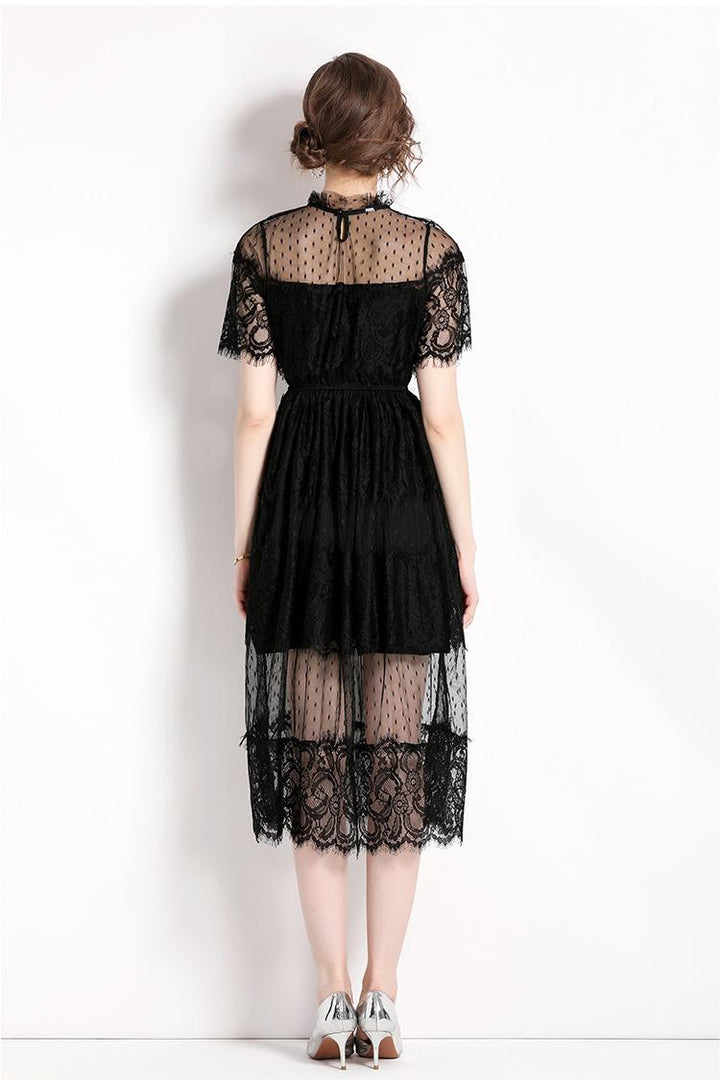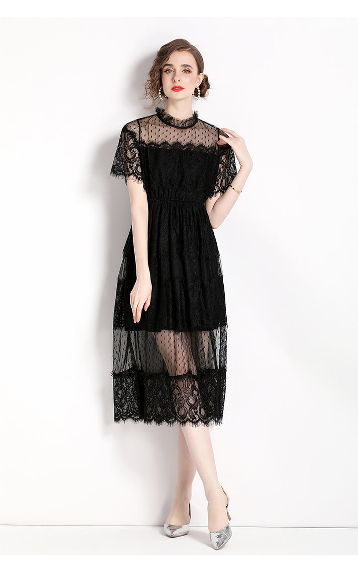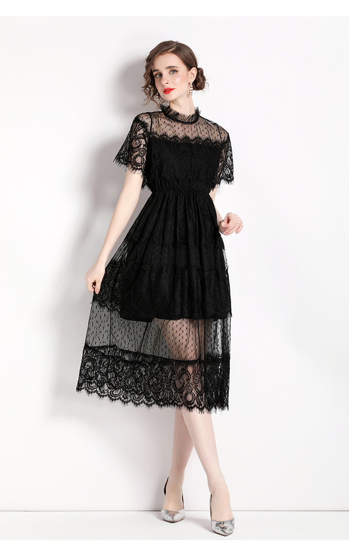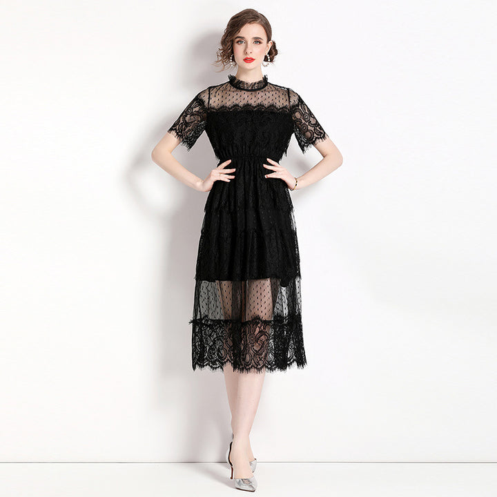 Lace stitching Mesh Yarn Waist Slimming Short Sleeve Long Dress