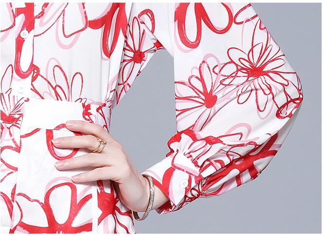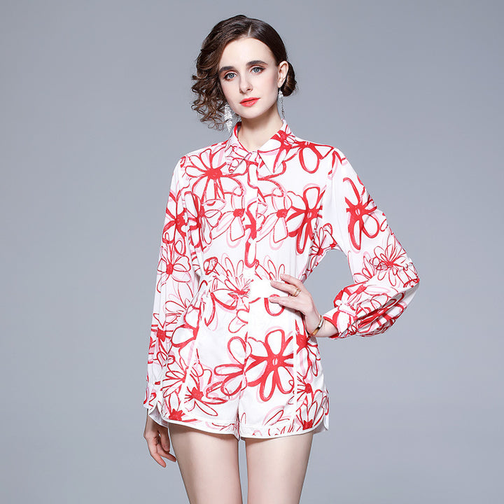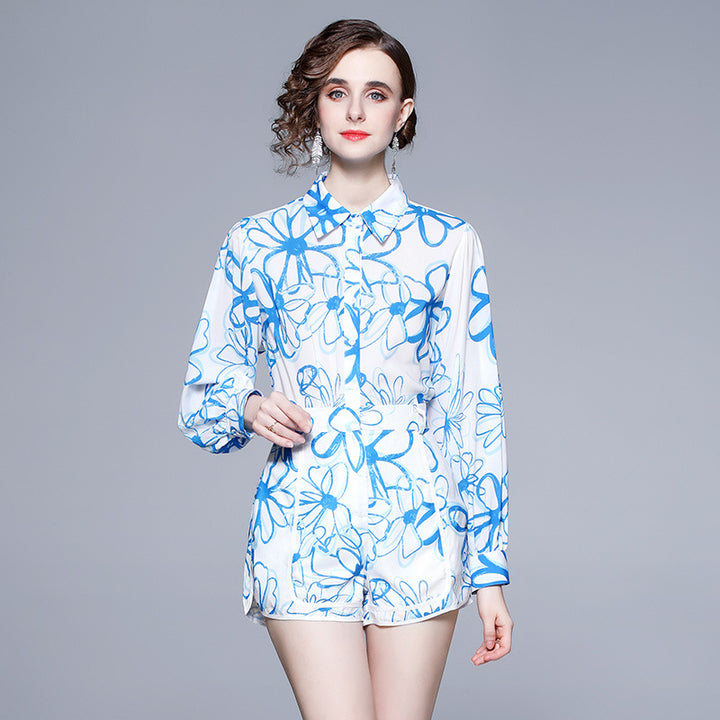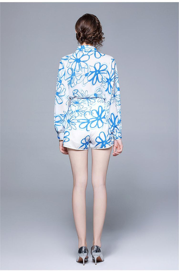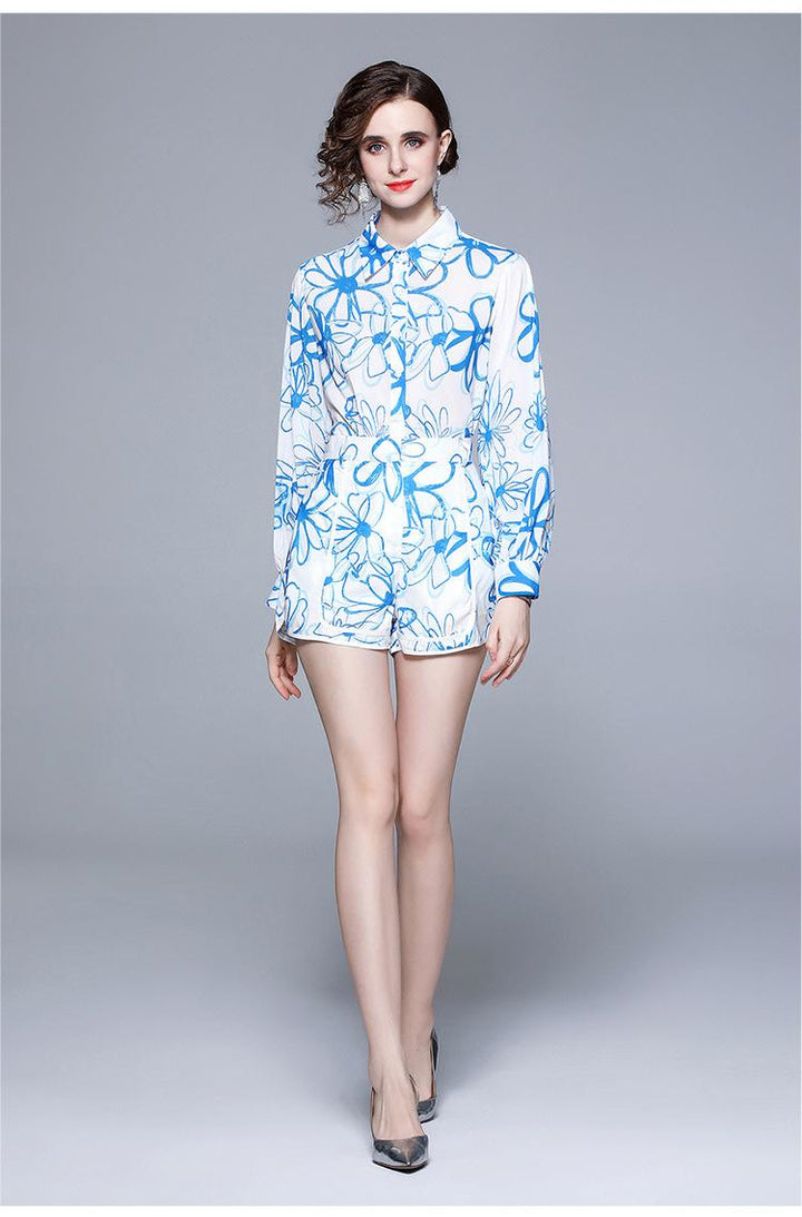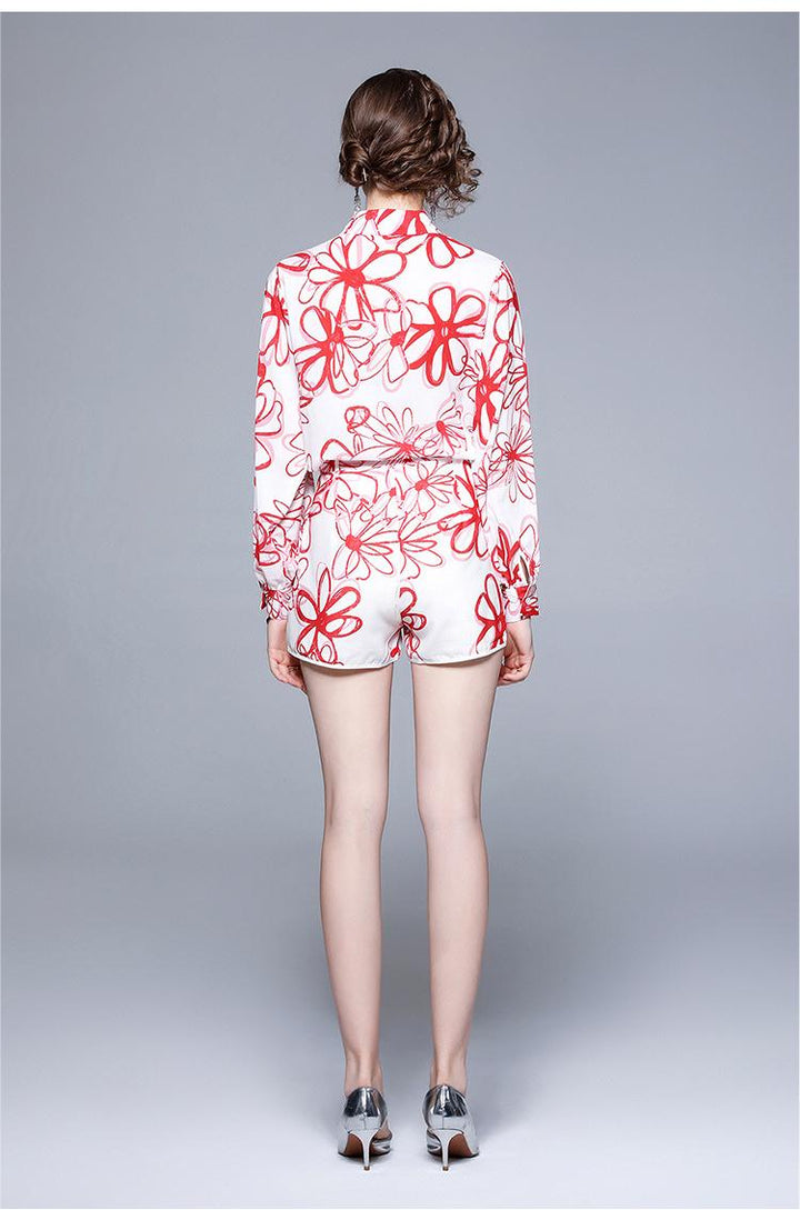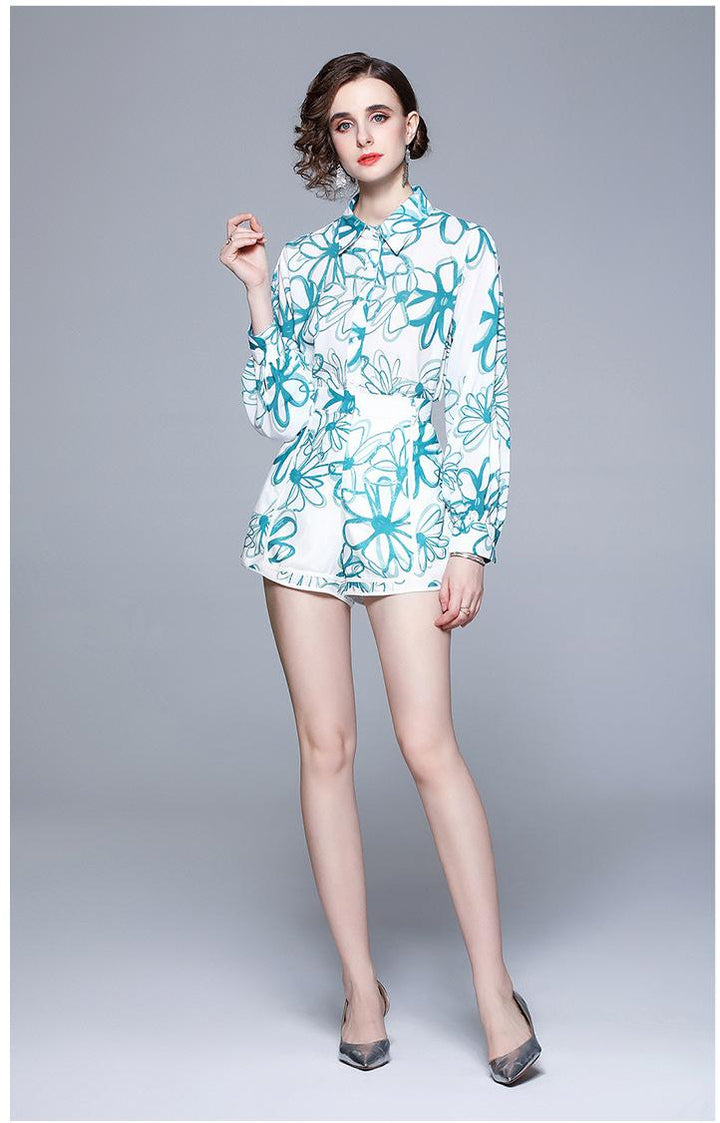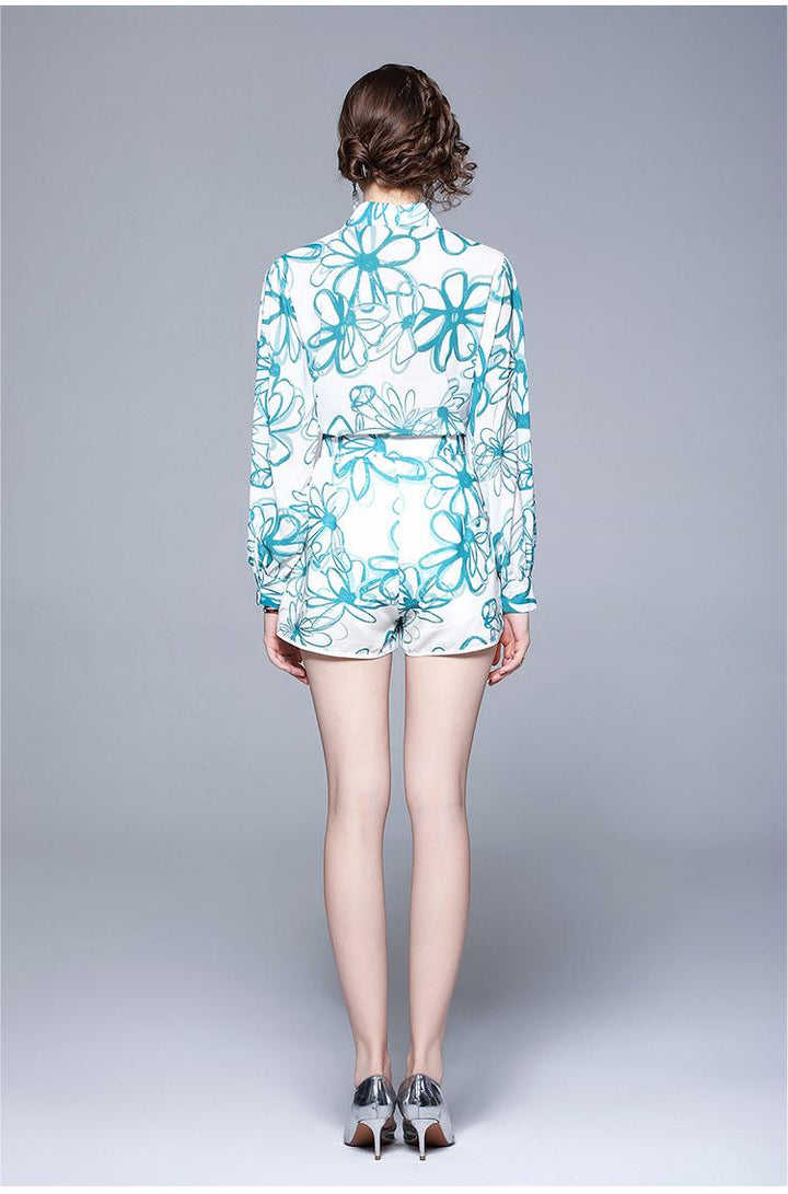 Lapel Chiffon Print Slim Temperament Fashion Shirt and Shorts Suit