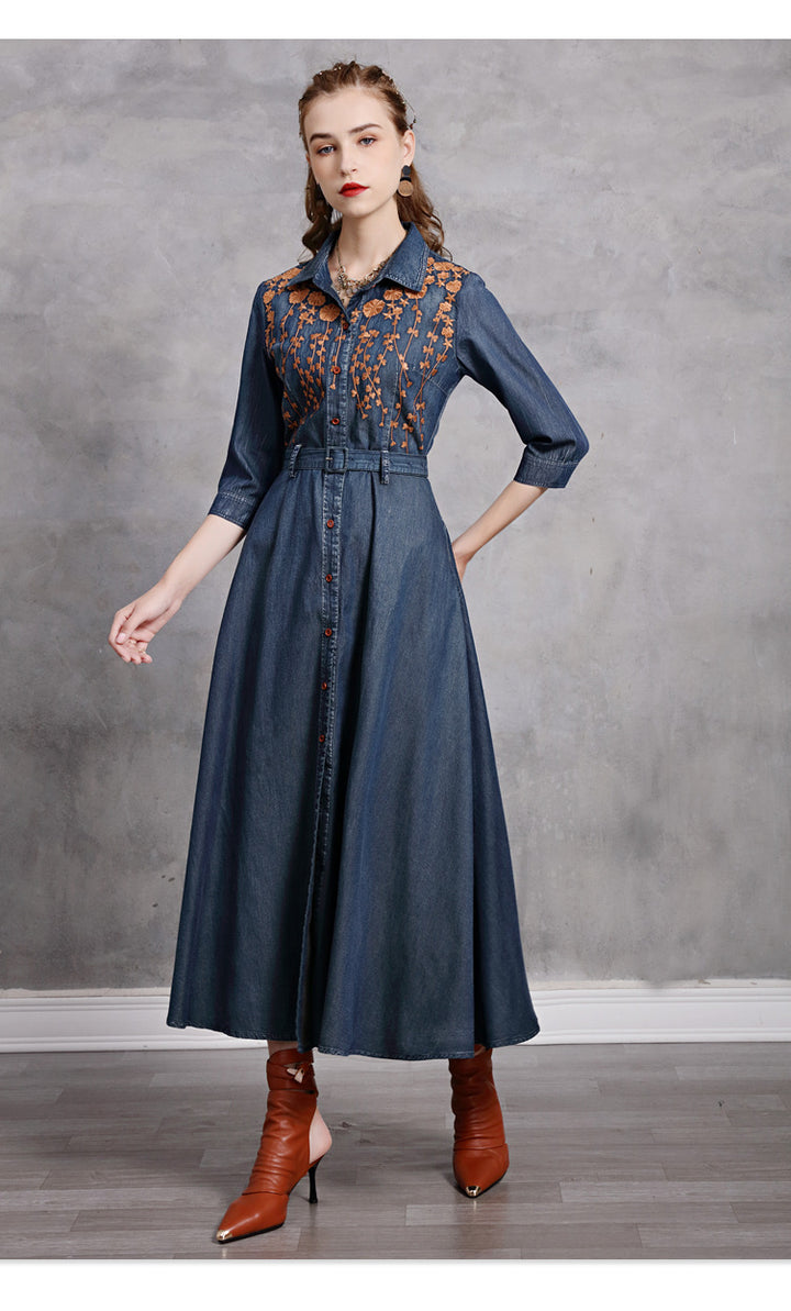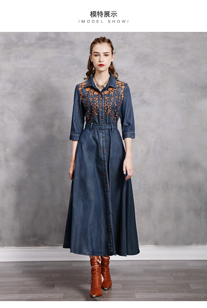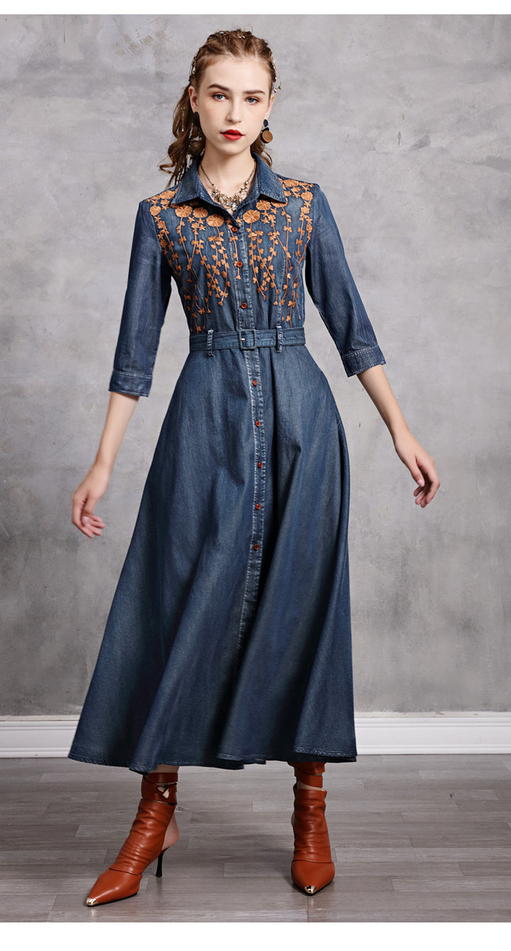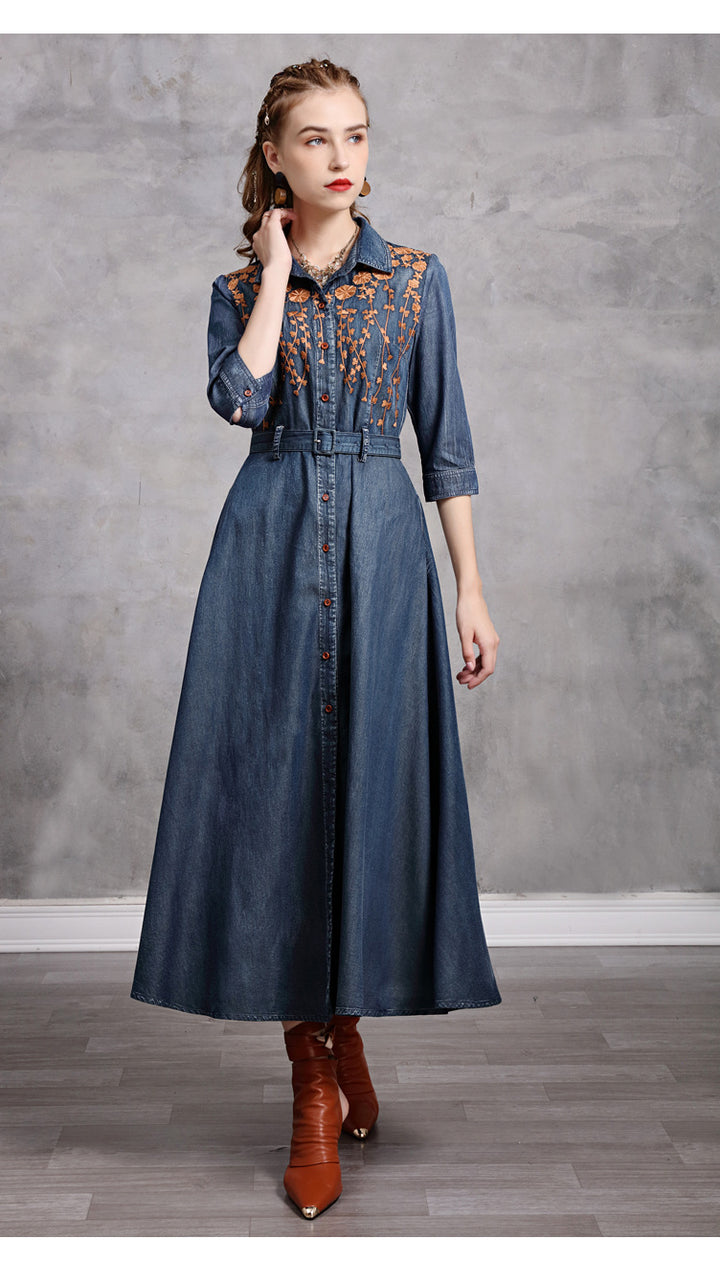 Lapel Temperament Slim Embroidered Denim Maxi Dress 2022 Vintage Mid-Sleeve New Slimming Dress