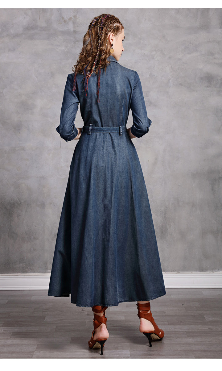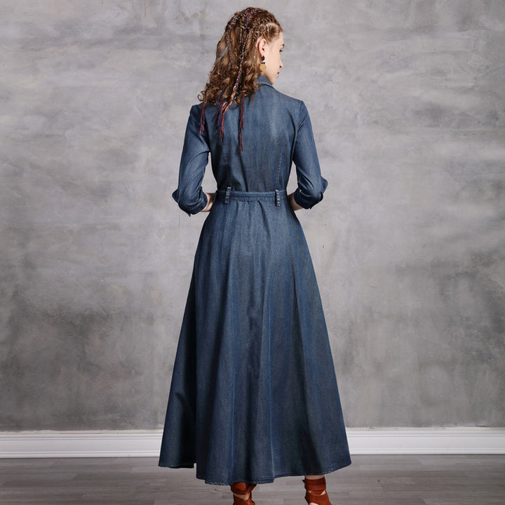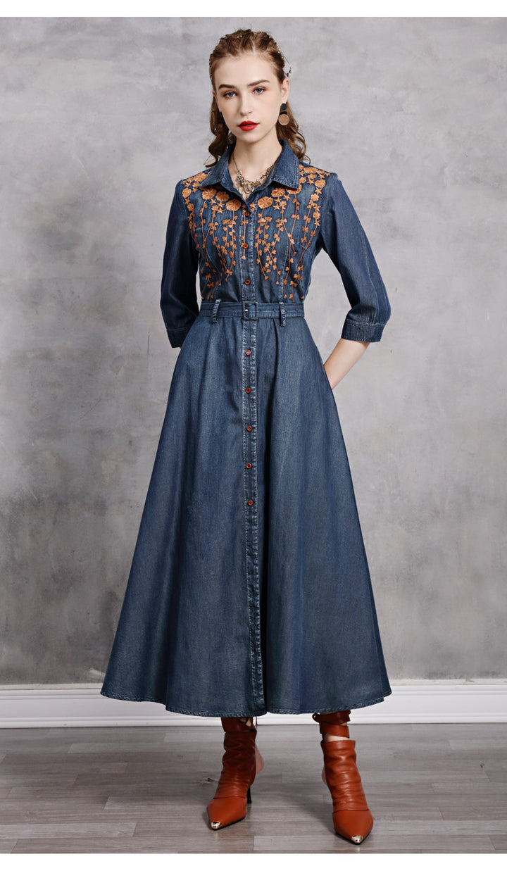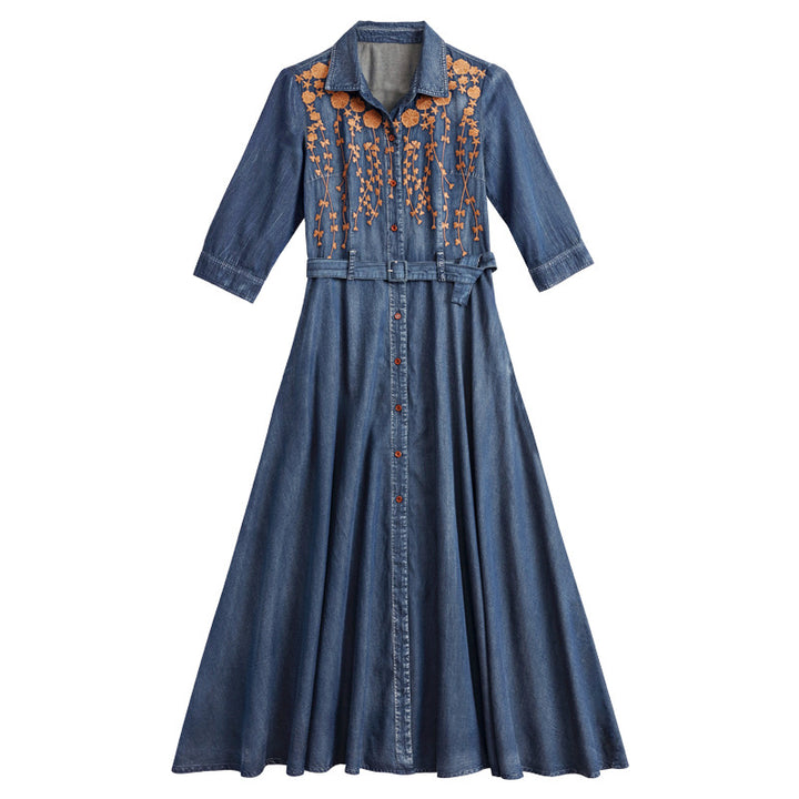 Lapel Temperament Slim Embroidered Denim Maxi Dress 2022 Vintage Mid-Sleeve New Slimming Dress