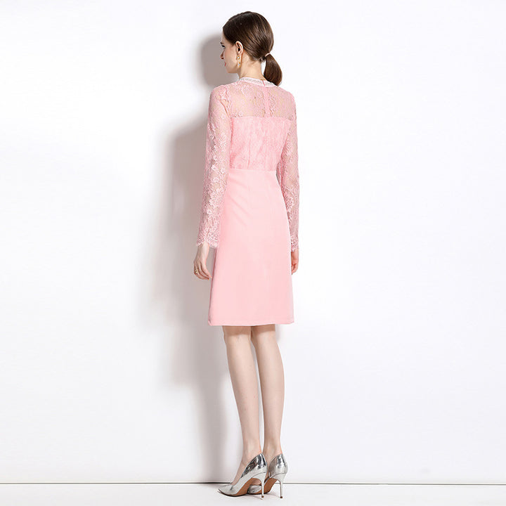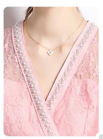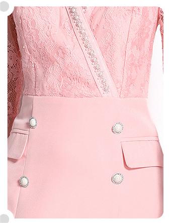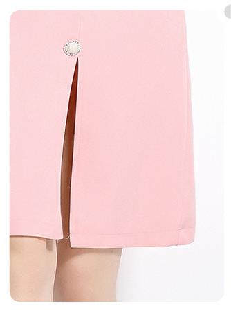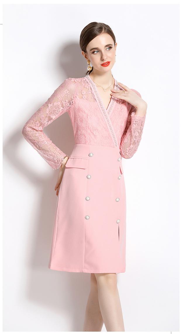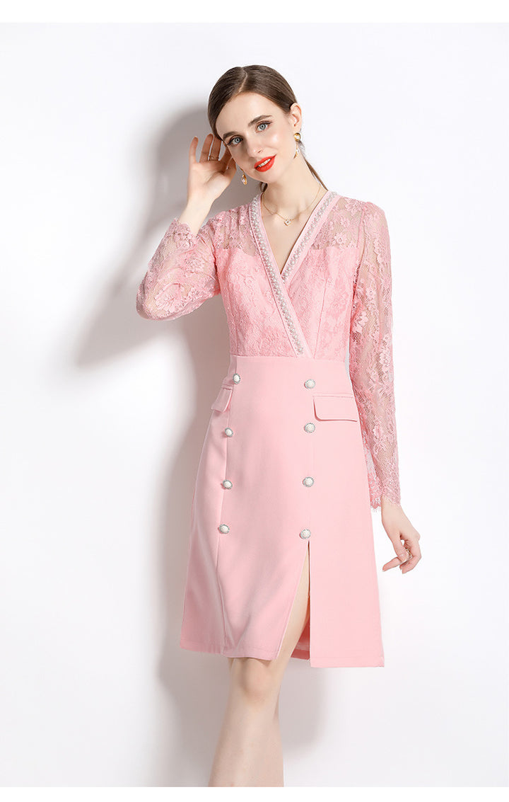 Light Ripe Temperament Pink V-Neck Long-Sleeved Dress Tucked in Waist Slit Skirt