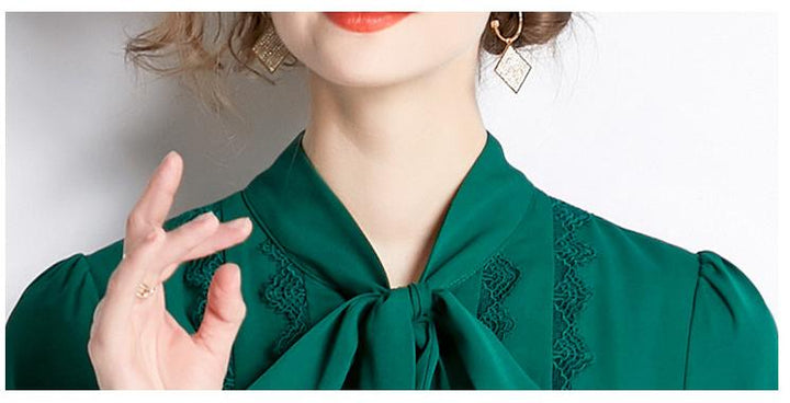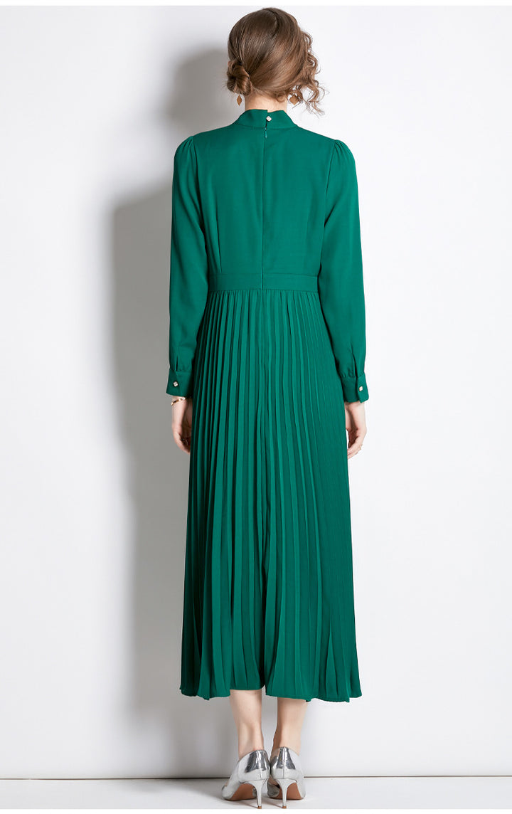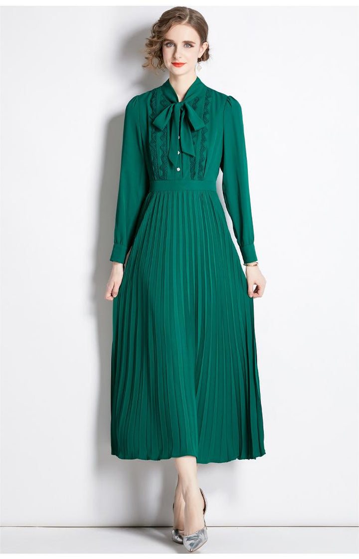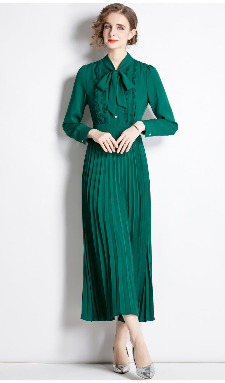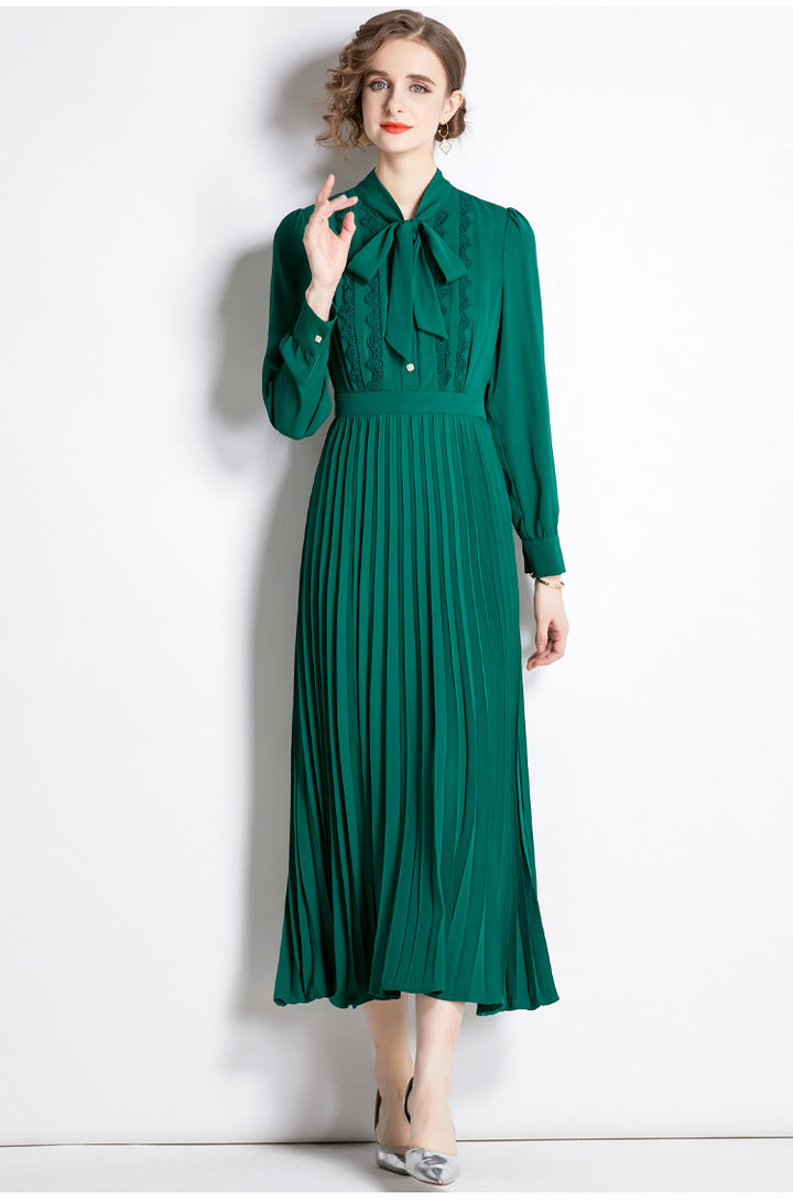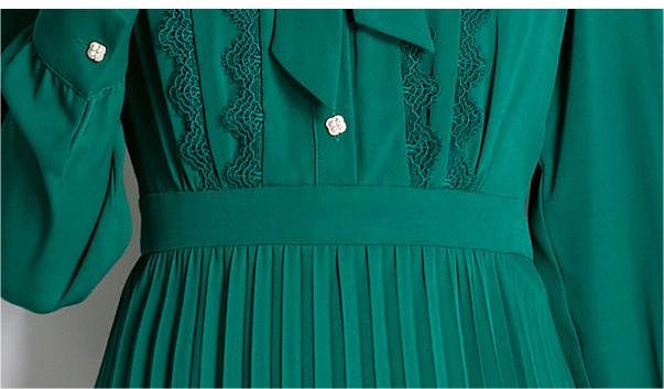 Long-Sleeved Water-Soluble Floral Patchwork Receiving Waist Pleated Long Skirt Dress