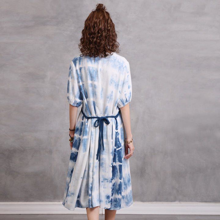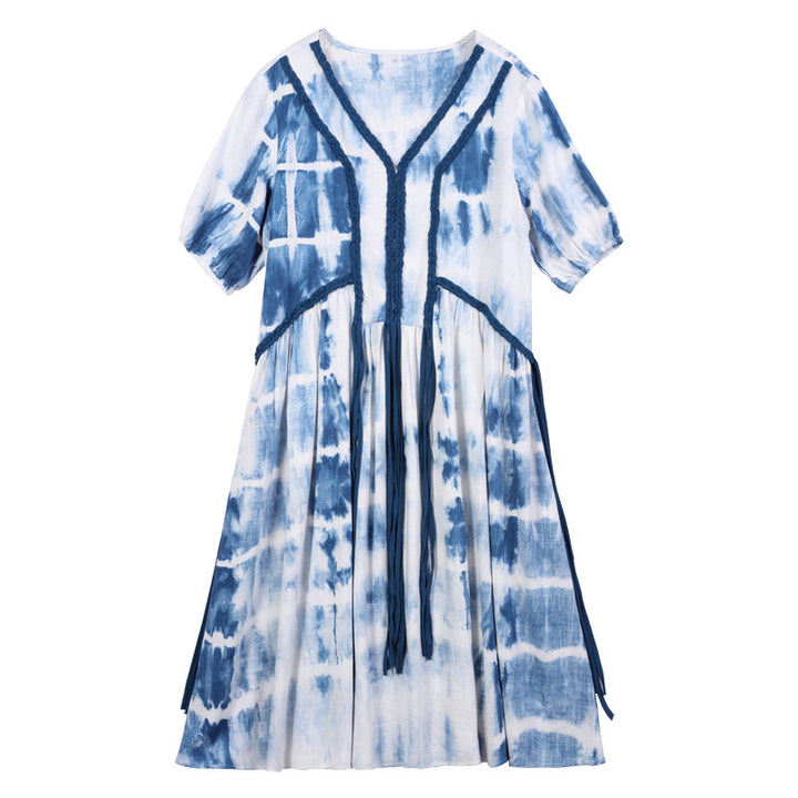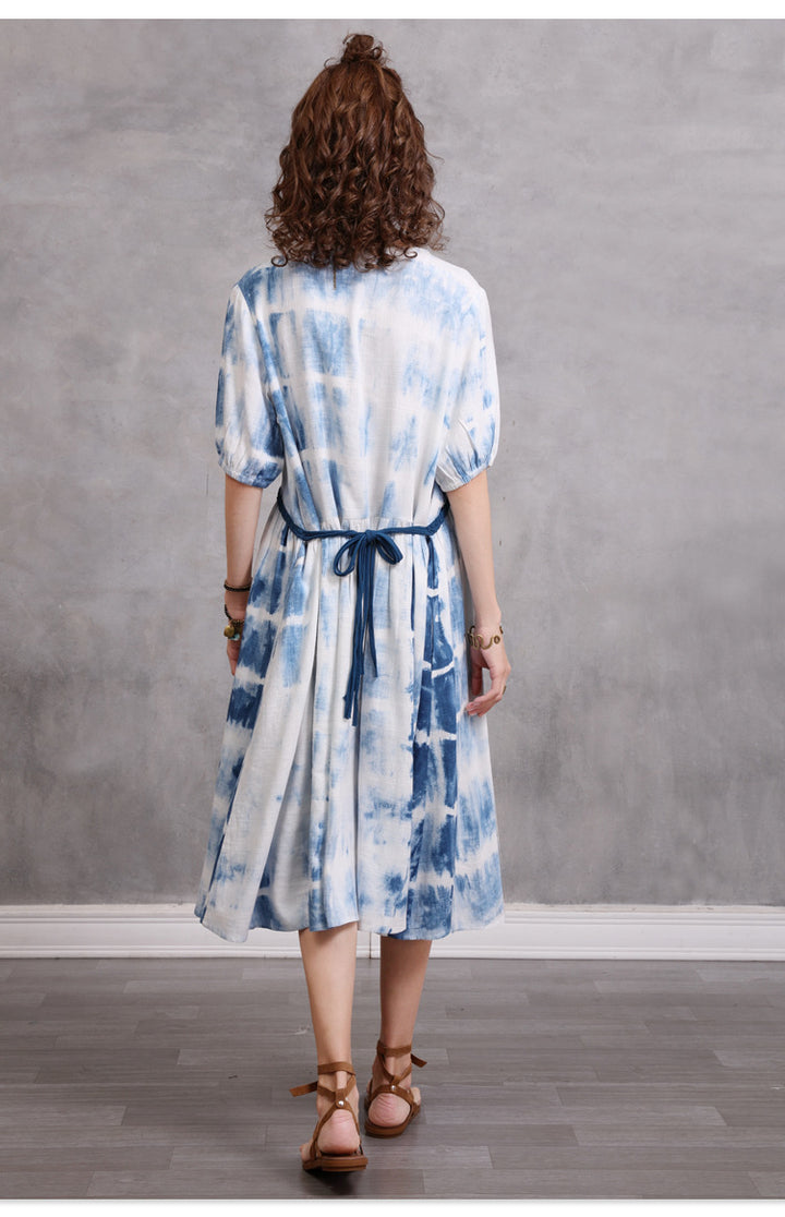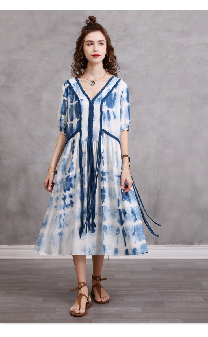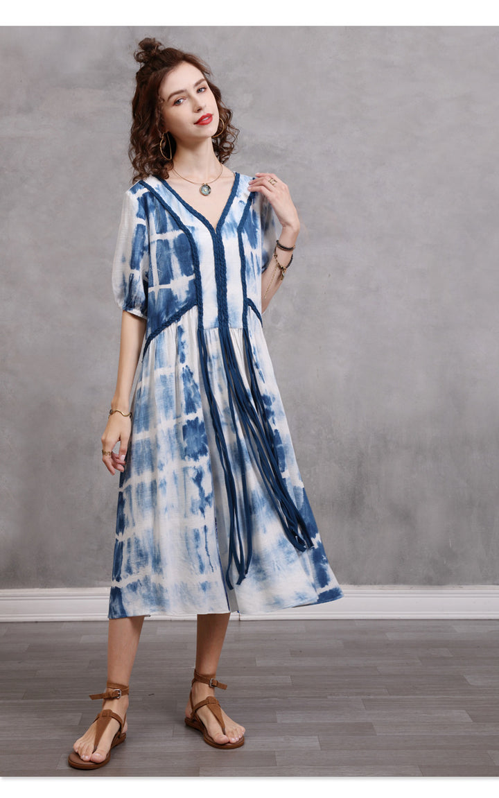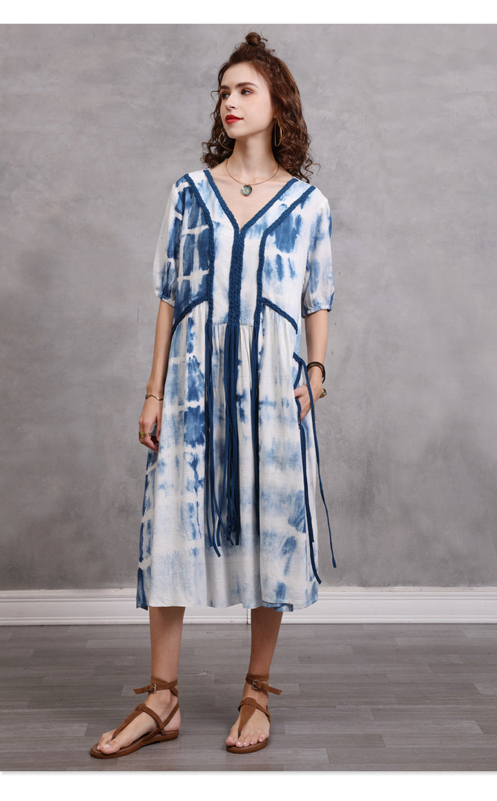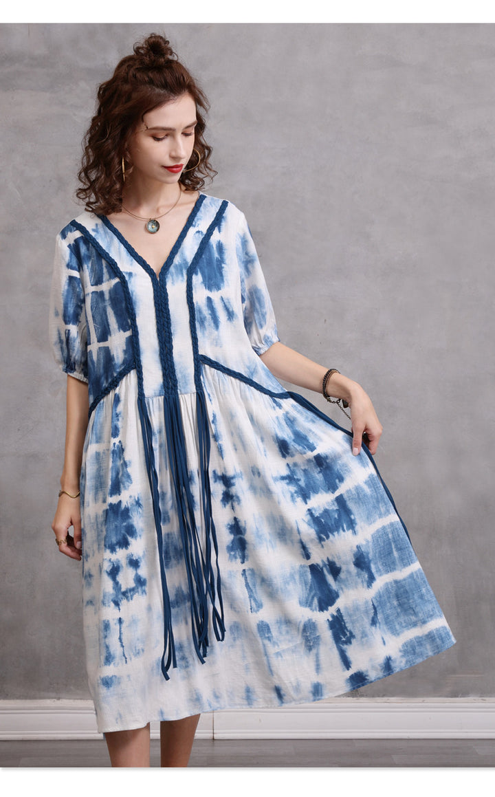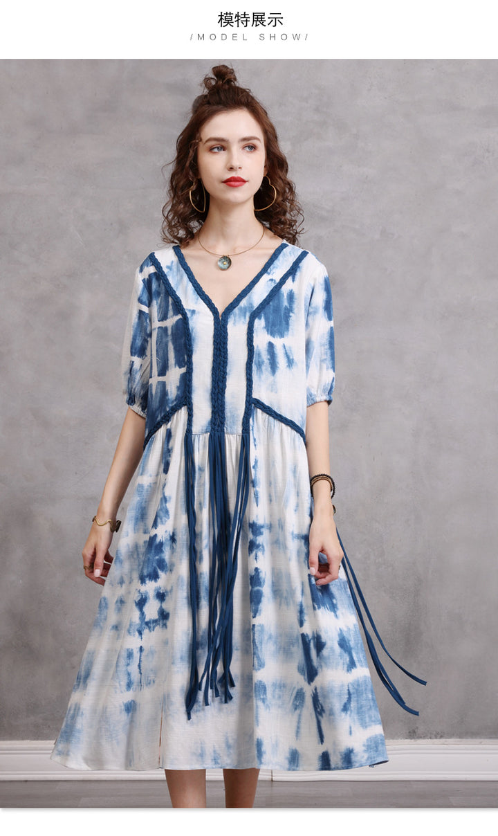 Loose Large Size Women's 2023 Summer New Braided Rope Tie-Dye MIDI Dress Elegant Cotton Hemp Dress