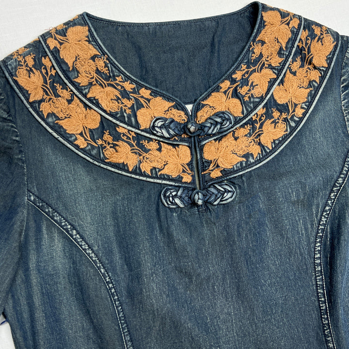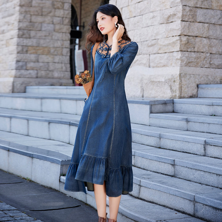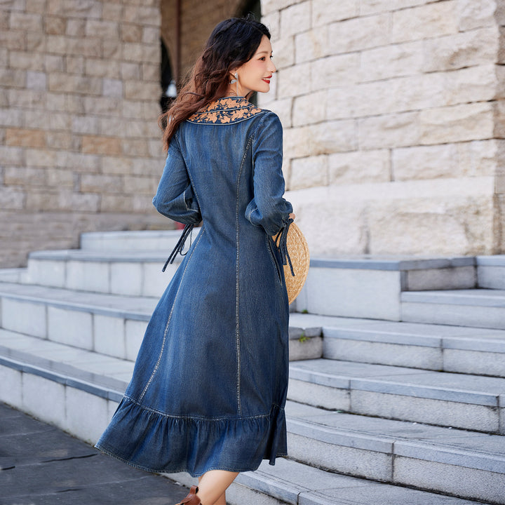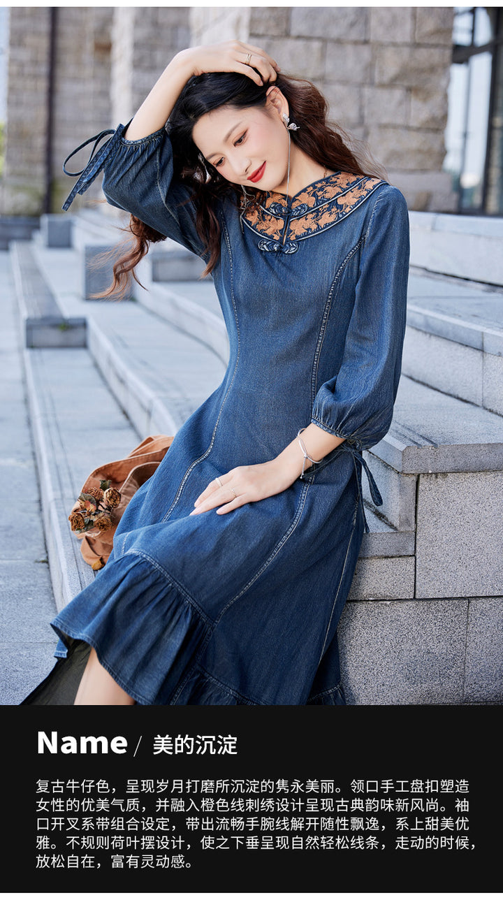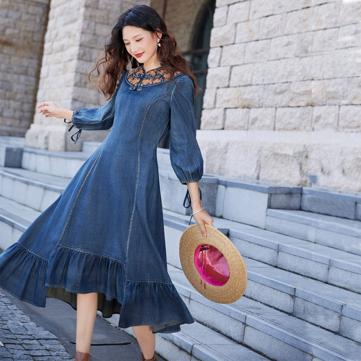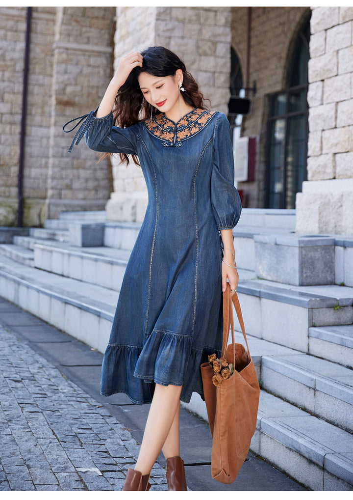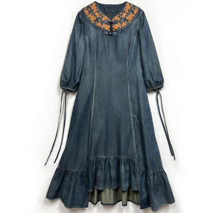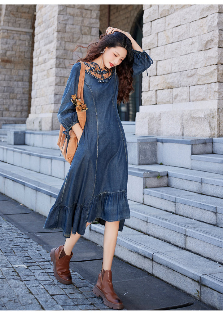 New Fishtail Denim Skirt Embroidery Ethnic Style Handmade Coil Button Dress