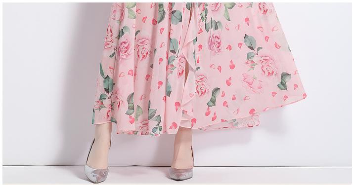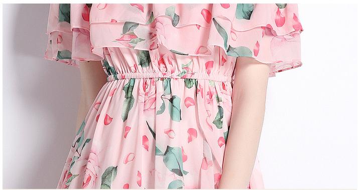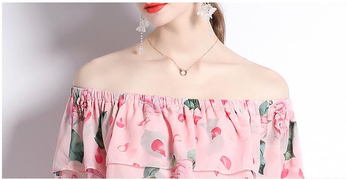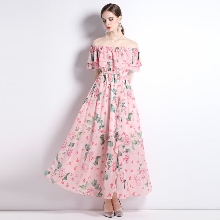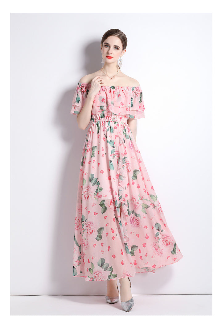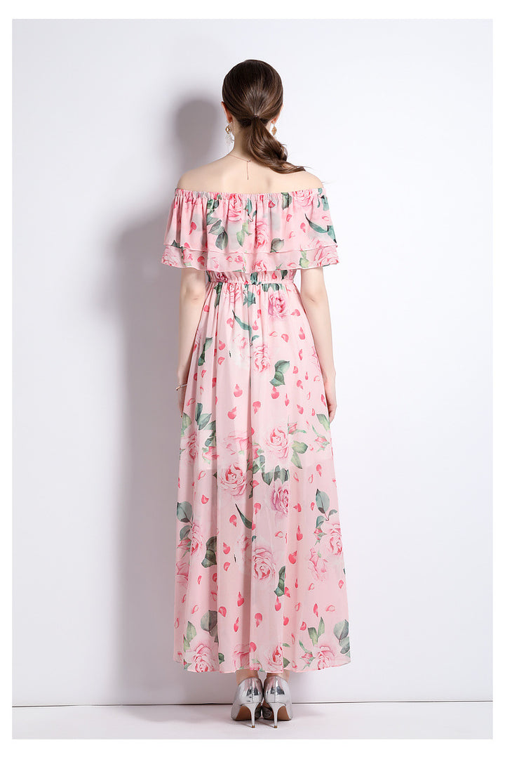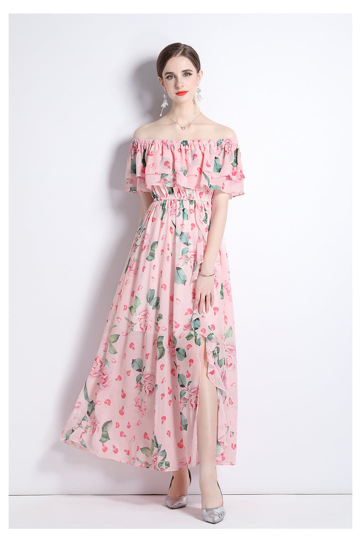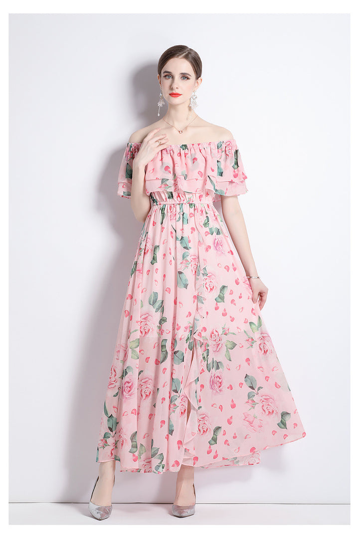 Peplum One-Line Neck Beach Skirt Slit Chiffon Large Hemline Long Skirt Dress