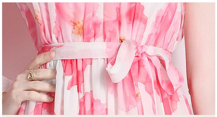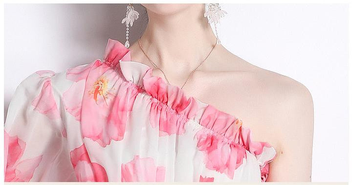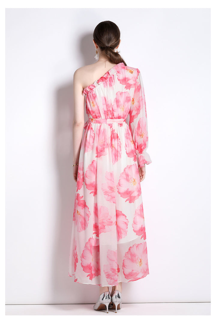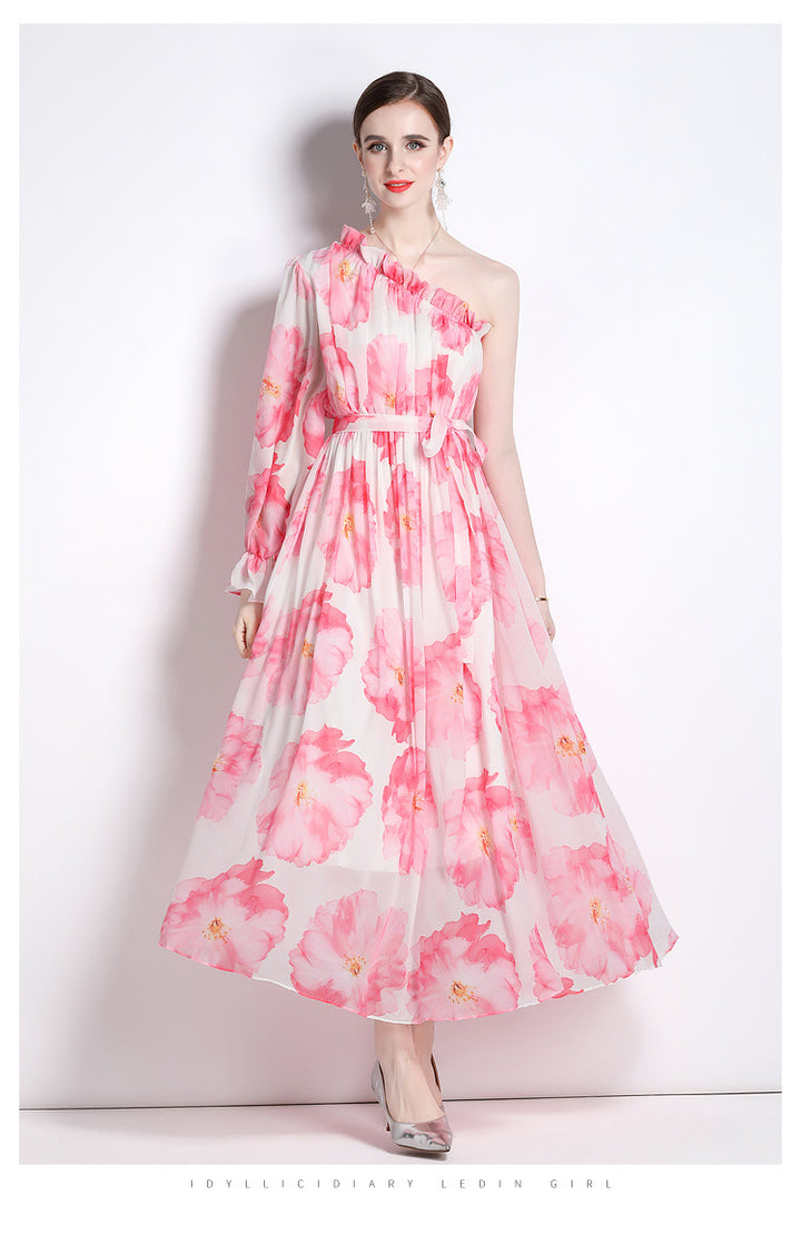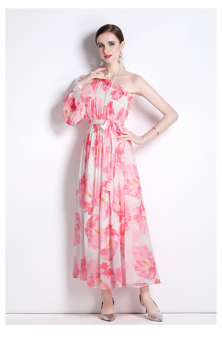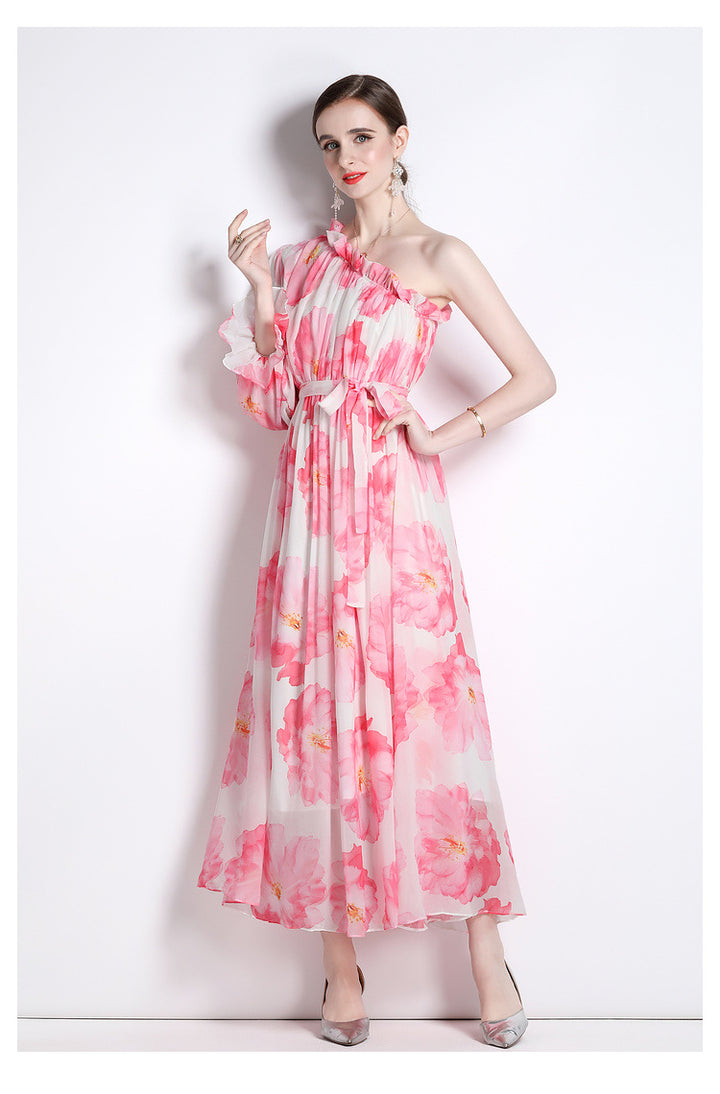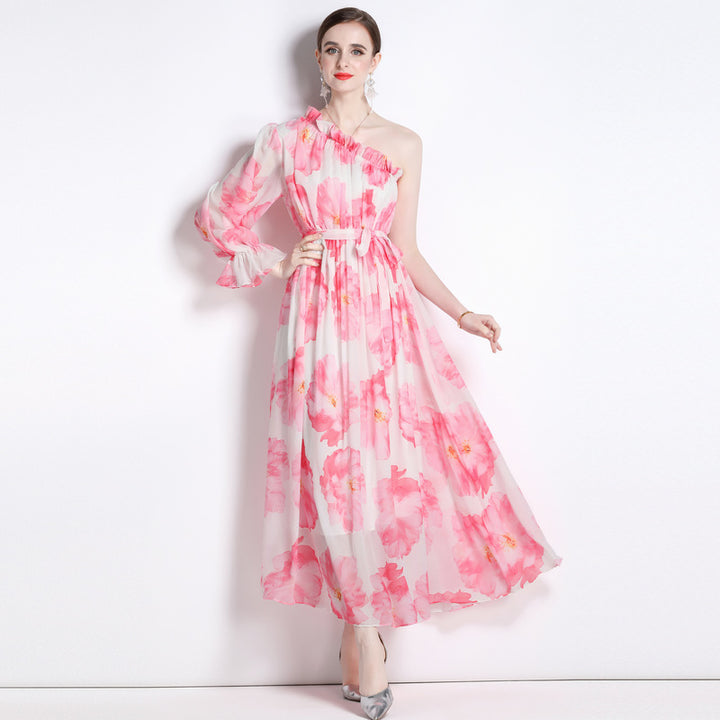 Printed Dress Chiffon Diagonal Shoulder Beach Skirt Seaside Holiday Maxi Skirt