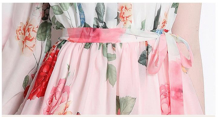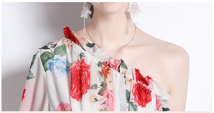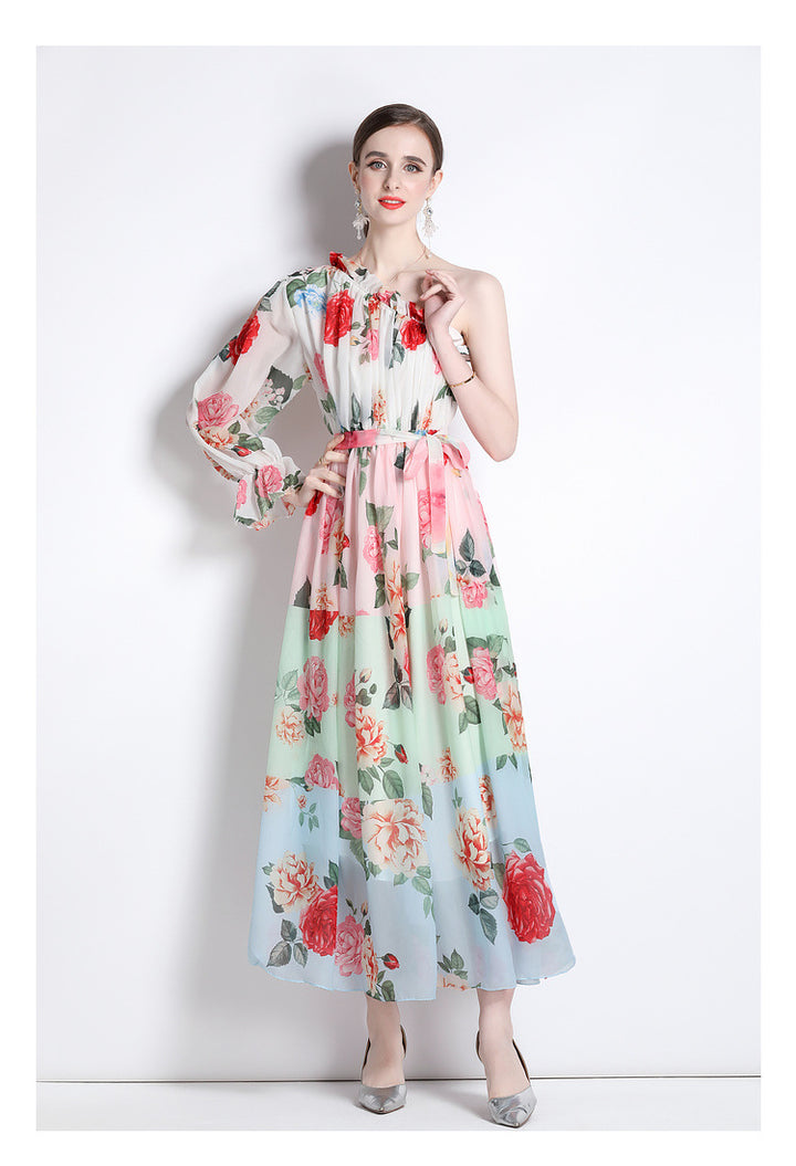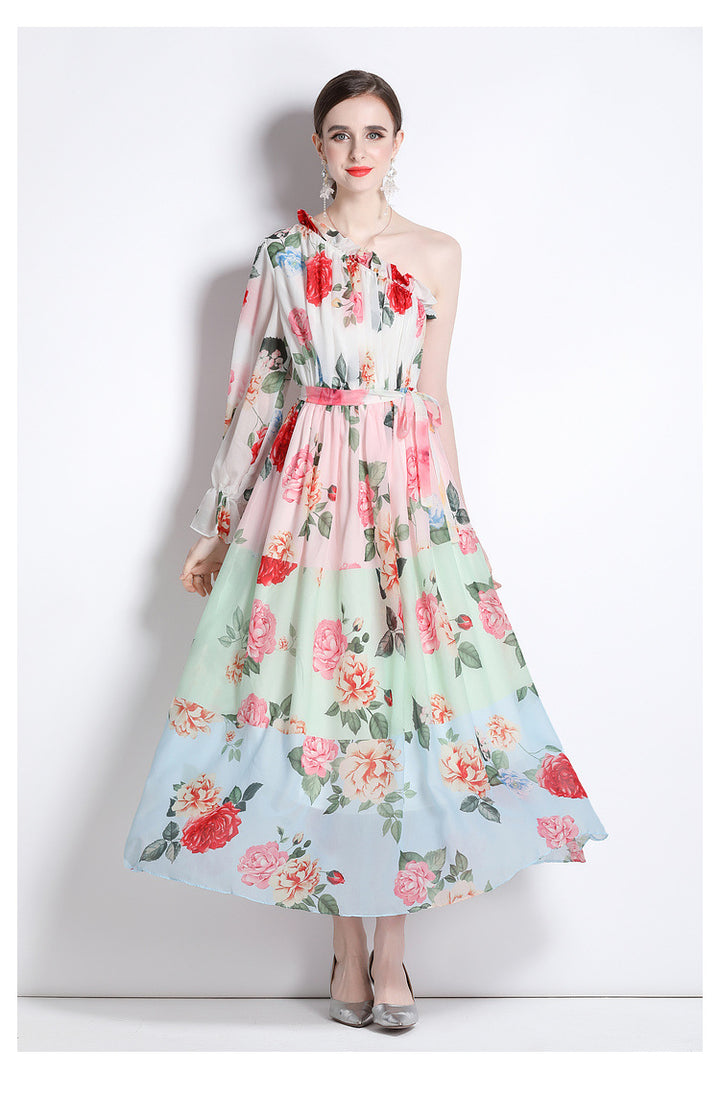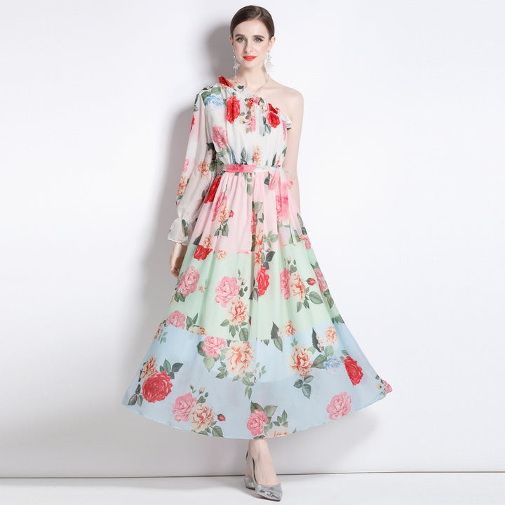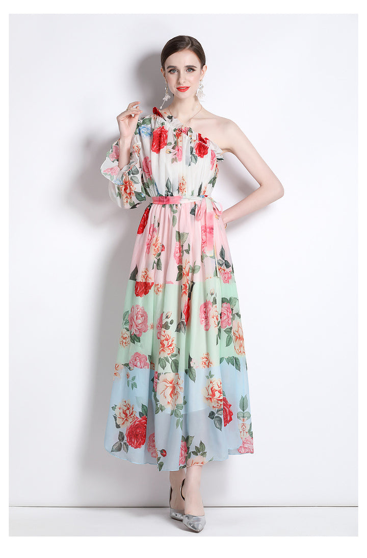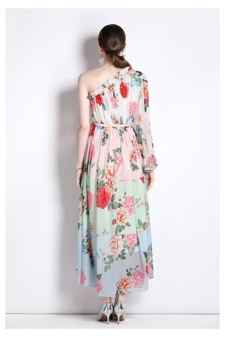 Printed Dress Chiffon Diagonal Shoulder Beach Skirt Seaside Holiday Maxi Skirt