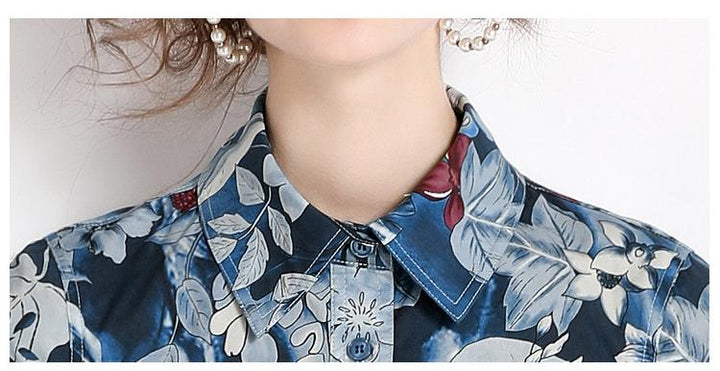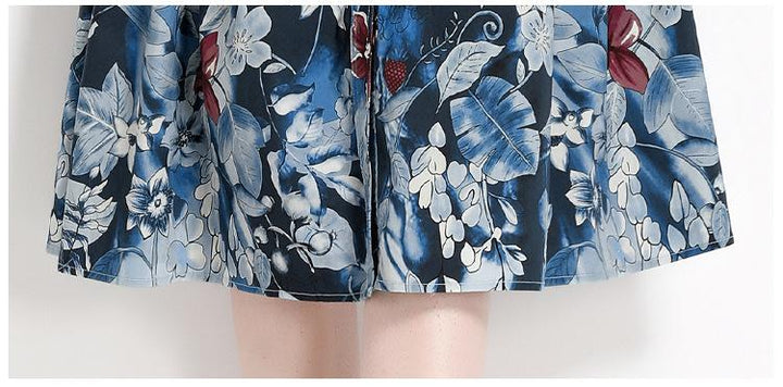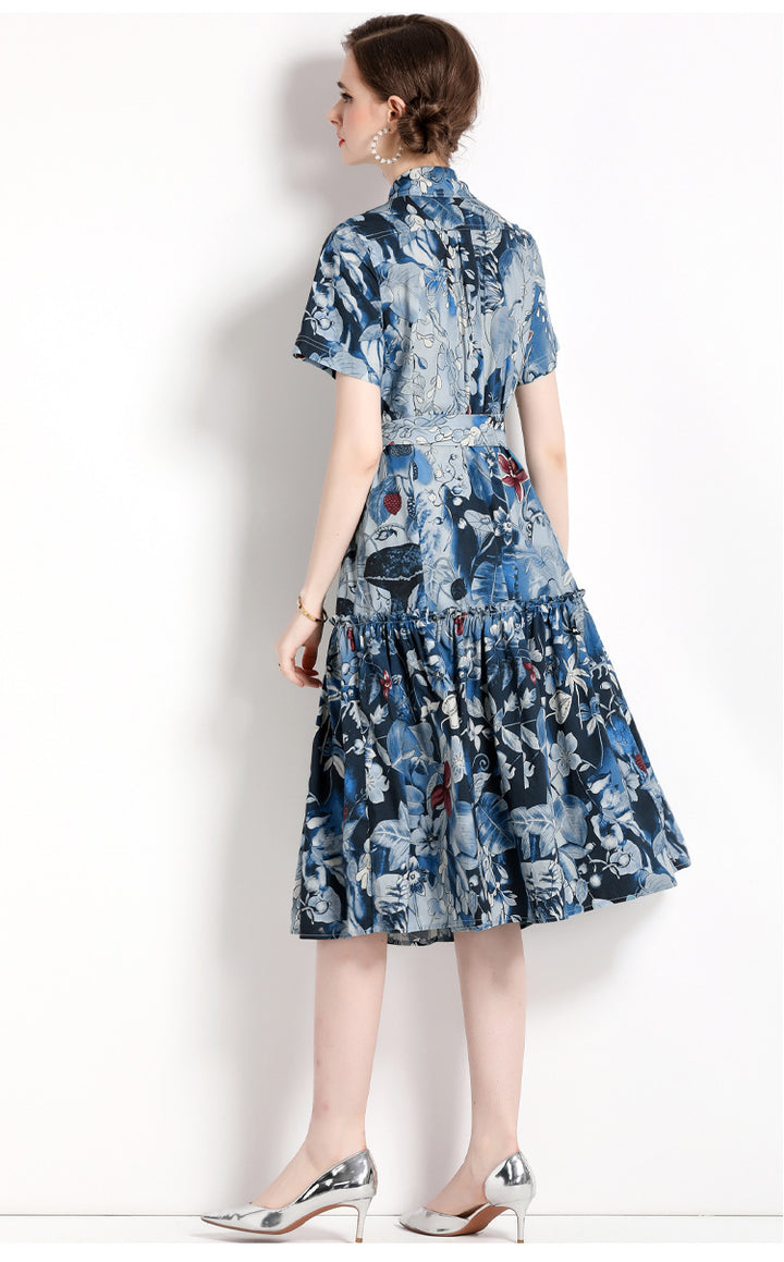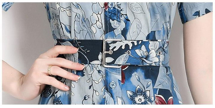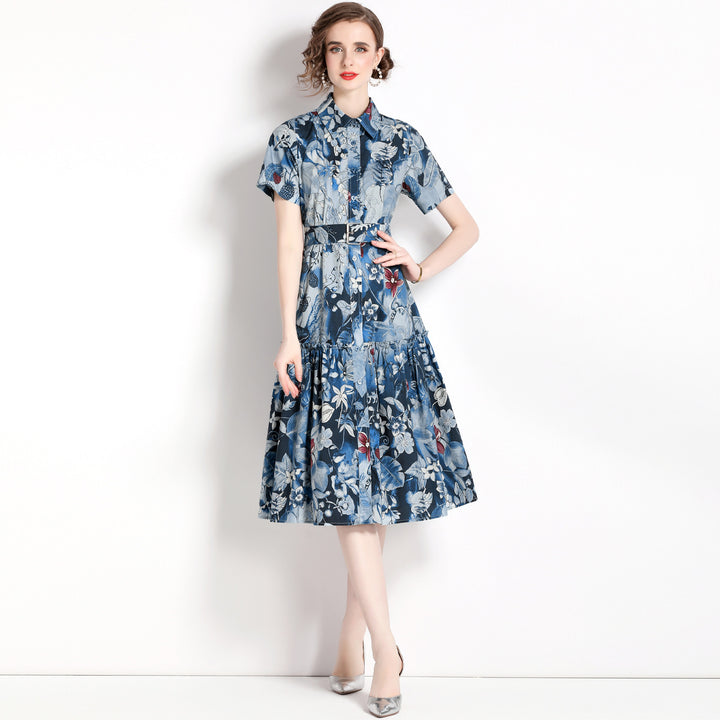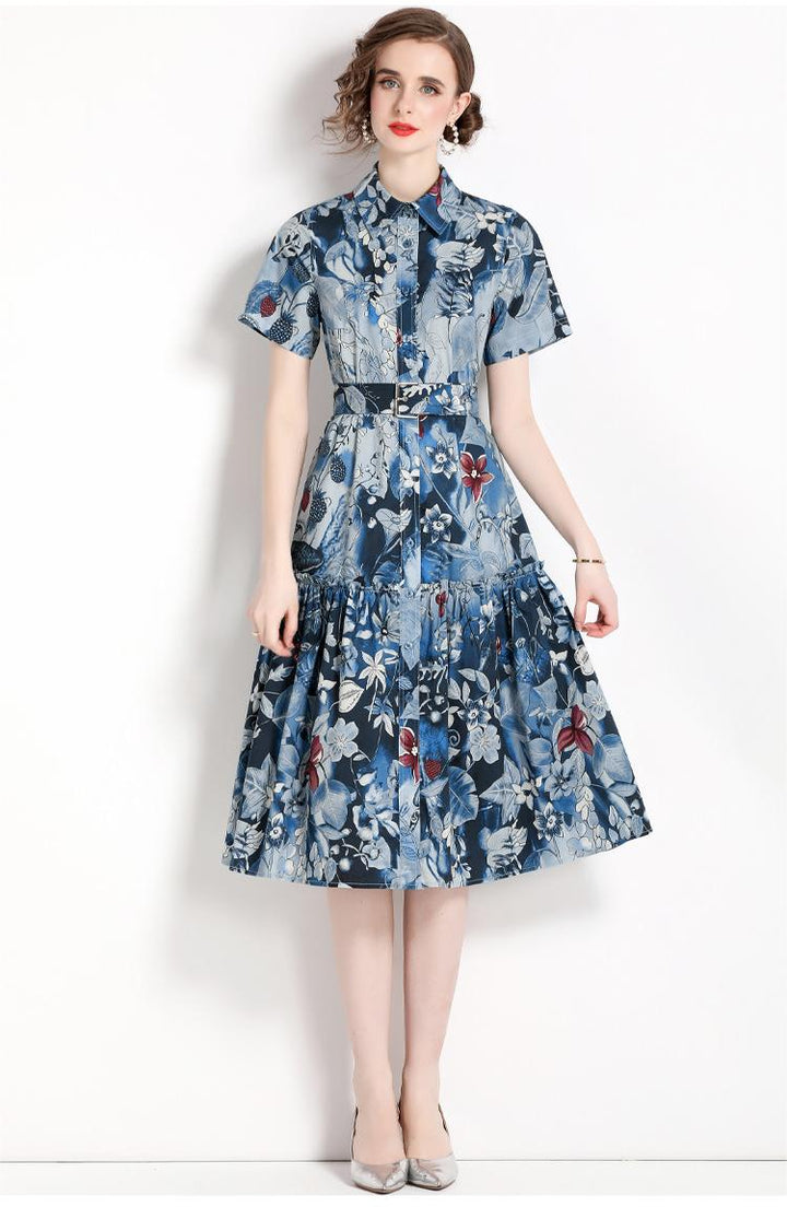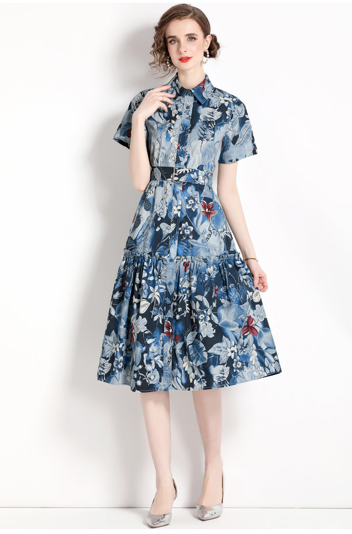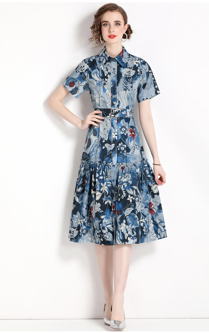 Printed Lapel Short Sleeve Waist Slimming Mid-Length Dress