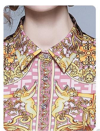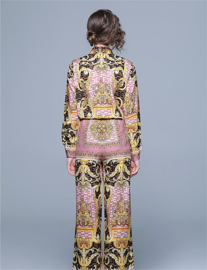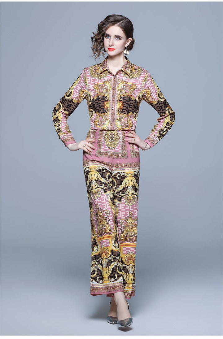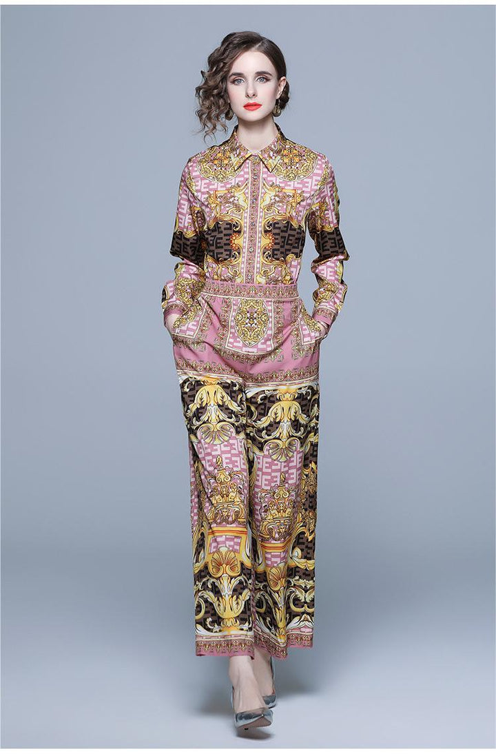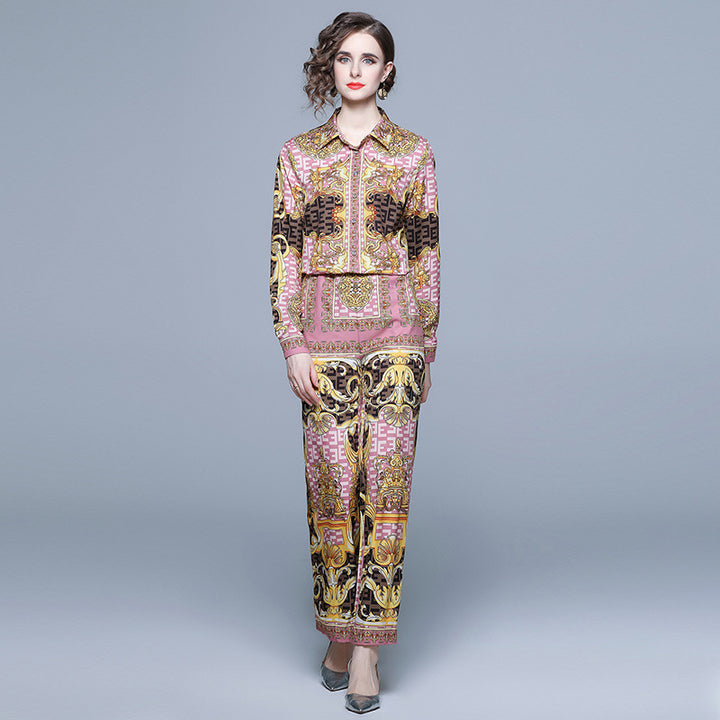 Printed Long-Sleeved Shirt Wide-Leg Pants Suit Women's Two-Piece Autumn Clothes New