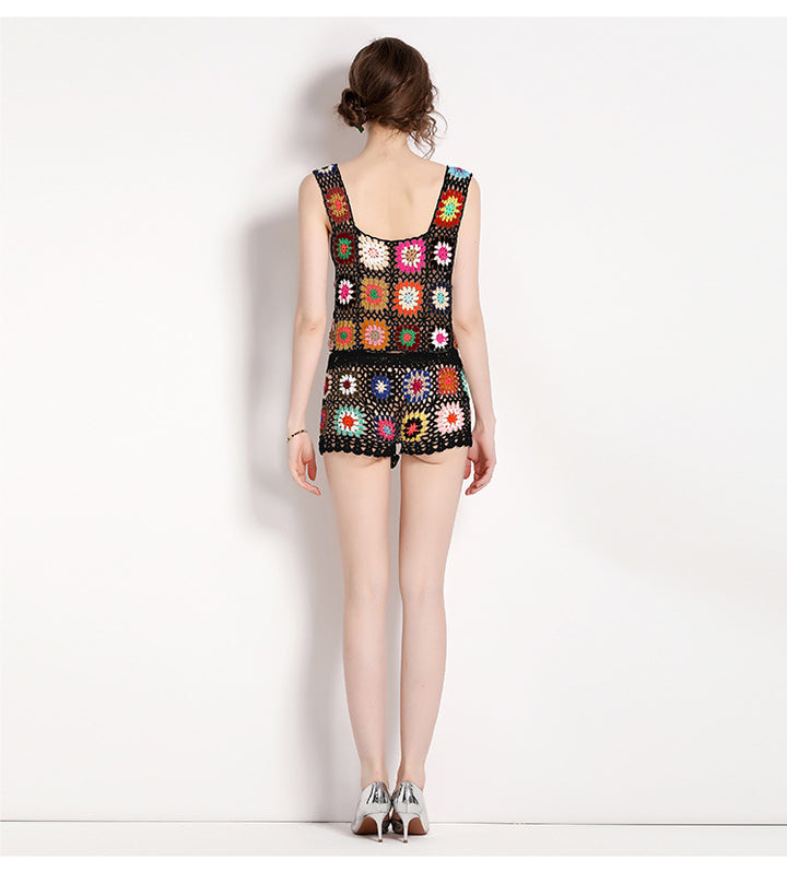 Resort Beach Wind Hand Hook Hollowed Out Vest and Shorts Two Piece Suit