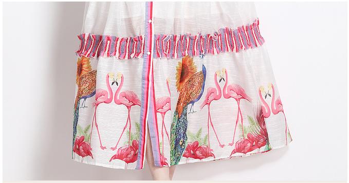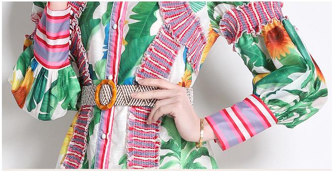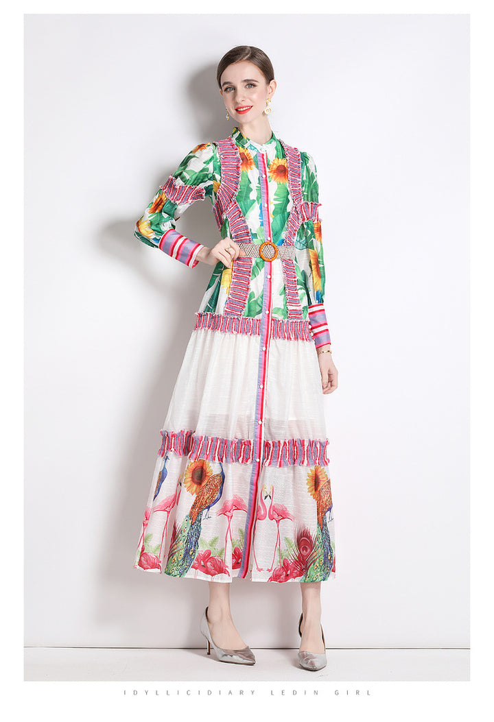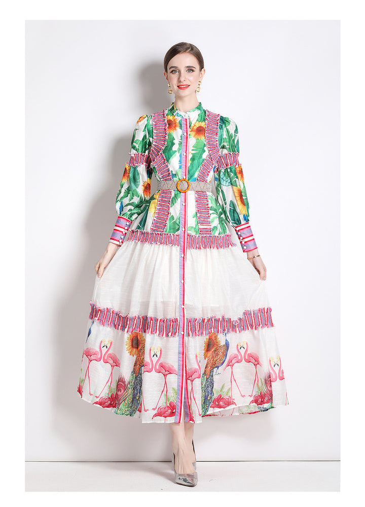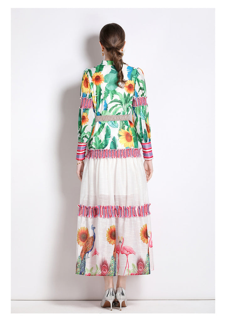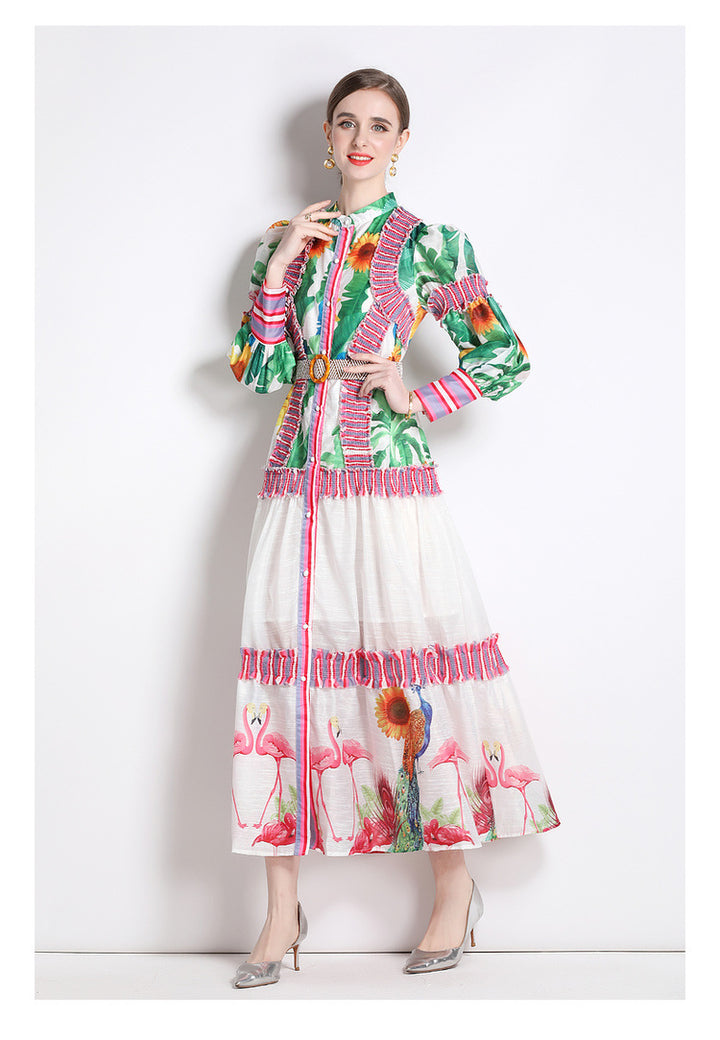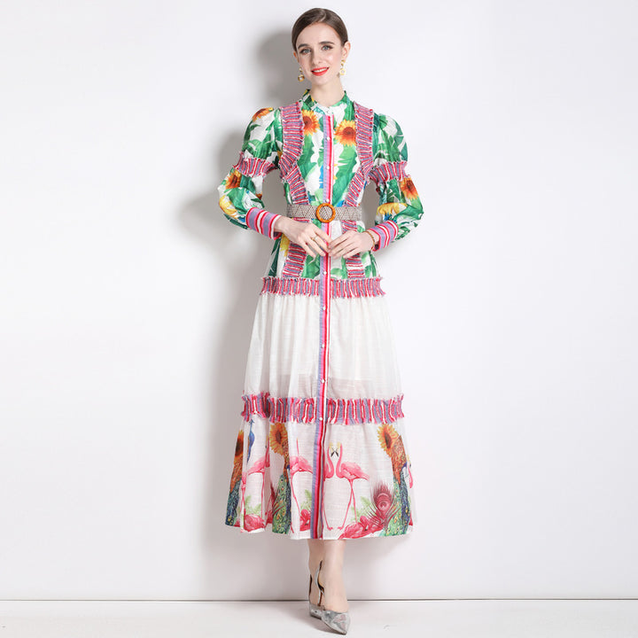 Resort Style Print Long Skirt Retro Fashion Sweet Lantern Sleeve Color Bump Stand Collar Dress