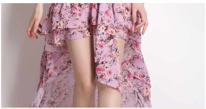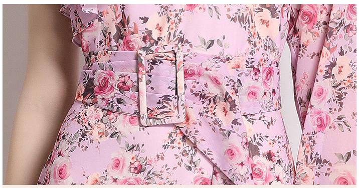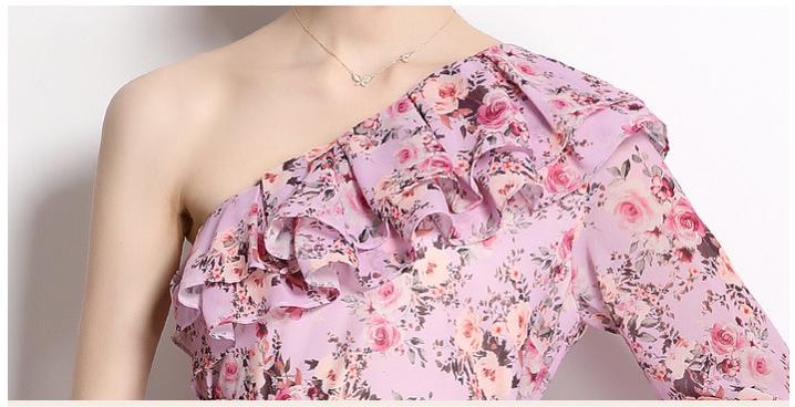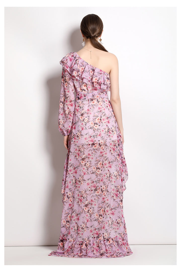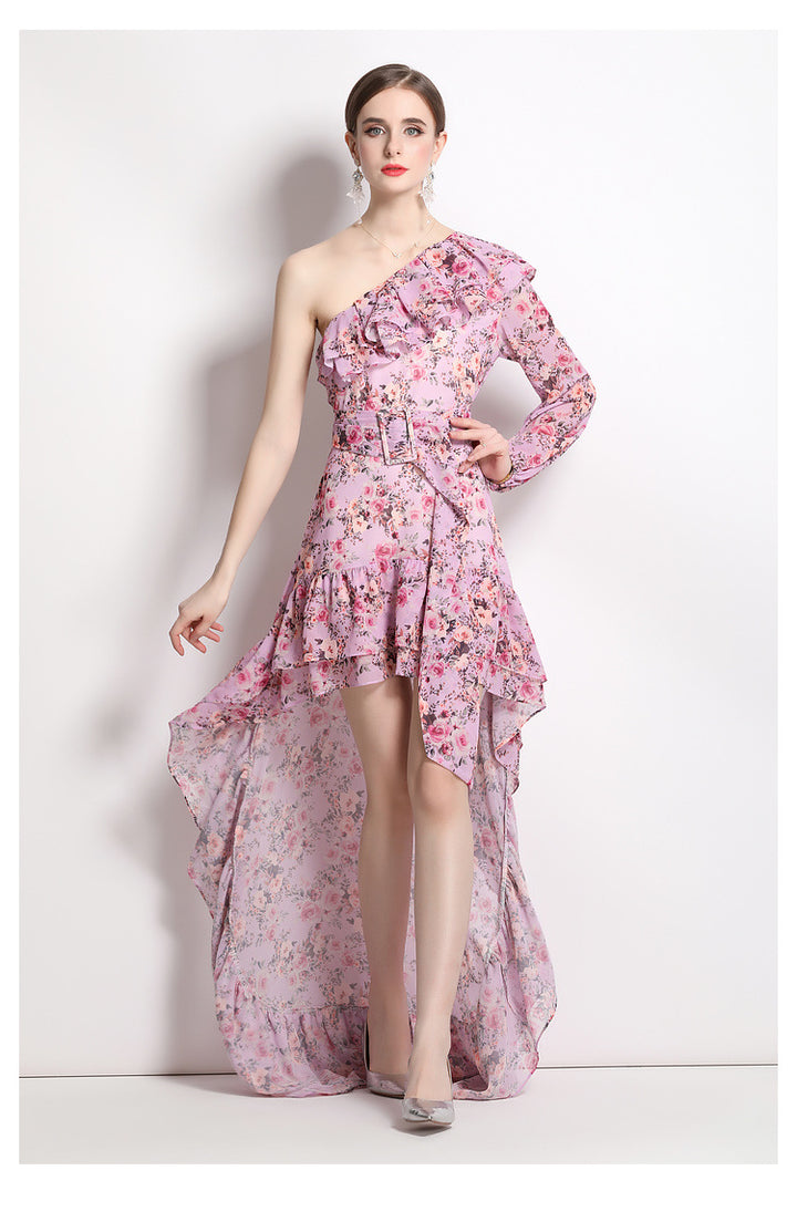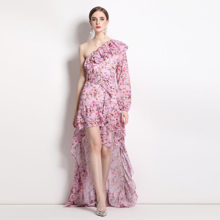Resort Style Printed Temperament Oblique Shoulder Irregular Long-Sleeved Lotus Leaf Dress