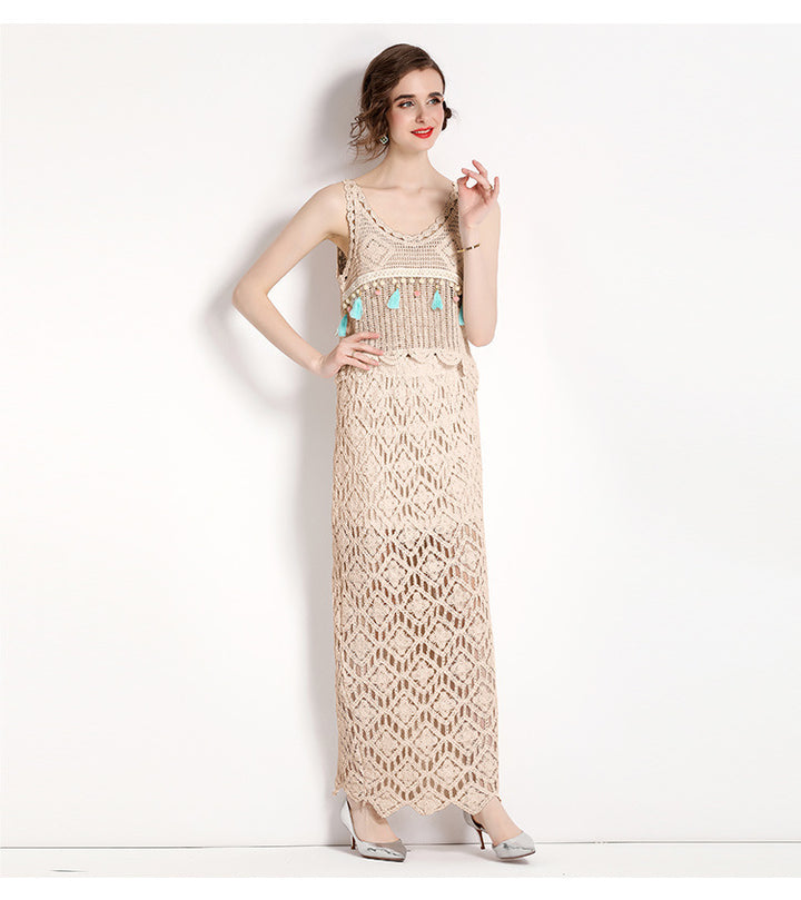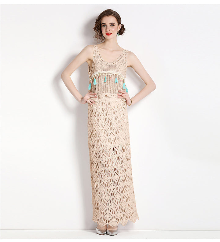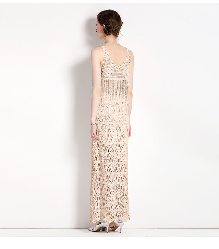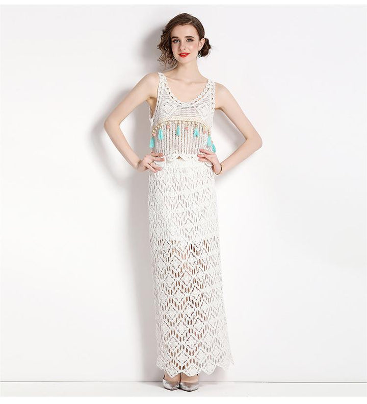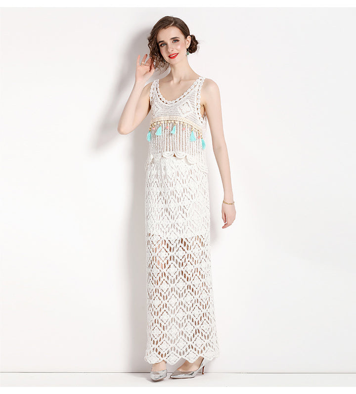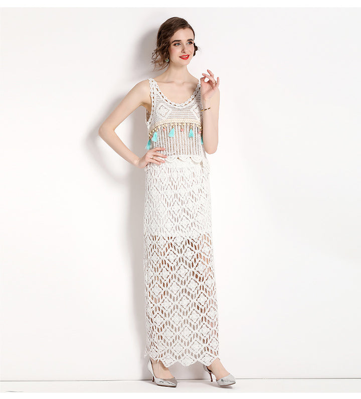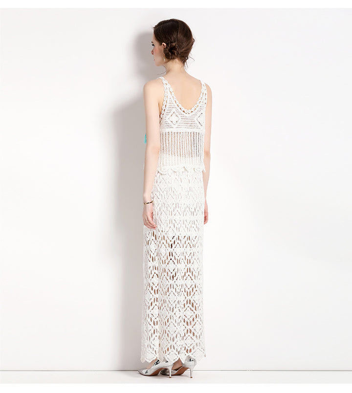 Resort Wind Hook Flower Embroidery Hollowed Out Vest Top and Long Half Skirt Two-Piece Set