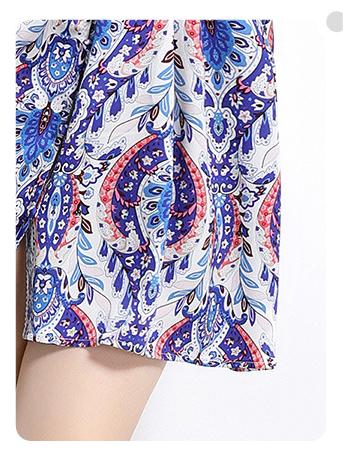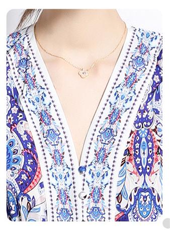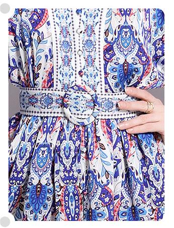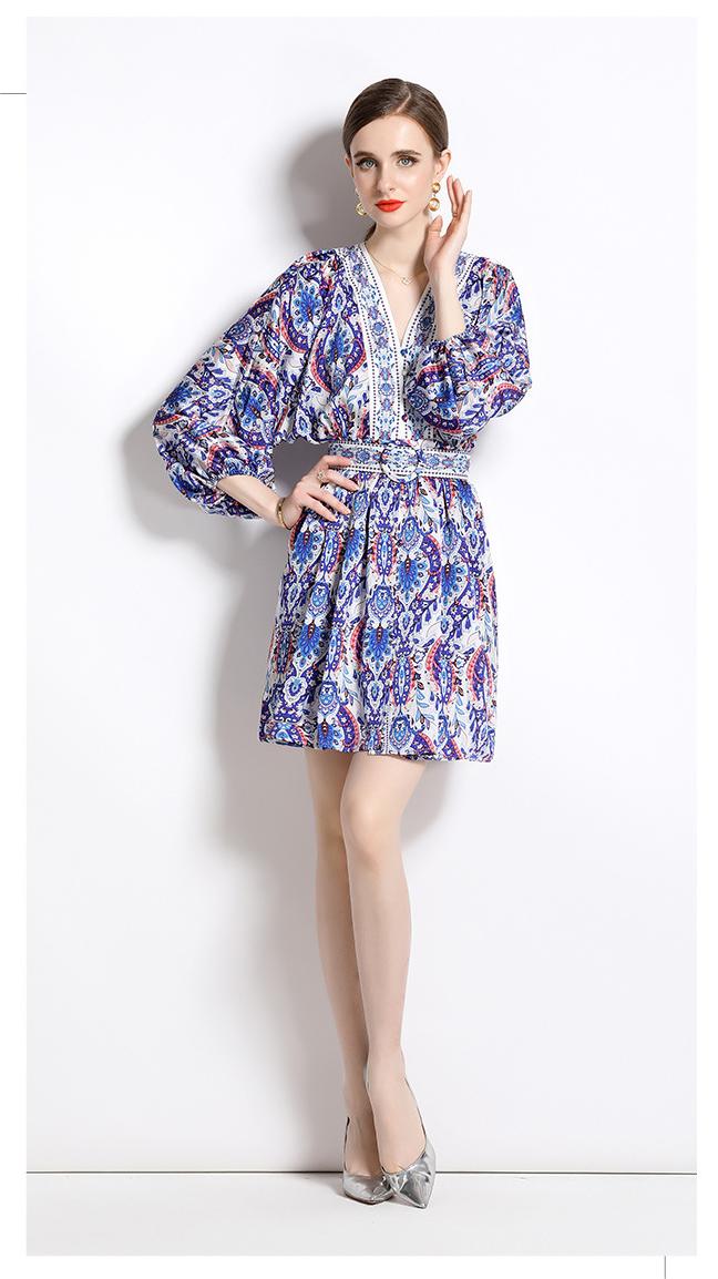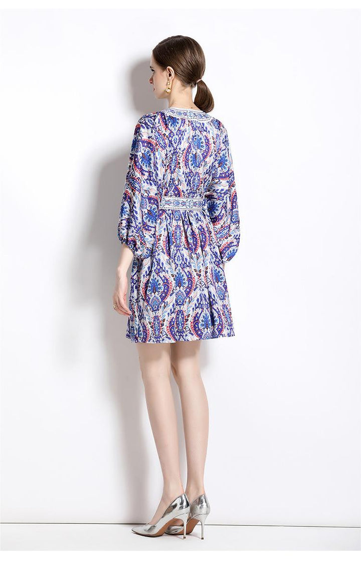 Retro Fashion National Style Printed V-Neck Long Sleeve Waist Closed Skirt Dress