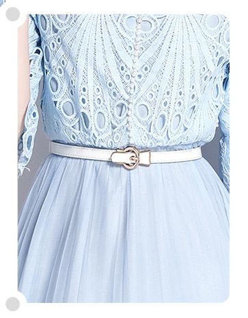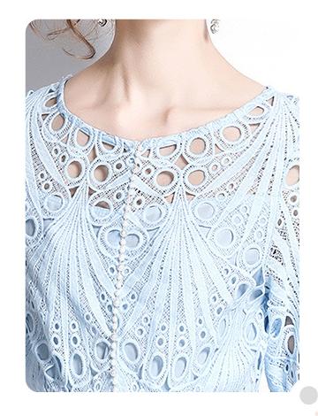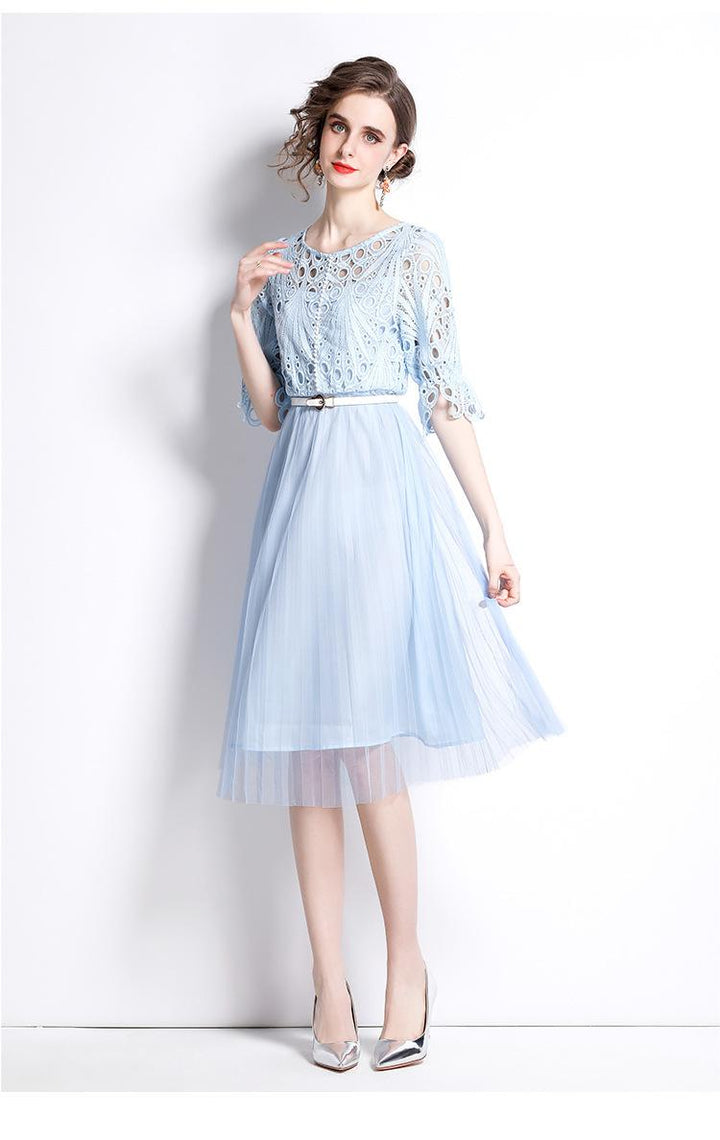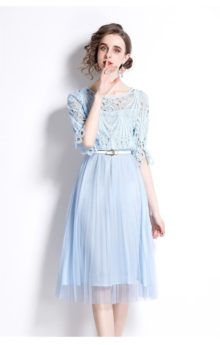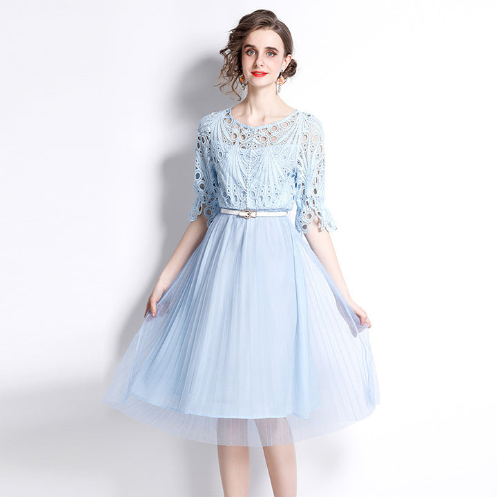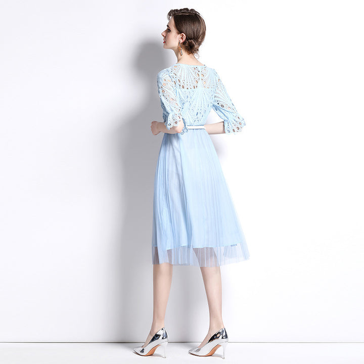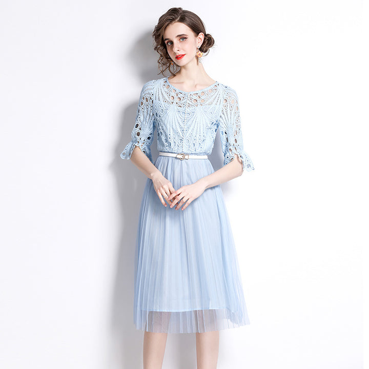 Round Collar Water-Soluble Lace Mesh Stitching MIDI Dress Fashion Temperament