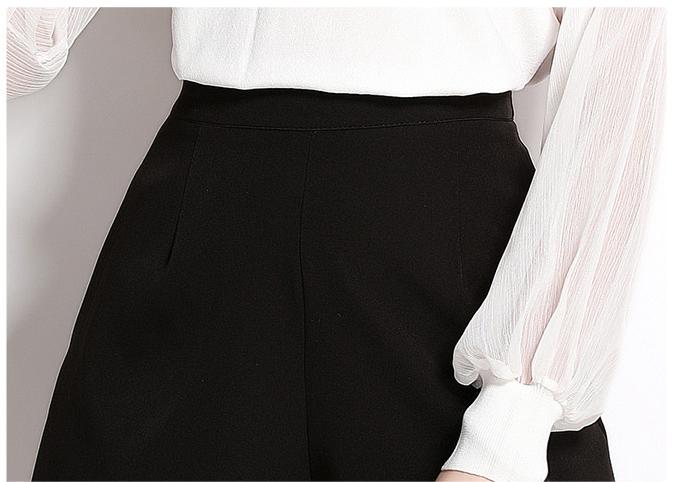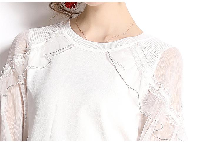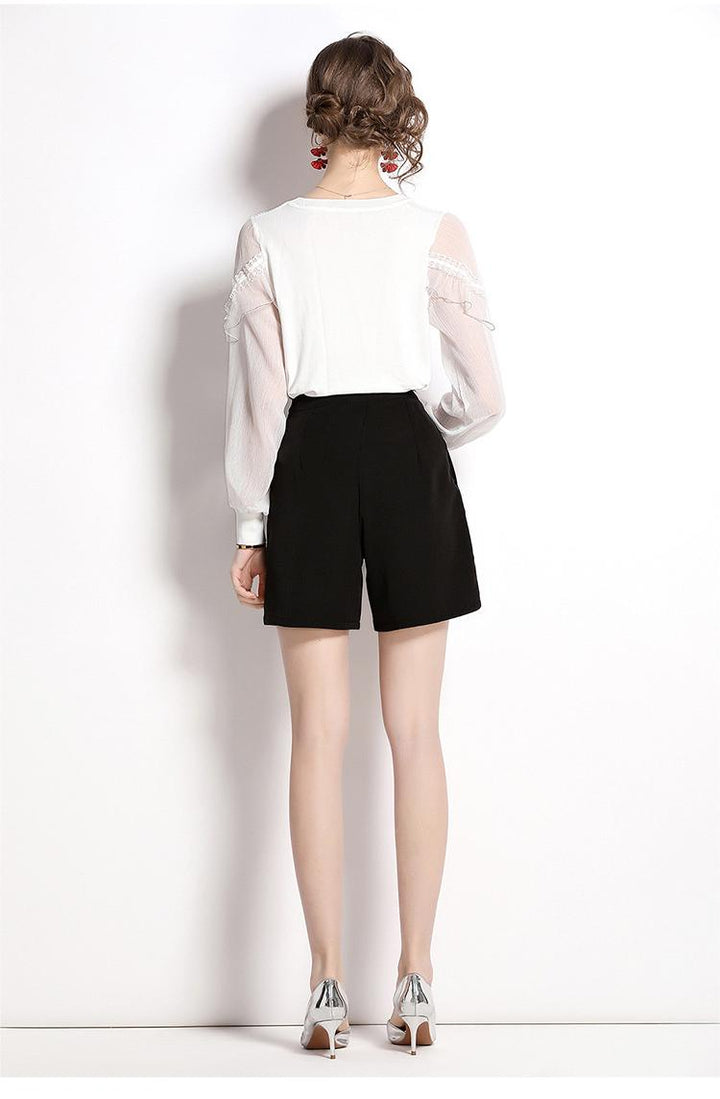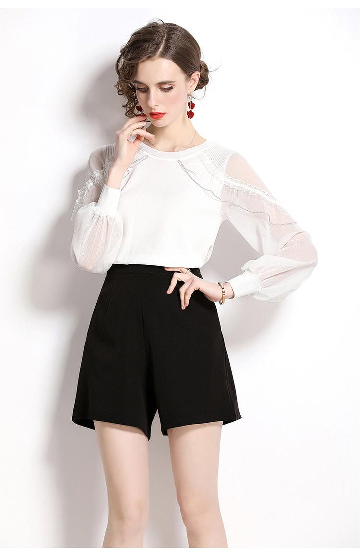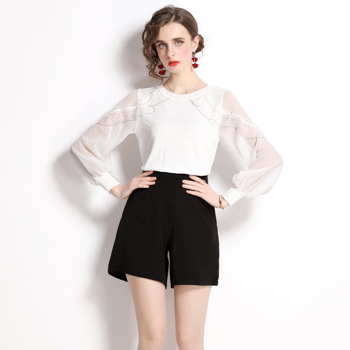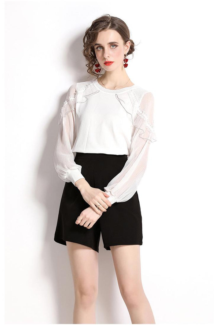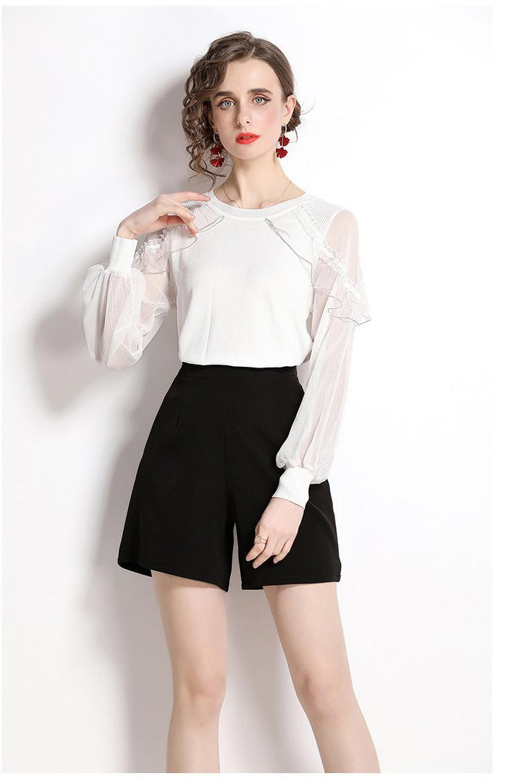 Ruffled Stitching Lantern Sleeves Hollowed Out Crew Neck Knitted to Show Thin Top and Black Shorts